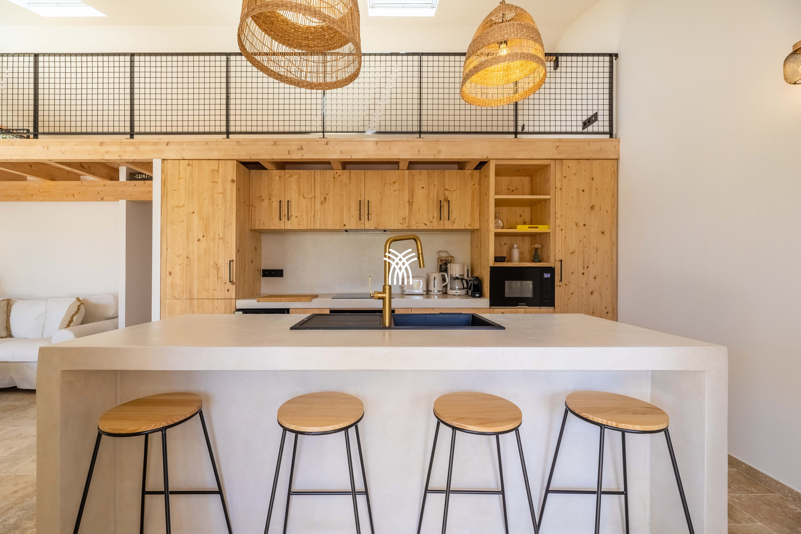 La pièce de vie, généreusement ouverte sur l’extérieur, offre un salon chaleureux prolongé par une grande terrasse ombragée où l’on partage volontiers petits-déjeuners tranquilles et dîners sous les étoiles. La cuisine haut de gamme, parfaitement équipée avec cave à vin, piano de cuisson, grand réfrigérateur-congélateur, micro-ondes, lave-vaisselle et machine à café, répond aux exigences des plus fins gourmets.