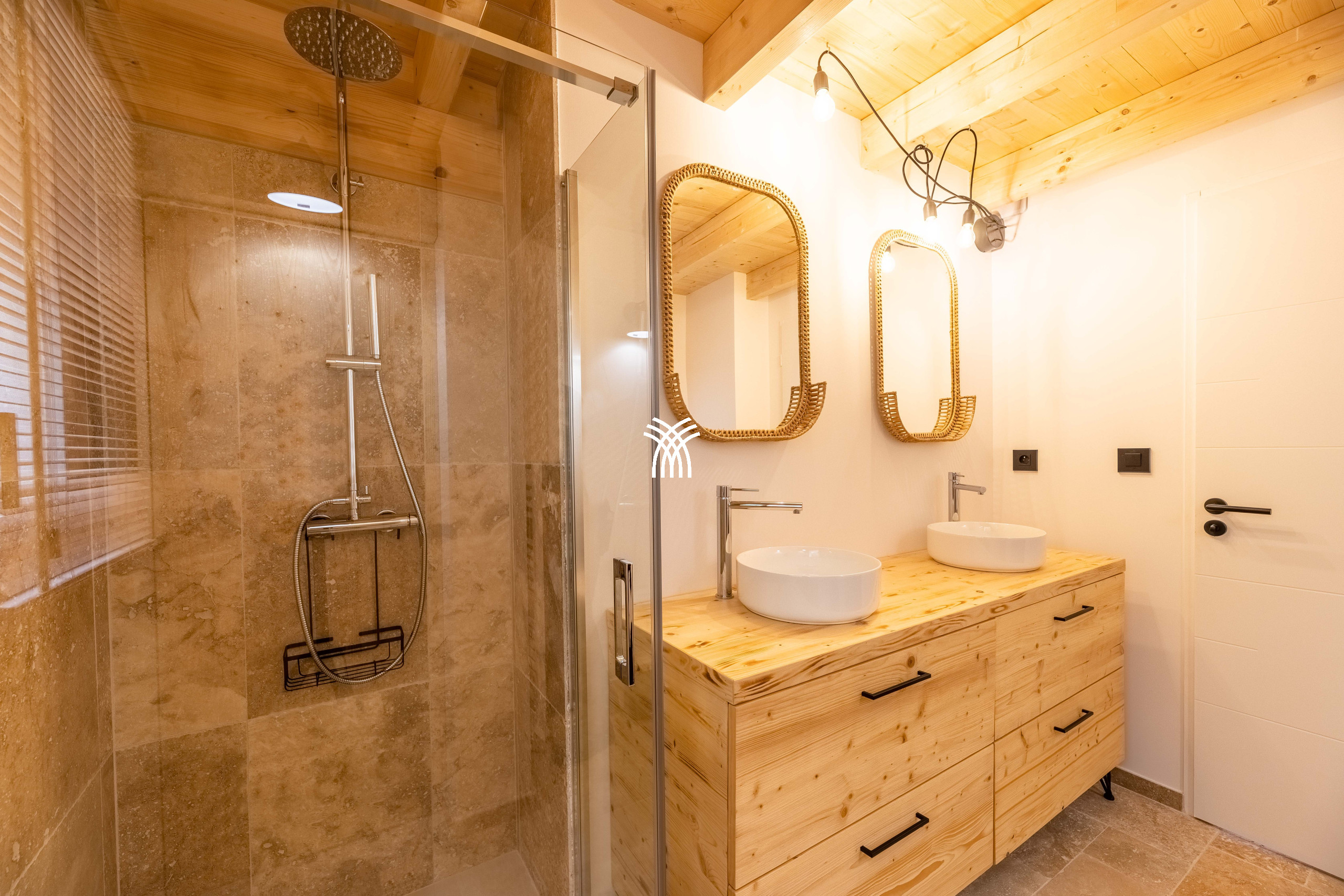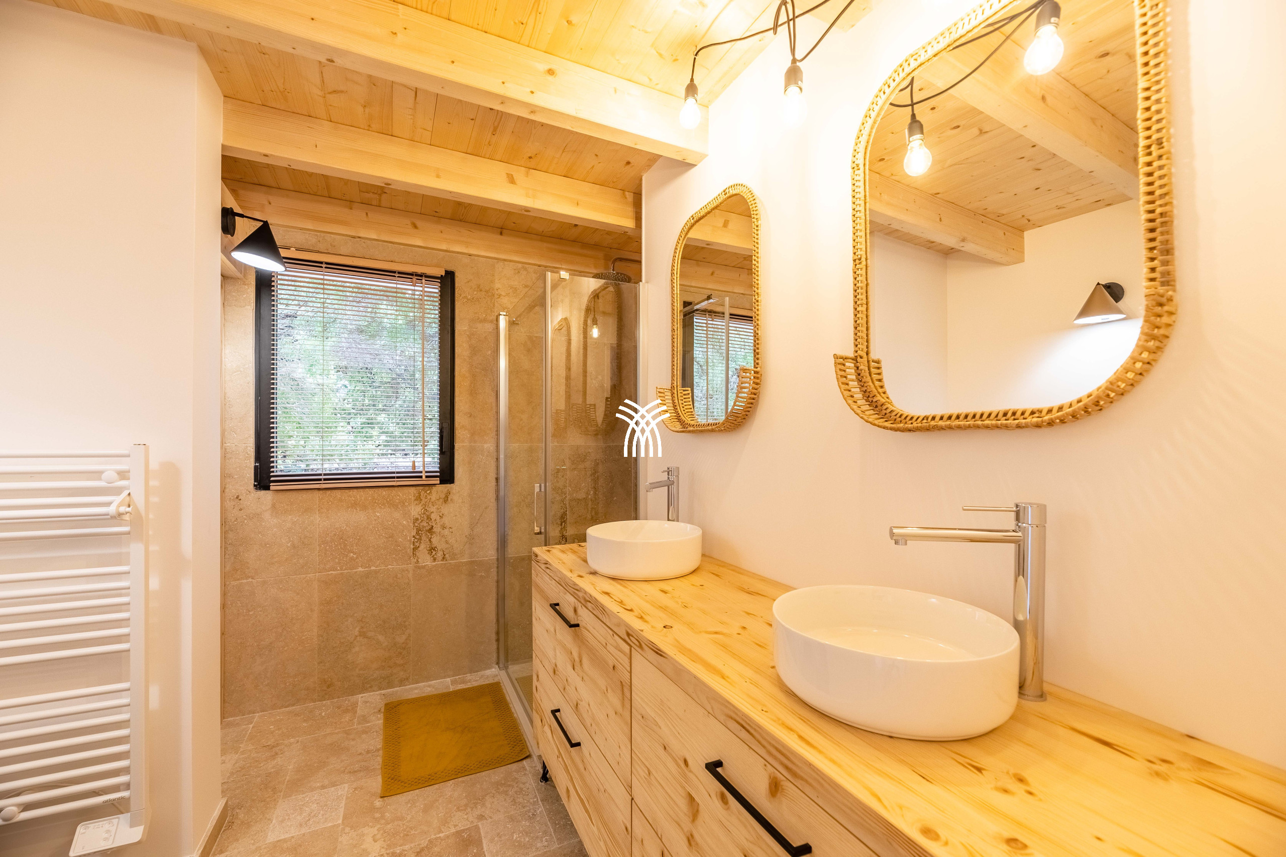 La salle de bain mêle élégance et confort avec sa douche à l’italienne, sa baignoire design et ses toilettes séparées. À l’extérieur, une douche supplémentaire, une plancha et un terrain de pétanque privatif viennent parfaire l’expérience estivale. La climatisation réversible, le parking privatif, la télévision et l’accès à un terrain de tennis situé à 150 mètres dans le domaine complètent les prestations de standing.