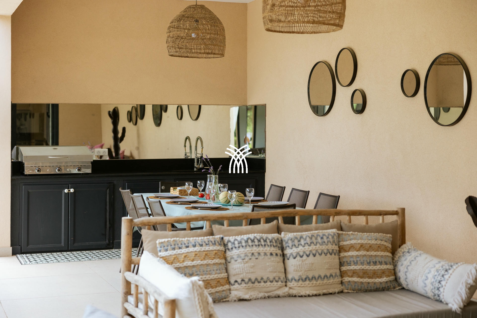 Les 5 chambres, chacune avec sa salle de bain privative, garantissent confort et intimité à chaque invité. Une buanderie et un garage viennent compléter les équipements, tandis que la climatisation, le wifi et un système de sécurité assurent un séjour en toute tranquillité.