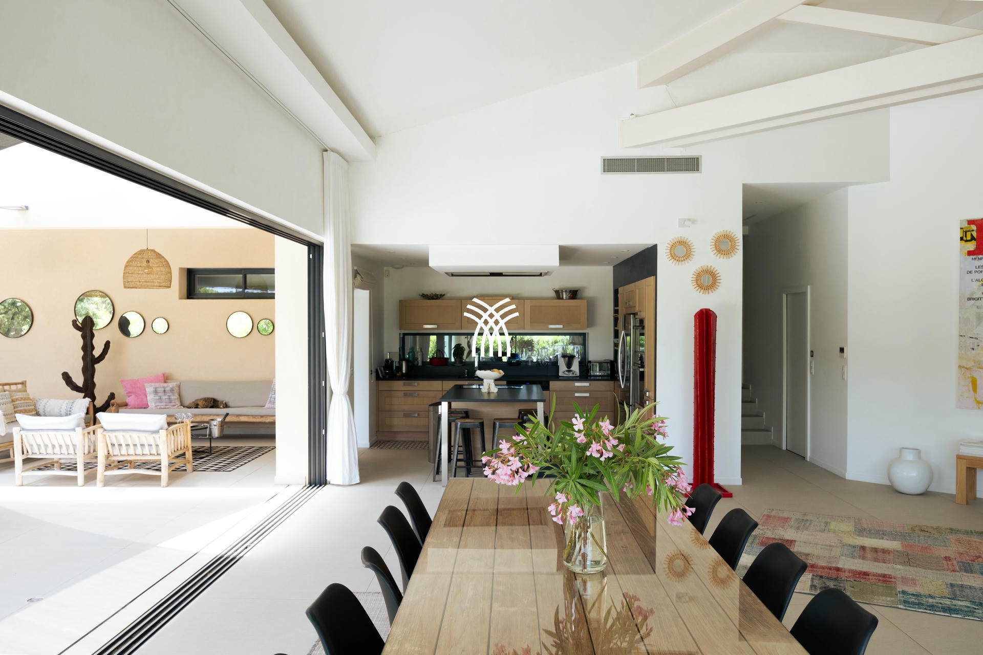 L’extérieur est pensé pour des moments de partage et de détente : une piscine chauffée de 10x5m entourée d’une grande terrasse, une cuisine d’été équipée d’une plancha et un terrain de pétanque pour profiter pleinement du cadre ensoleillé. À l’intérieur, le salon lumineux avec cheminée s’ouvre sur l’espace extérieur, prolongeant la sensation d’espace et de bien-être. La villa dispose également d’une salle à manger conviviale et d’une cuisine équipée.