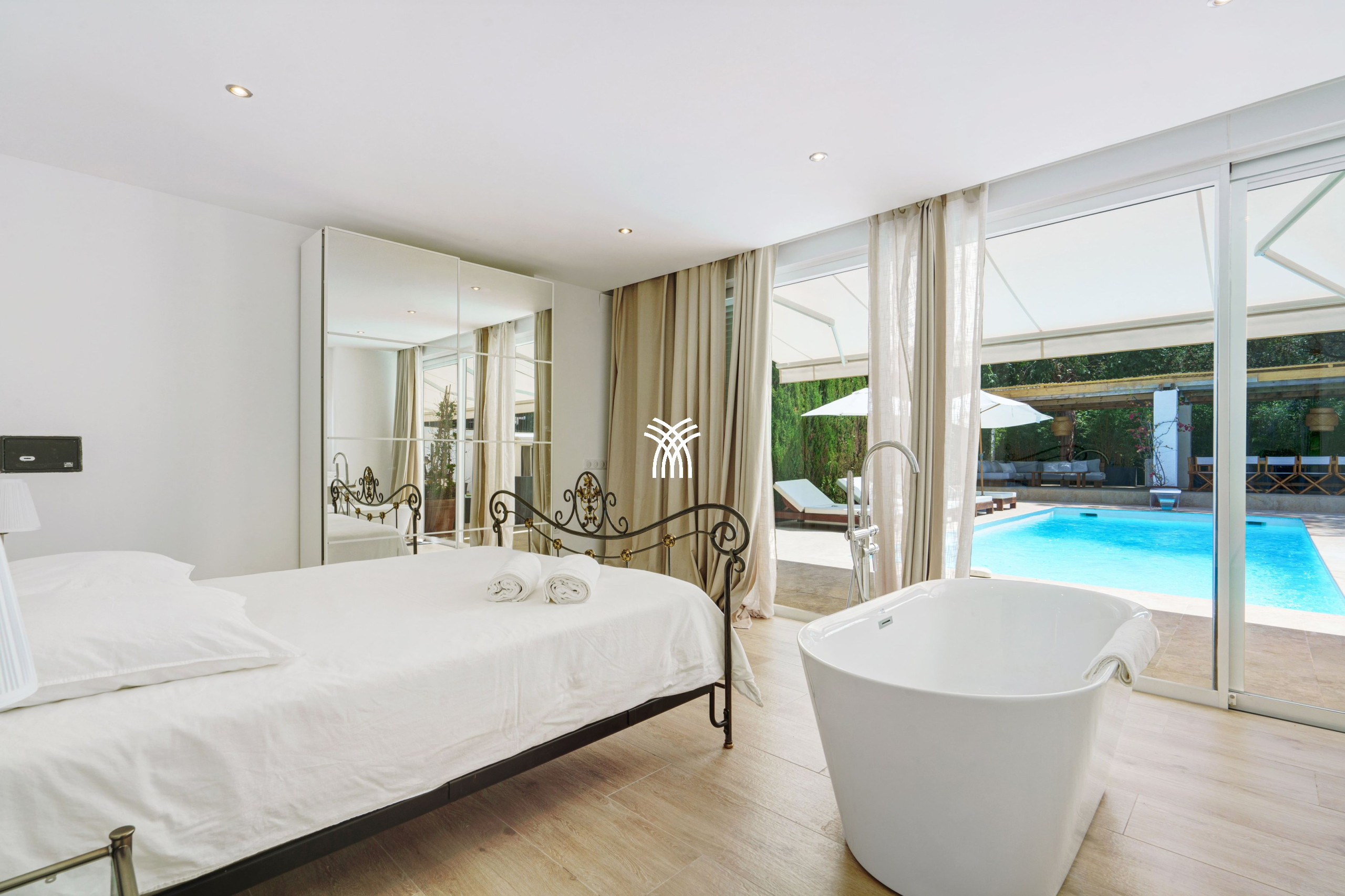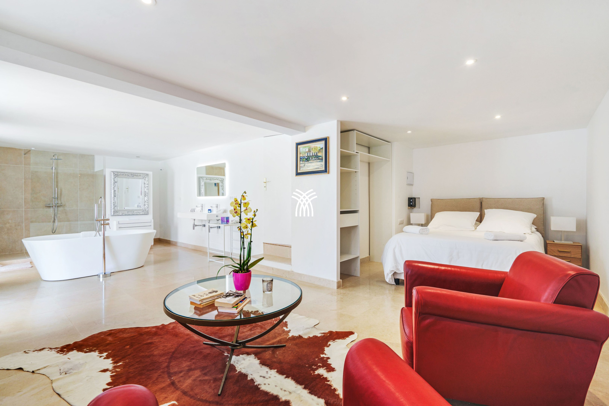 La Villa Elles dispose de six chambres spacieuses, chacune avec sa salle de bain privative, décorées avec goût dans un style mêlant esthétique moderne et touches chaleureuses. Certaines chambres se distinguent par des éléments uniques tels que des miroirs en pied et des œuvres d’art contemporain, créant une ambiance apaisante et élégante.