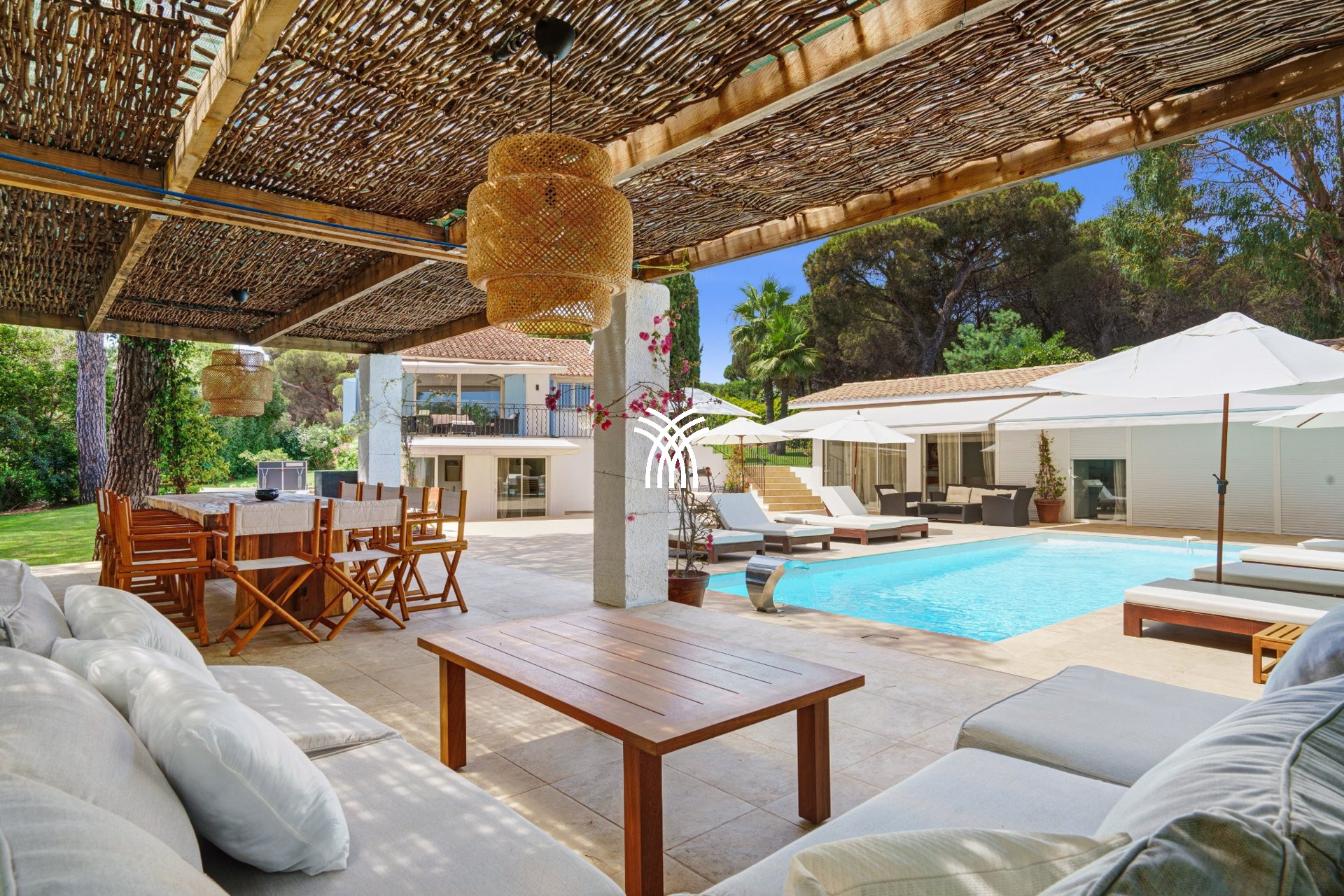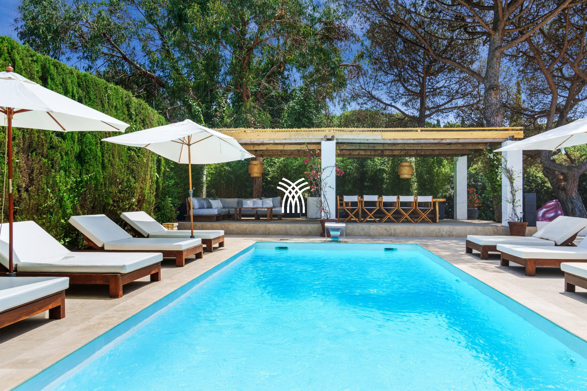 Dès l’entrée, les jardins paysagers luxuriants, ponctués de pins parasols et de végétation méditerranéenne, instaurent une atmosphère paisible et intime. La vaste terrasse principale s’ouvre sur une somptueuse piscine privée, bordée de transats confortables et de parasols, invitant à la détente sous le soleil de la Côte d’Azur. Un espace ombragé, agrémenté d’une grande table en bois rustique, promet des repas en plein air dans un cadre authentique et convivial.