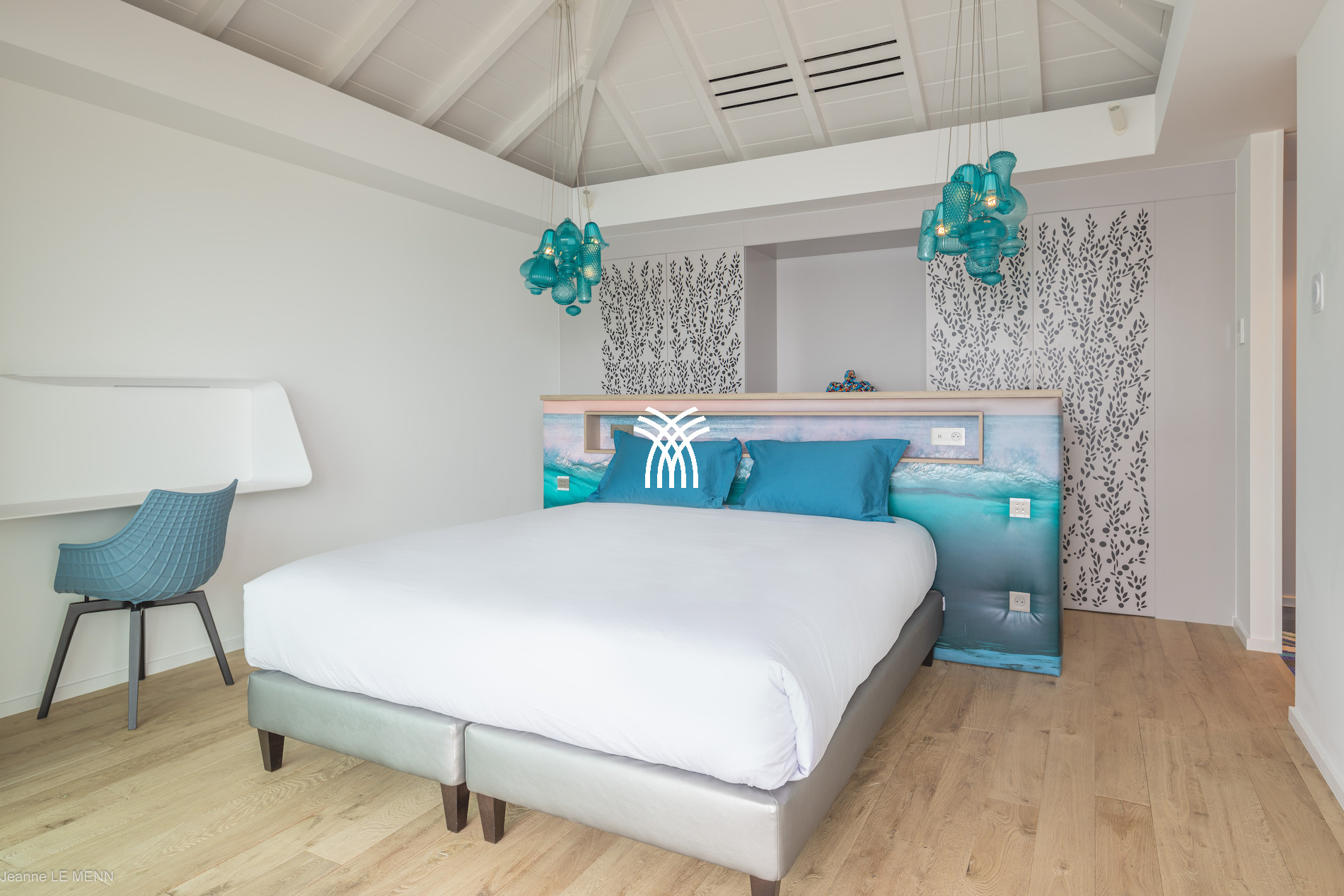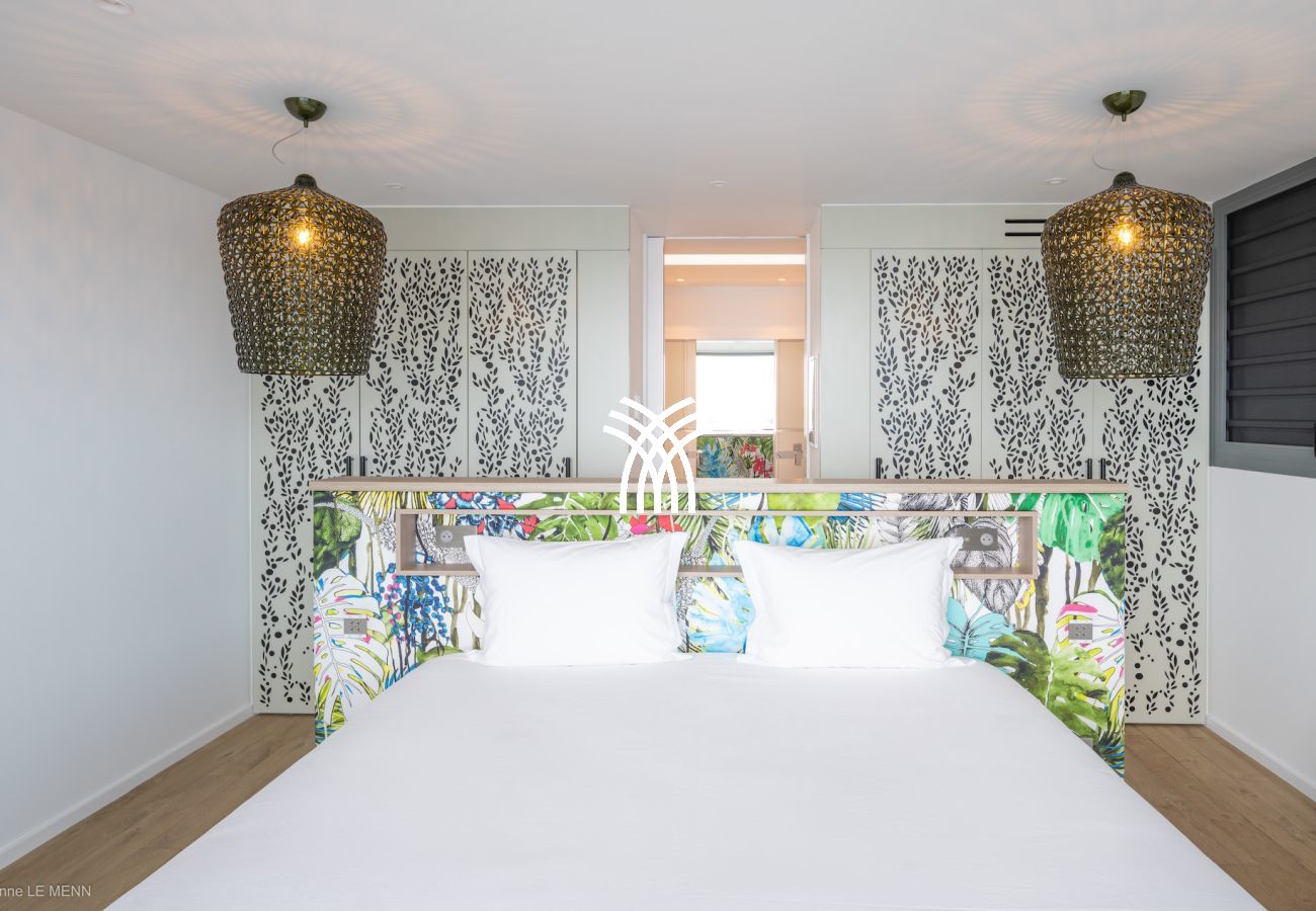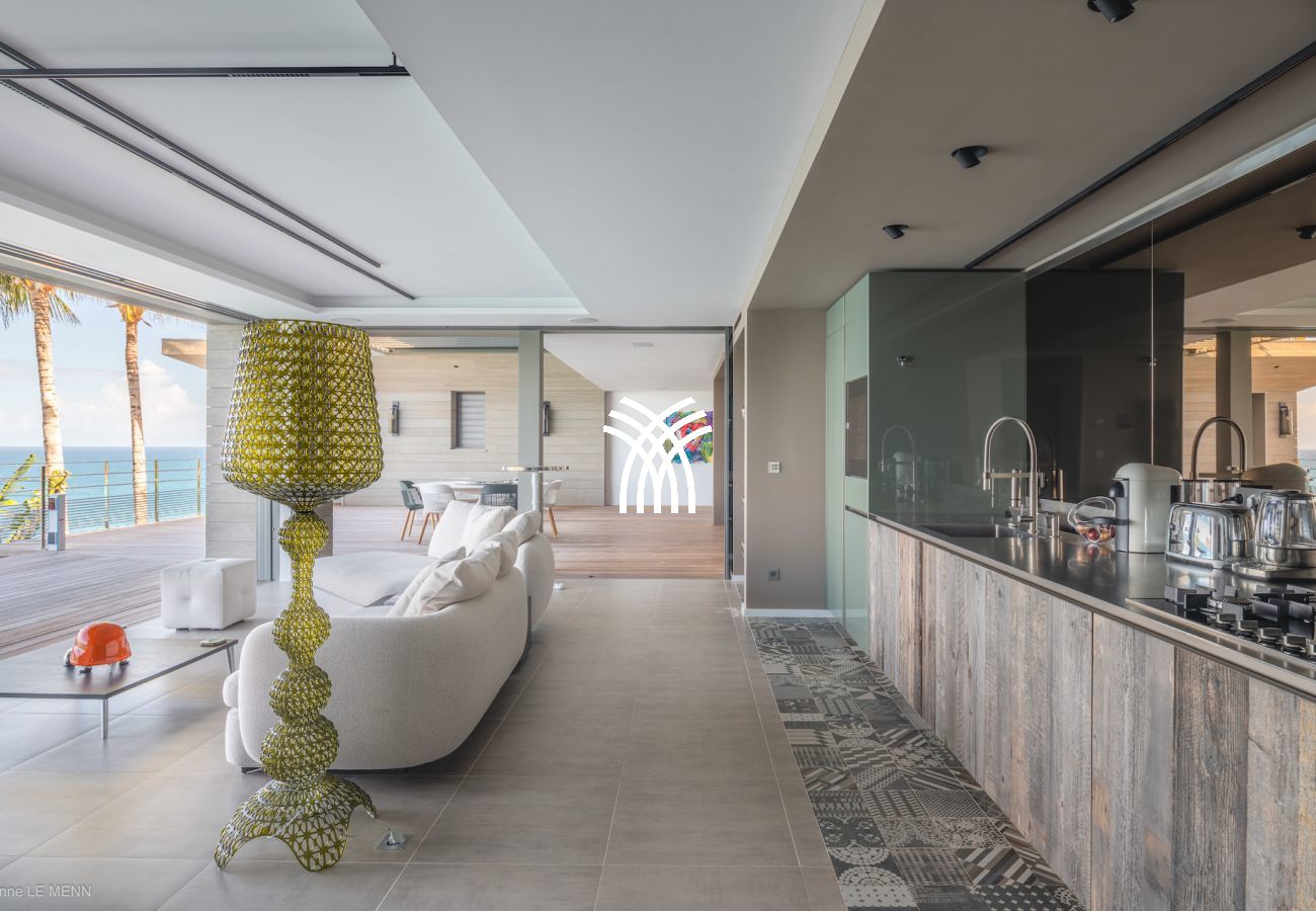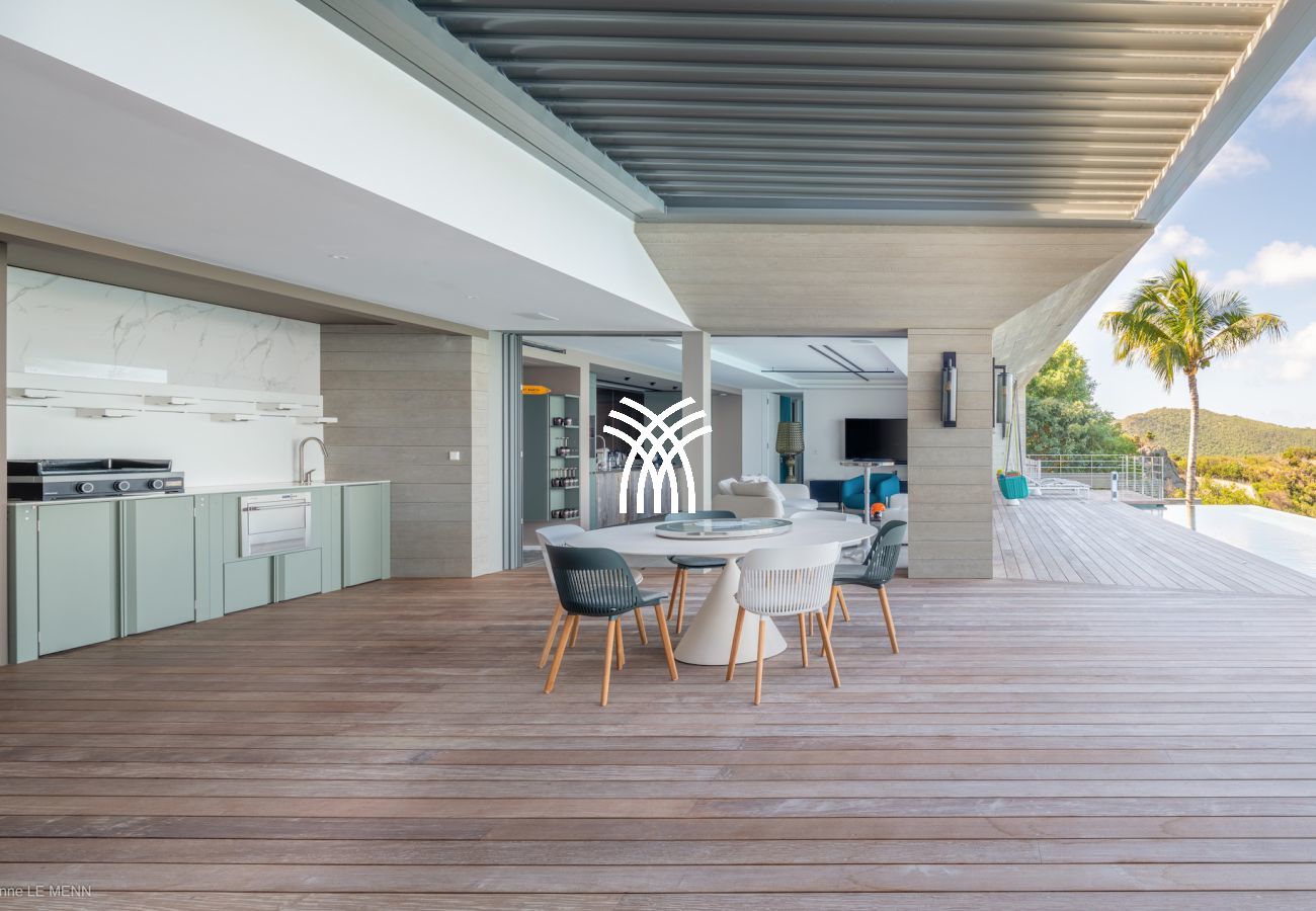 La propriété comprend également la villa Petit Lagon, qui ajoute deux chambres supplémentaires avec salles de bains attenantes, une cuisine compacte et un salon ouvert sur l’extérieur. Les larges baies vitrées et portes en bois créent une harmonie parfaite entre intérieur et extérieur, permettant de profiter pleinement des alizés et de la vue tropicale. Une piscine privée entourée d’une terrasse en bois, un barbecue et des espaces lounge invitent à la convivialité et à la détente sous le ciel étoilé des Caraïbes.
