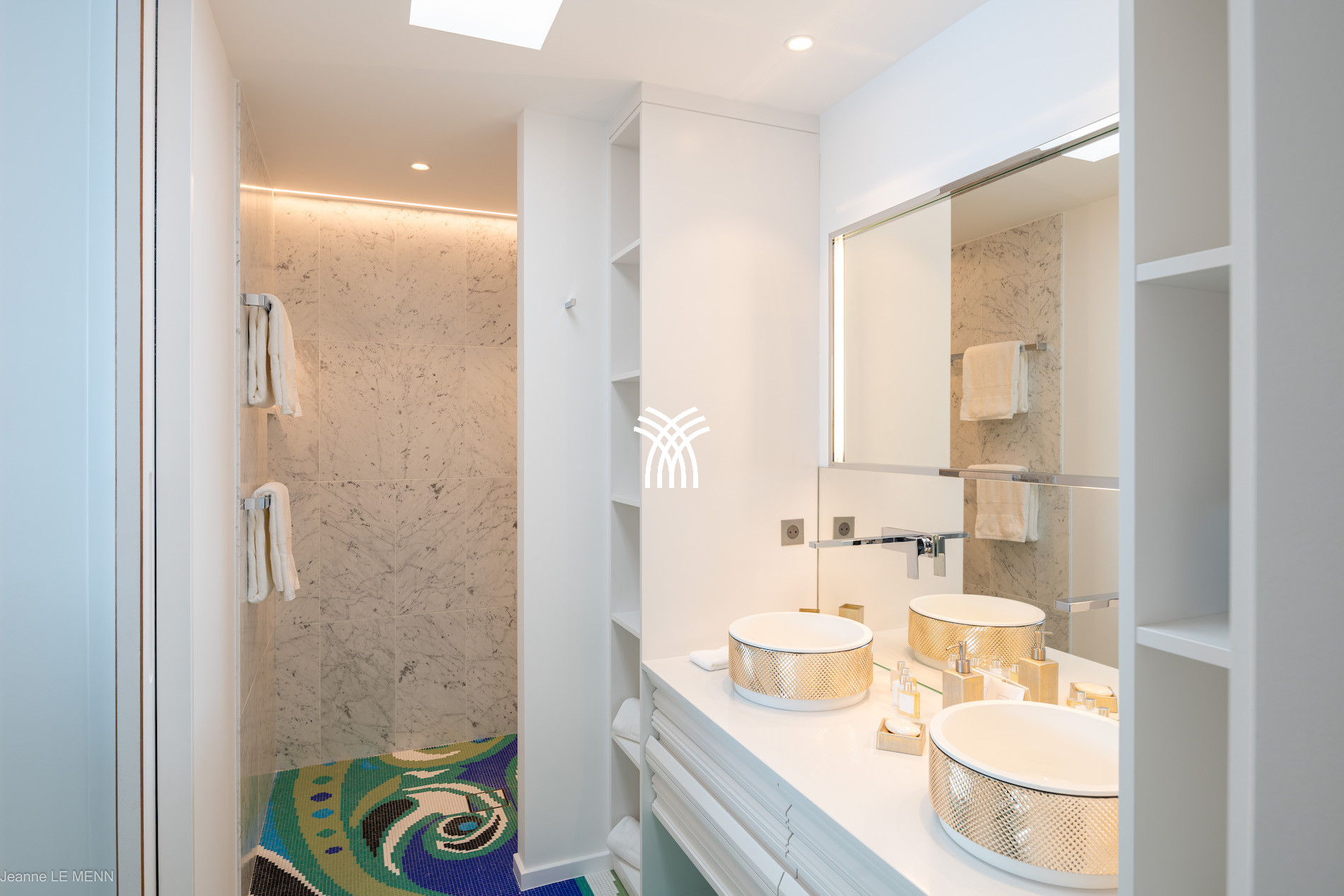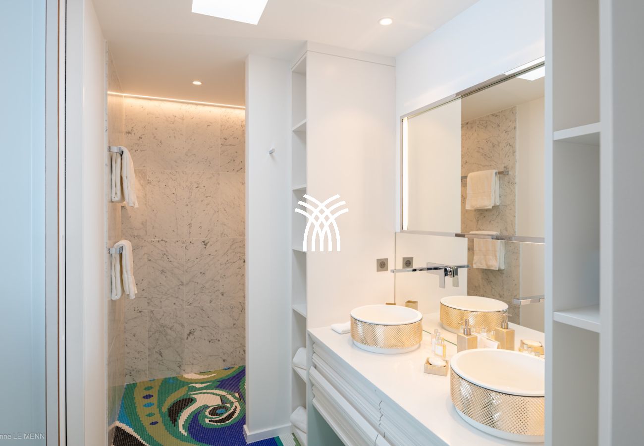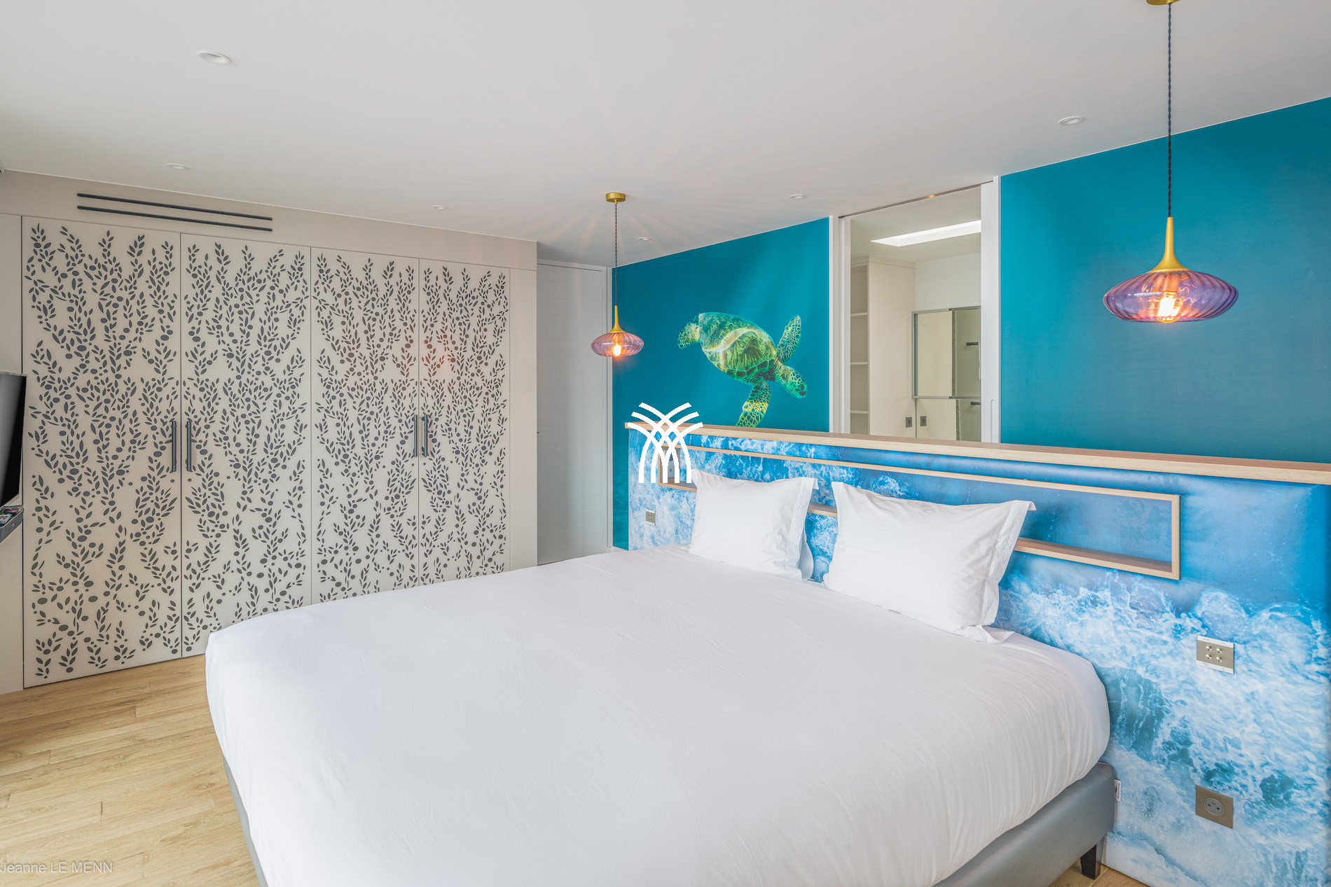 Organisée sur trois niveaux, la villa principale séduit par ses volumes généreux et son atmosphère chaleureuse. Le niveau principal abrite un élégant salon baigné de lumière, une chambre parentale et une cuisine ouverte donnant sur la terrasse et la piscine. Le niveau inférieur accueille deux autres chambres avec salles de bains privatives, chacune offrant une atmosphère intime et reposante. Plus bas, un studio indépendant complète l’ensemble, avec son salon, sa kitchenette et sa chambre confortable. Toutes les chambres sont équipées de lits king-size convertibles en lits jumeaux pour s’adapter à tous les besoins, et chacune dispose de sa propre salle de bain.