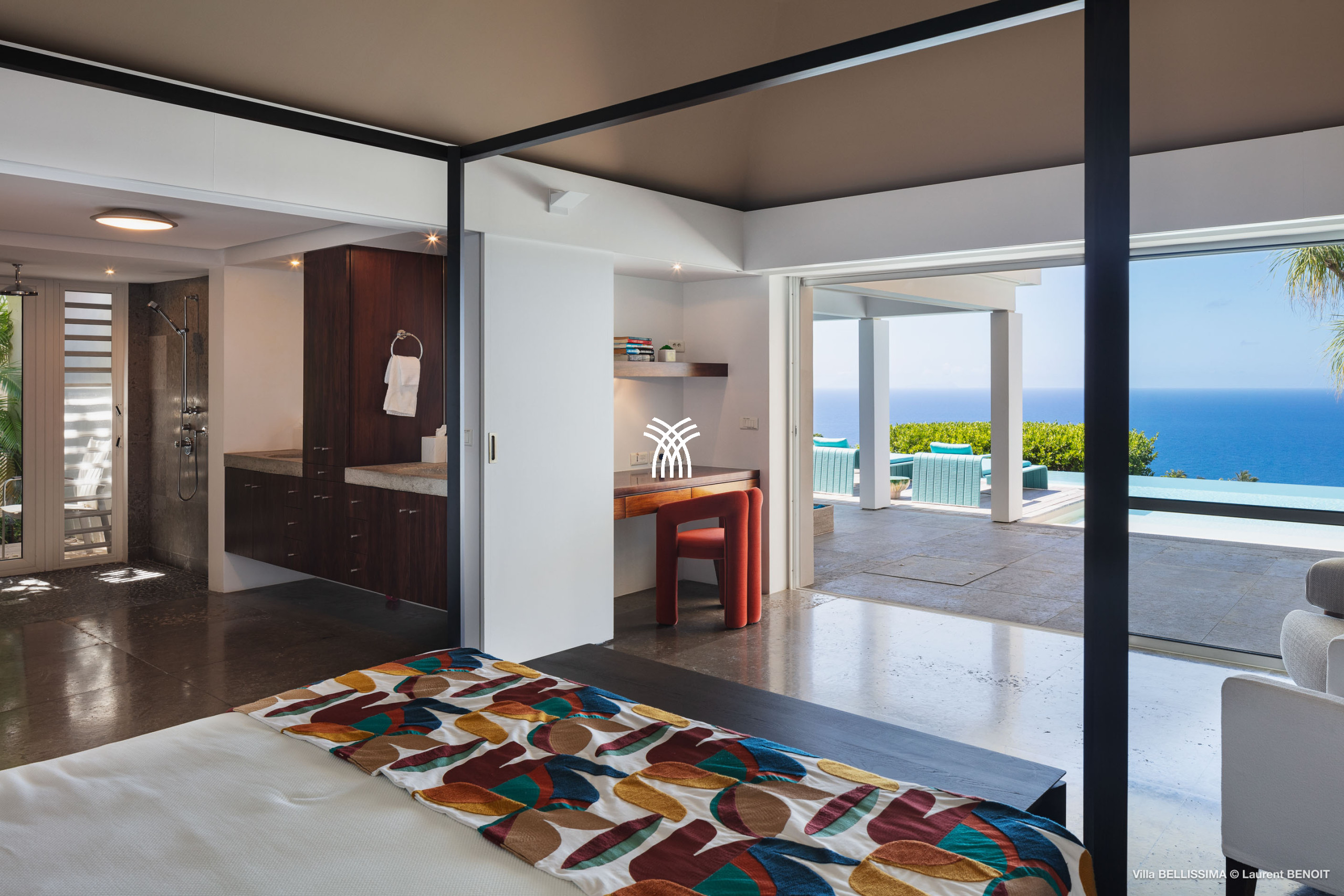 Vous apprécierez son salon ouvert sur la piscine. Toute la villa est orientée vers l’océan
