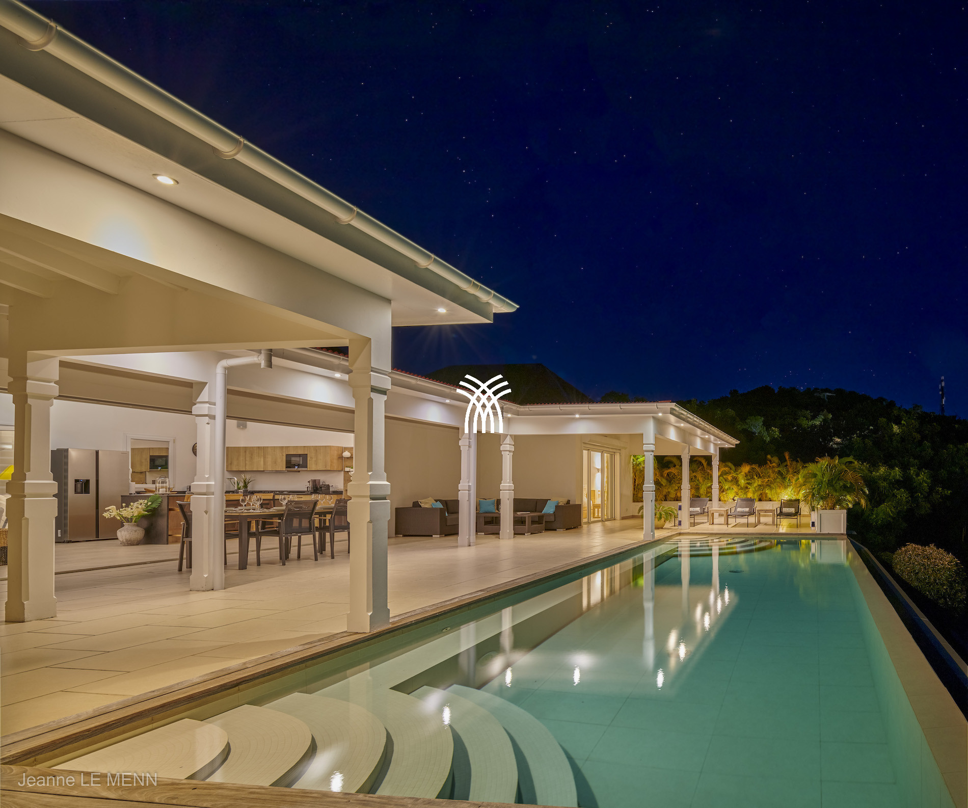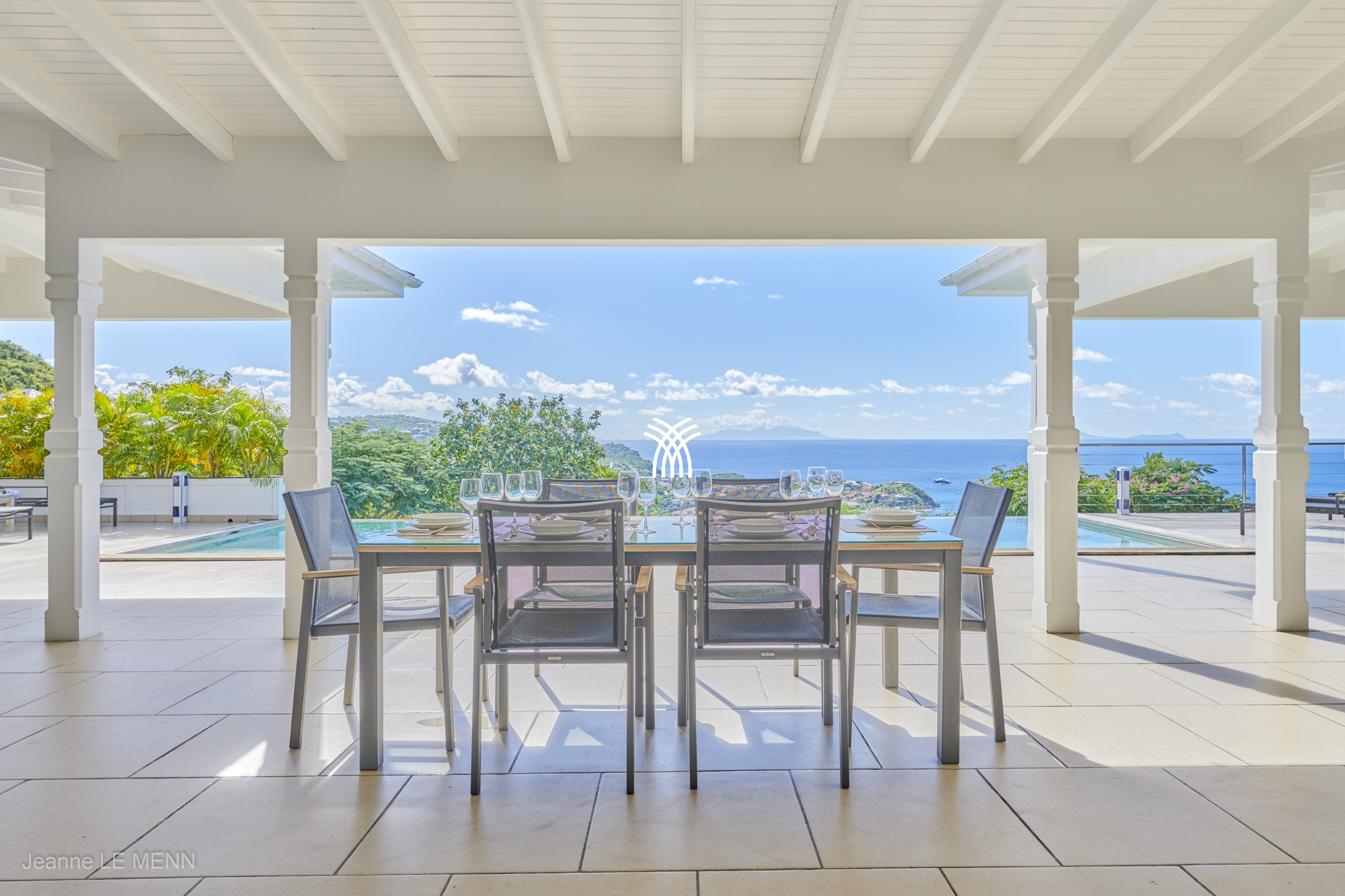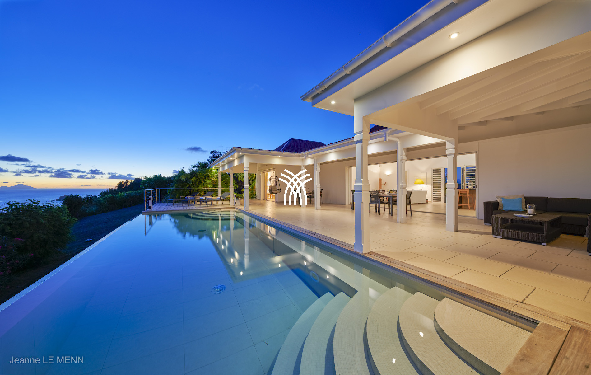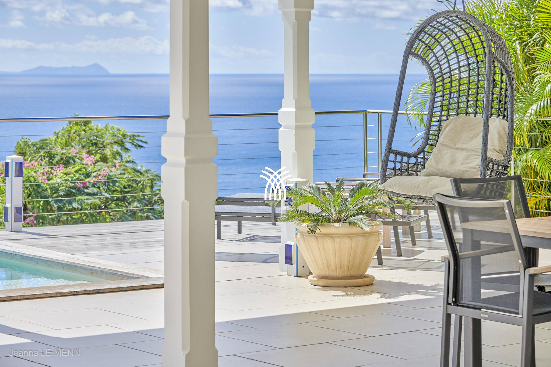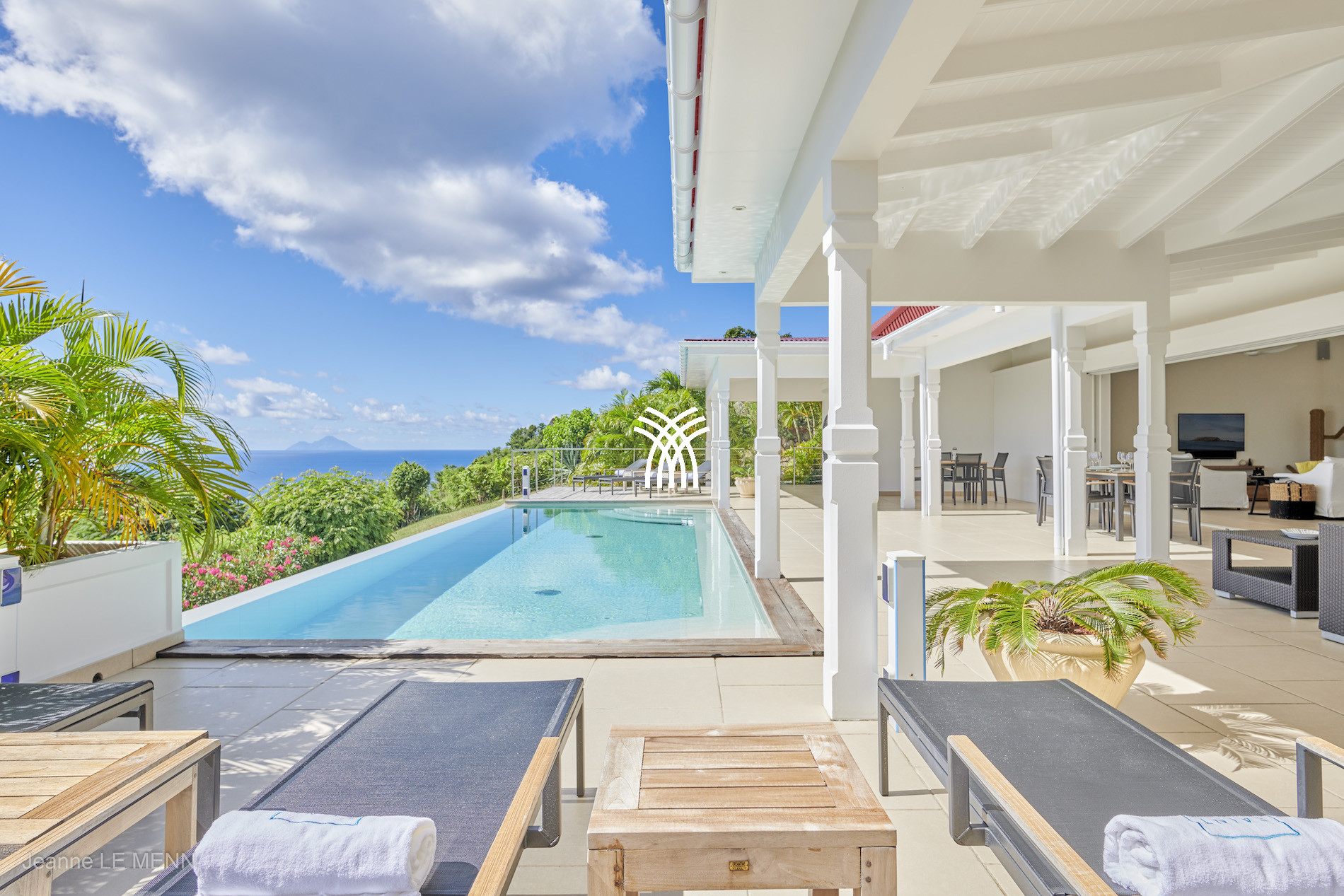 La piscine chauffée, longue et élégante, est un véritable lieu de détente, avec vue imprenable sur la mer des Caraïbes. Que ce soit pour se rafraîchir, prendre le soleil ou admirer le coucher de soleil, la terrasse est un point fort de cette villa.