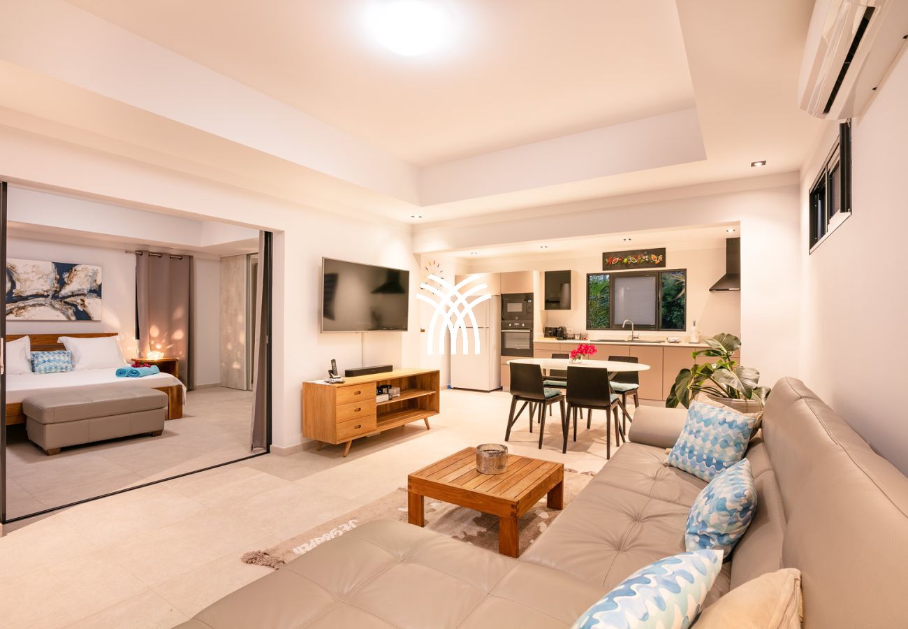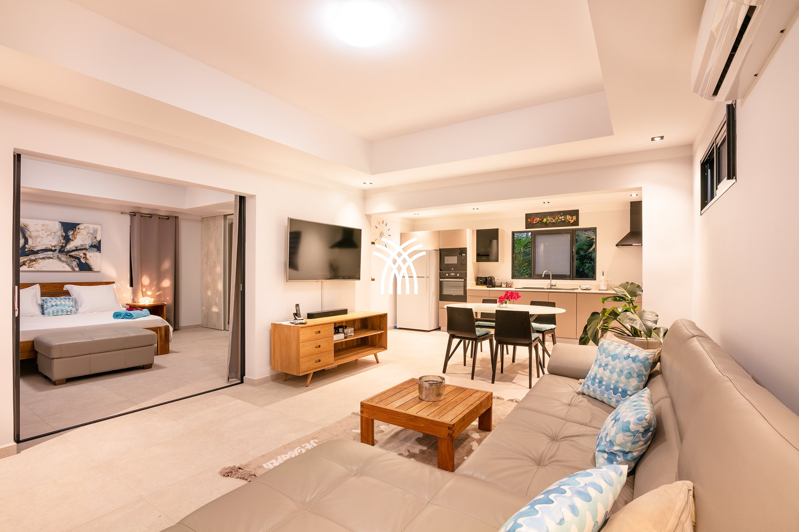 Récemment rénovée, la villa propose un espace élégant et épuré avec une chambre confortable, une salle de bain attenante, une cuisine entièrement équipée et un salon cosy. Idéale pour un couple, elle offre l’équilibre parfait entre luxe discret, confort moderne et tranquillité.