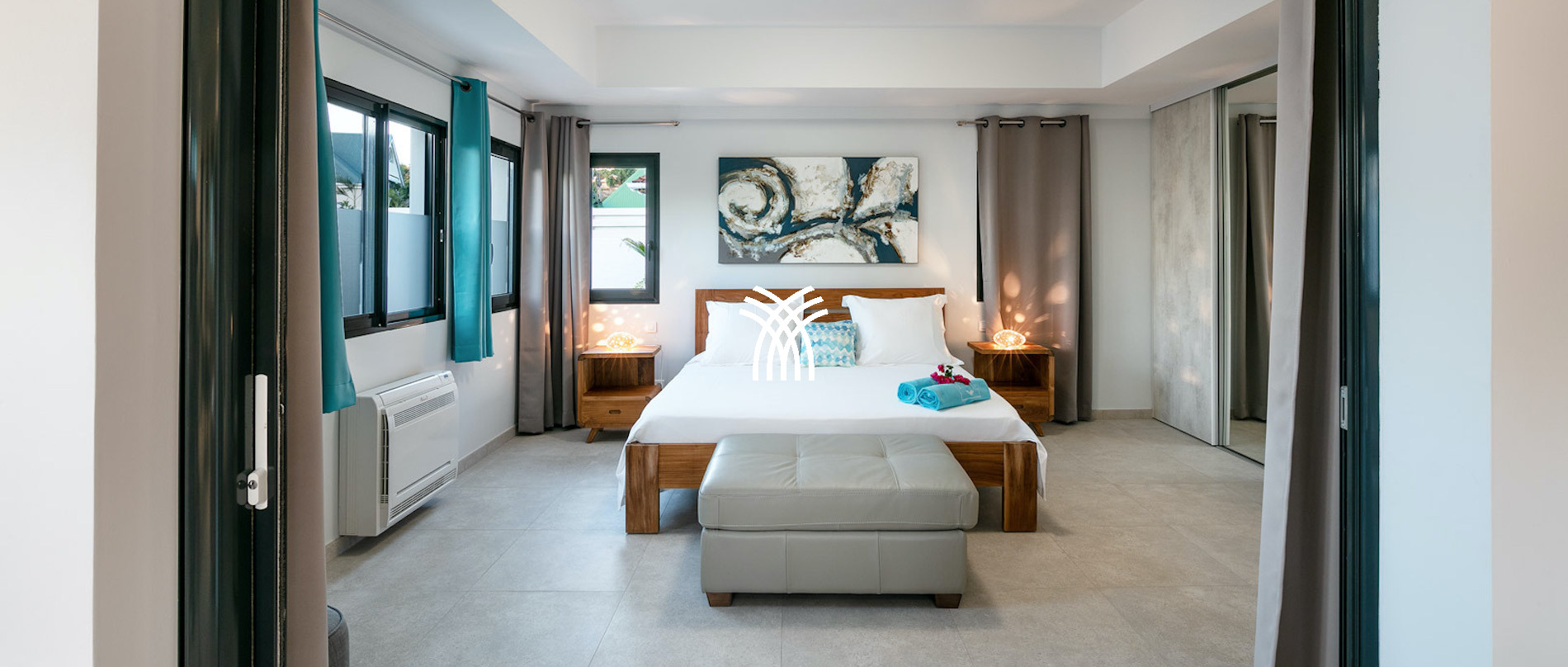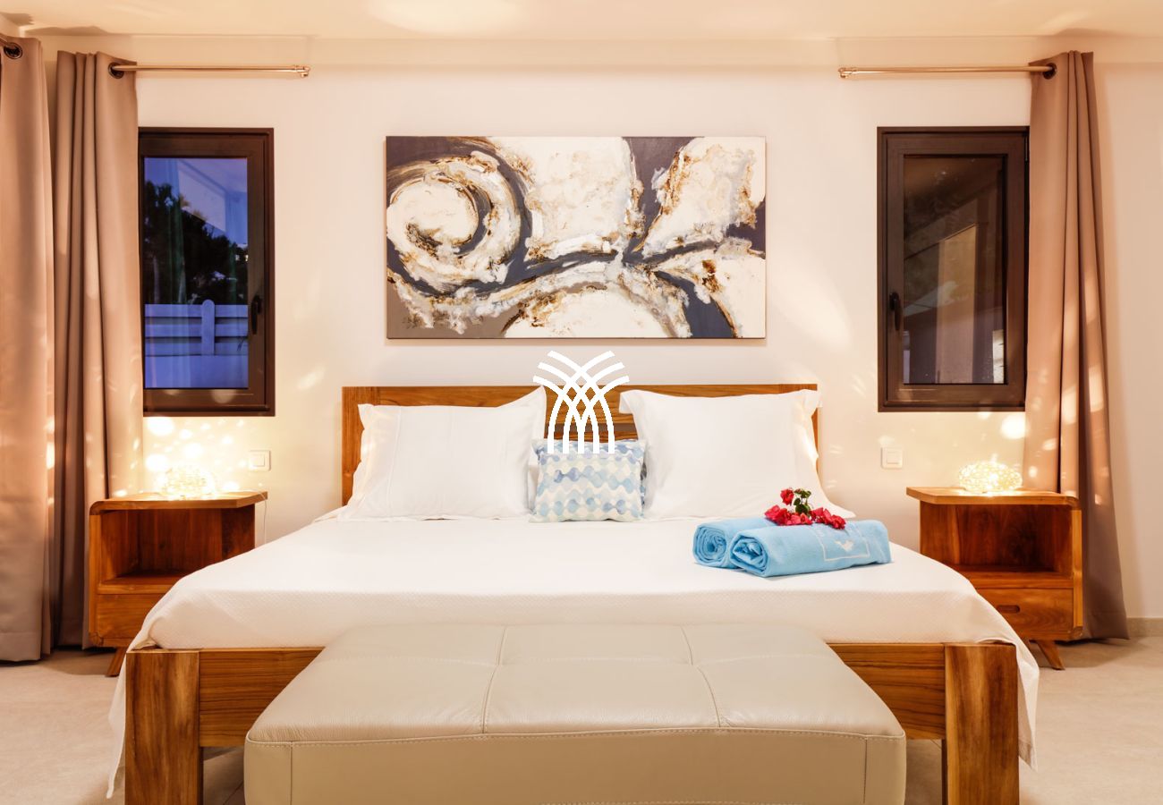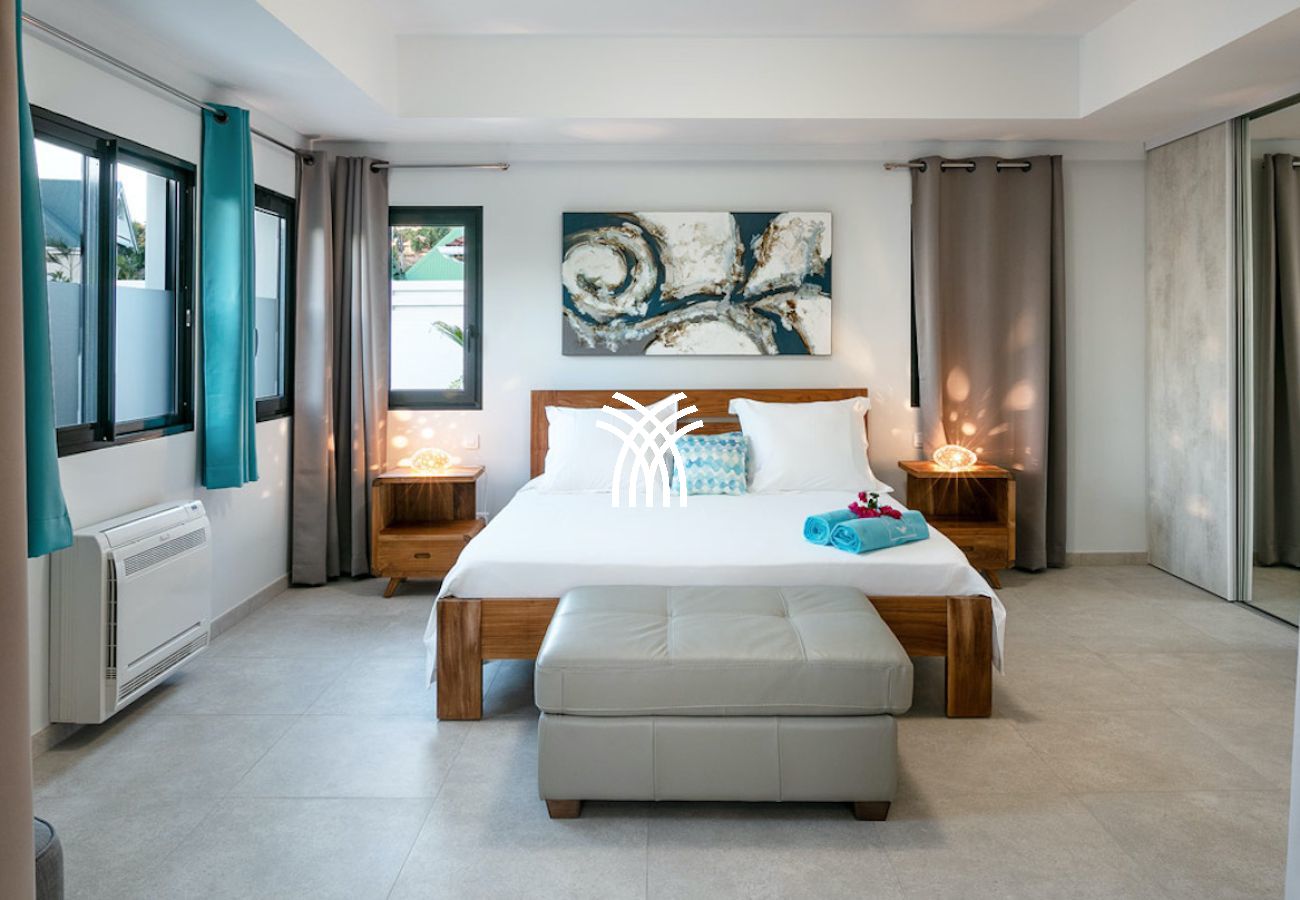 La chambre et la salle de bain forment un espace ouvert et harmonieux, baigné de lumière naturelle et décoré avec goût. Le mobilier chic, les lignes épurées et l’ambiance feutrée créent un cadre idyllique pour un séjour en couple à St Barth.