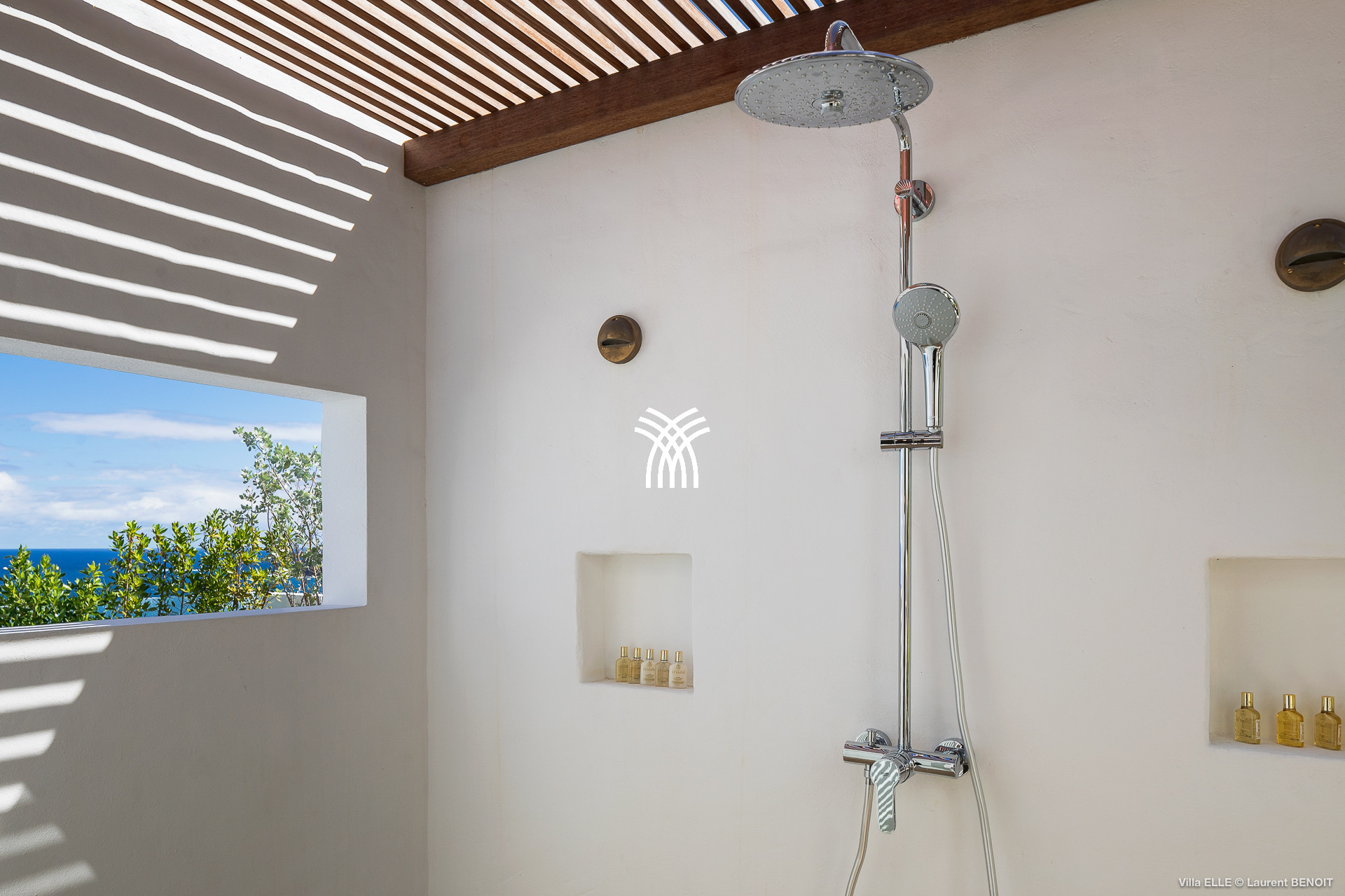 La villa comprend 4 chambres spacieuses, dont 3 avec salle de bains privative. Deux sont situées au niveau principal, tandis que la chambre principale et la quatrième chambre occupent l’étage supérieur, toutes offrant une vue mer spectaculaire. Grâce à sa configuration modulable, la villa peut être louée en 2, 3 ou 4 chambres, selon vos besoins.