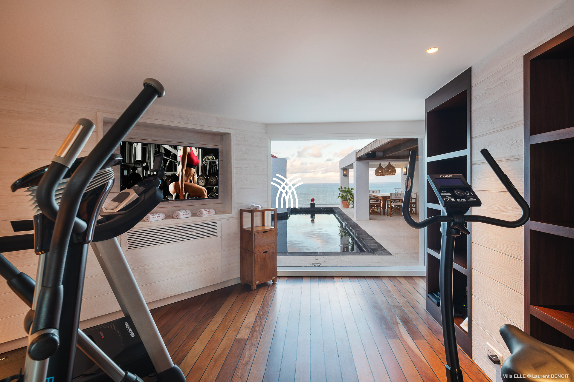 Côté bien-être et loisirs, la Villa Elle propose une salle de sport, une salle de massage et une véritable salle de cinéma privée, un atout rare sur l’île. Ces équipements font de la villa un lieu parfait pour conjuguer détente, activité et divertissement.
