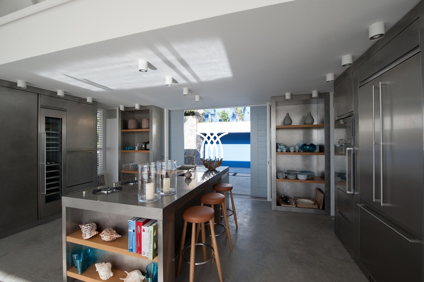 Cette villa de luxe, moderne et confortable, se compose de matériaux pures et harmonieux et a été construite sur deux niveaux et en plusieurs unités. Au niveau principal se trouve la piscine, le premier module avec la cuisine et la salle à manger, le deuxième module avec le salon intérieur, la partie centrale avec le salon couvert mais complètement ouvert sur la terrasse et deux bungalows situés de chaque côté de la piscine abritant des chambres.