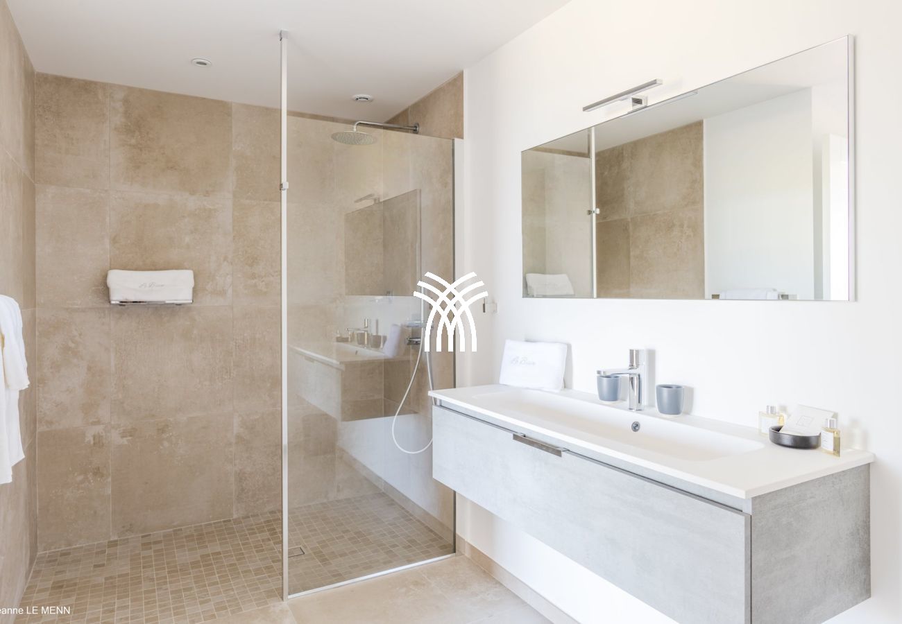 Les trois chambres climatisées, chacune avec leur salle de bain privative, offrent une atmosphère paisible, des matériaux nobles et un confort absolu. La villa peut être louée en 1, 2 ou 3 chambres, ce qui permet une grande flexibilité pour s’adapter à la taille de votre groupe.
