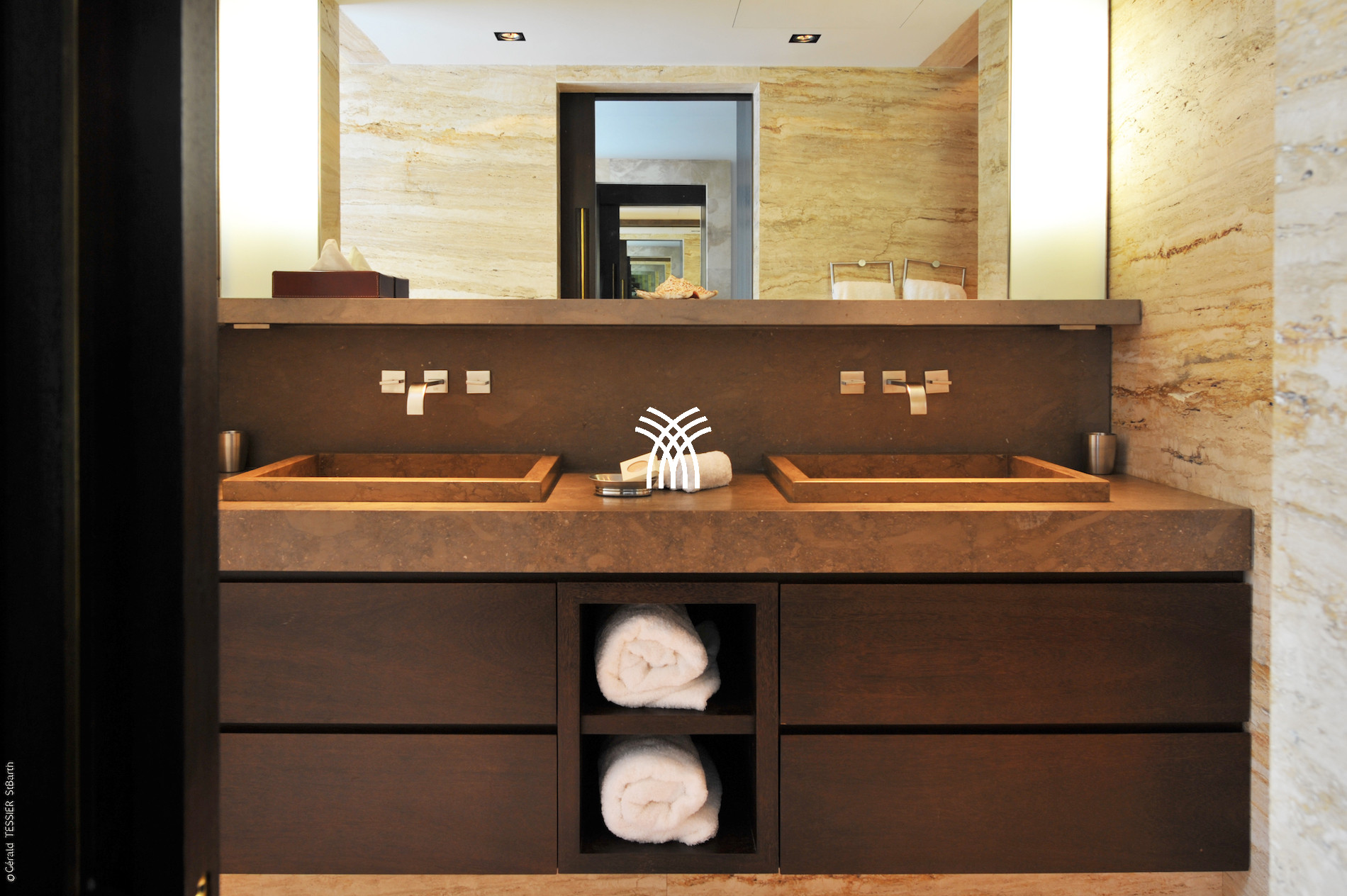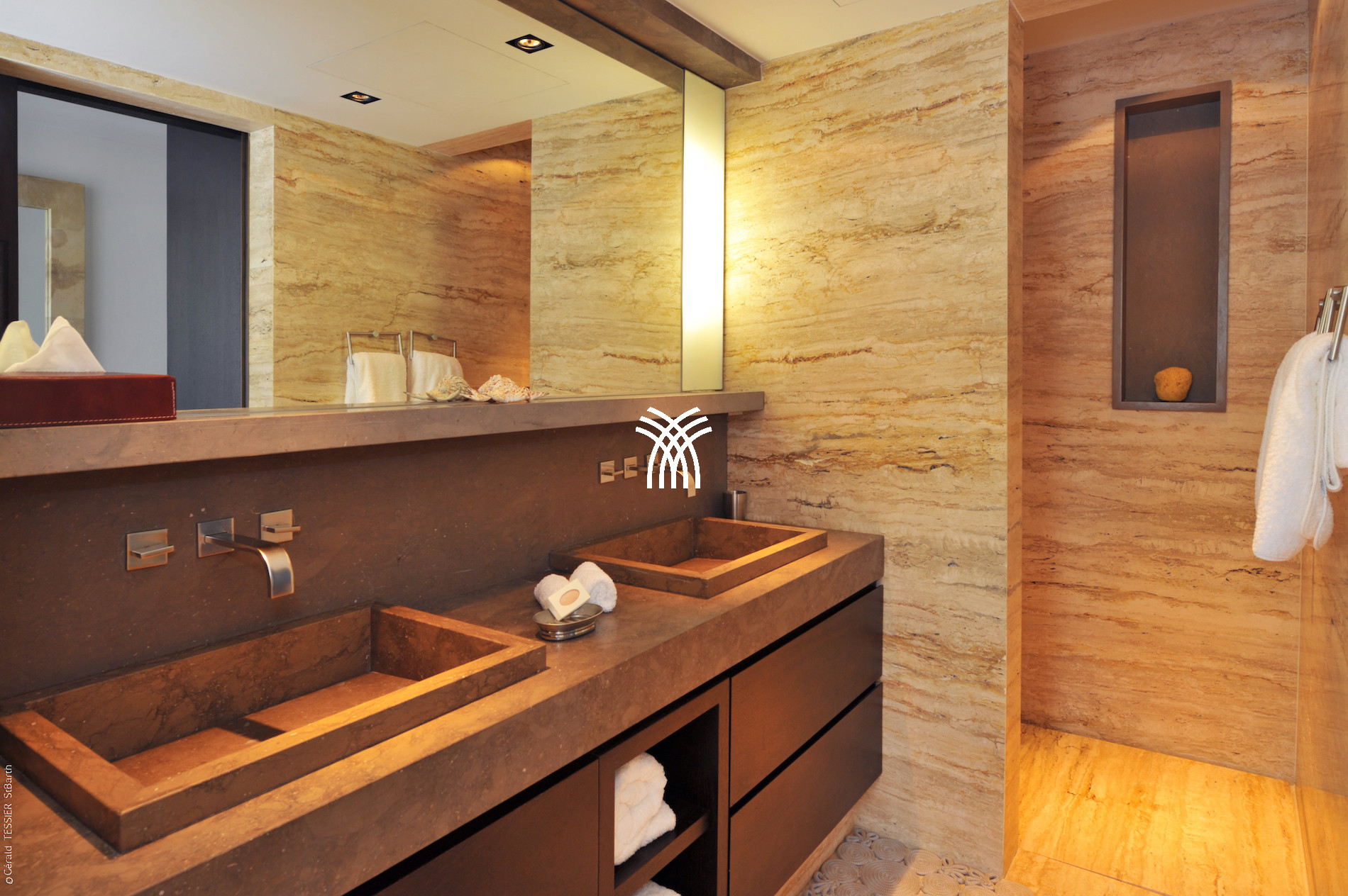 La partie principale se compose d'une cuisine ouverte sur la salon, une terrasse couverte avec table à manger et la chambre principale avec un lit King size, deux dressing ainsi qu'une douche extérieure. Une large terrasse extérieure entoure la piscine et sépare le module principale du bungalow abritant la deuxième chambre avec lit King size et douche extérieure. Les deux dernières chambres se trouvent au niveau inférieur de la villa. La troisième chambre offre un lit King size transformable en lit jumeaux et la quatrième chambre offre un lit King size et une vue dans la piscine! Toutes les chambres ont leur propre salle de bain.