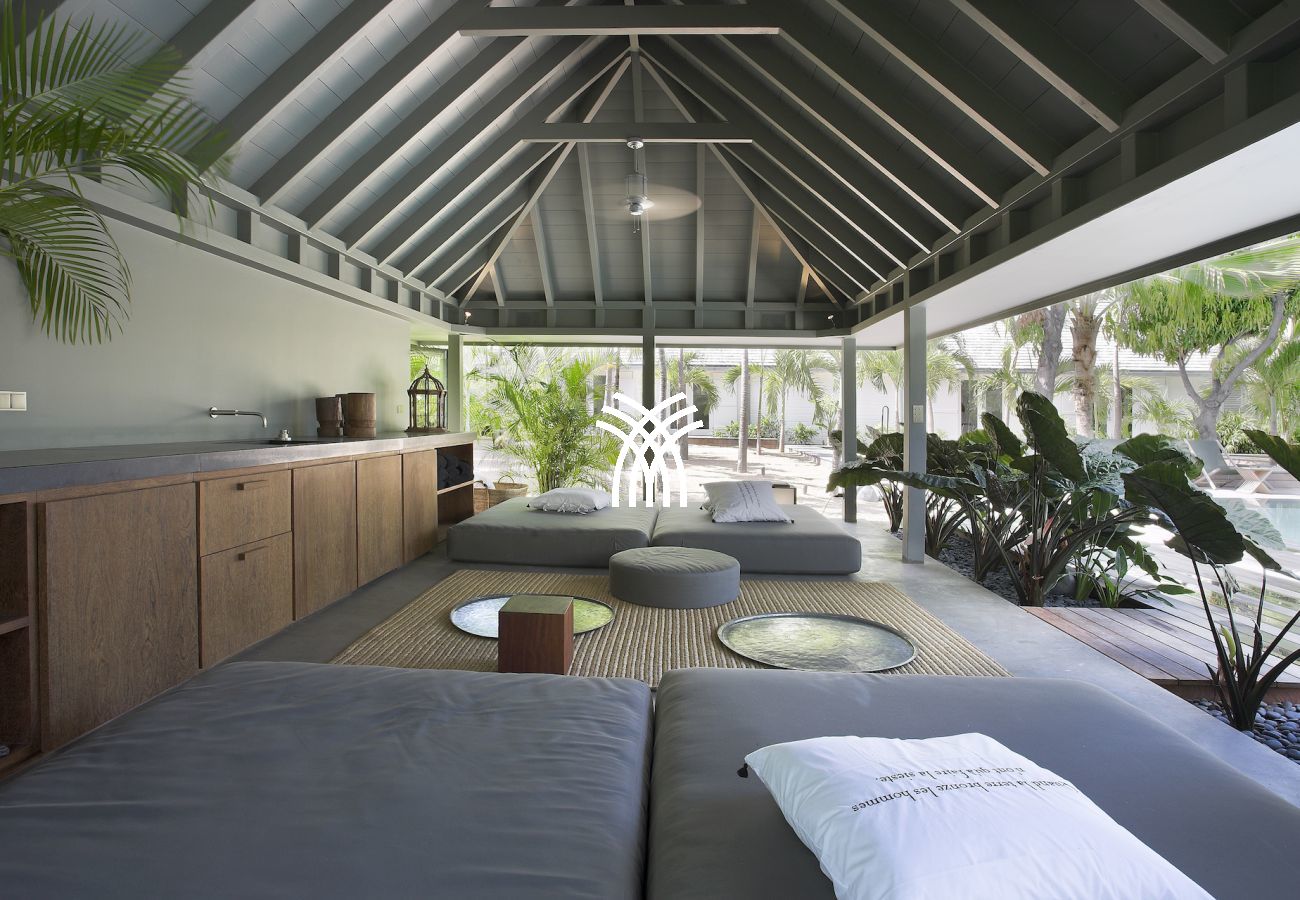 La terrasse centrale avec sa piscine à débordement est le cœur vivant de la villa, offrant un panorama époustouflant sur l’océan et les collines environnantes. Les espaces lounge, les transats et les zones ombragées créent une atmosphère parfaite pour se détendre ou organiser des moments conviviaux.