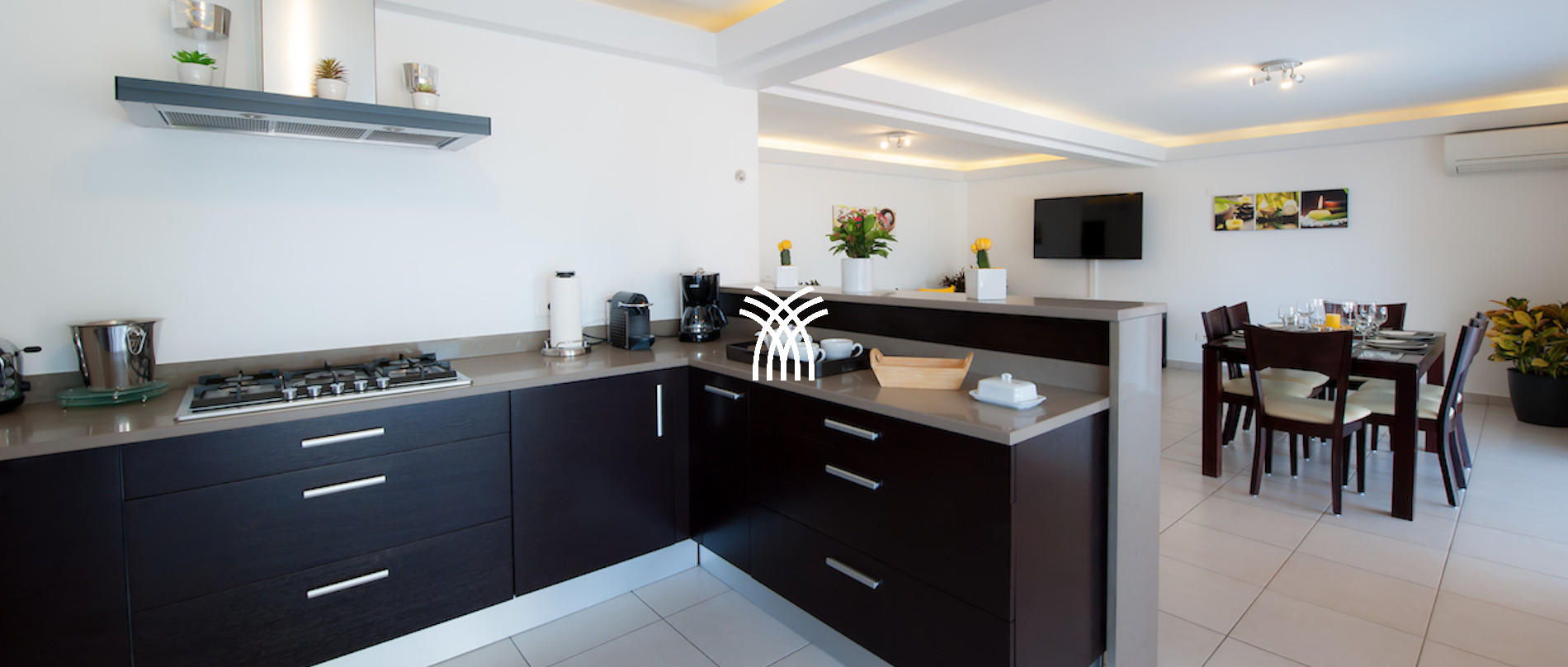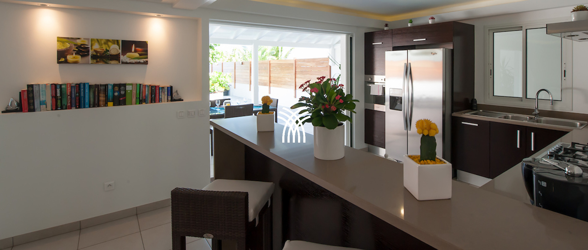 La cuisine moderne, entièrement équipée, donne directement sur la piscine à débordement, offrant une vue imprenable sur l’océan. Vous pourrez vous y détendre à toute heure de la journée, en admirant les voiliers au loin et les couchers de soleil spectaculaires.