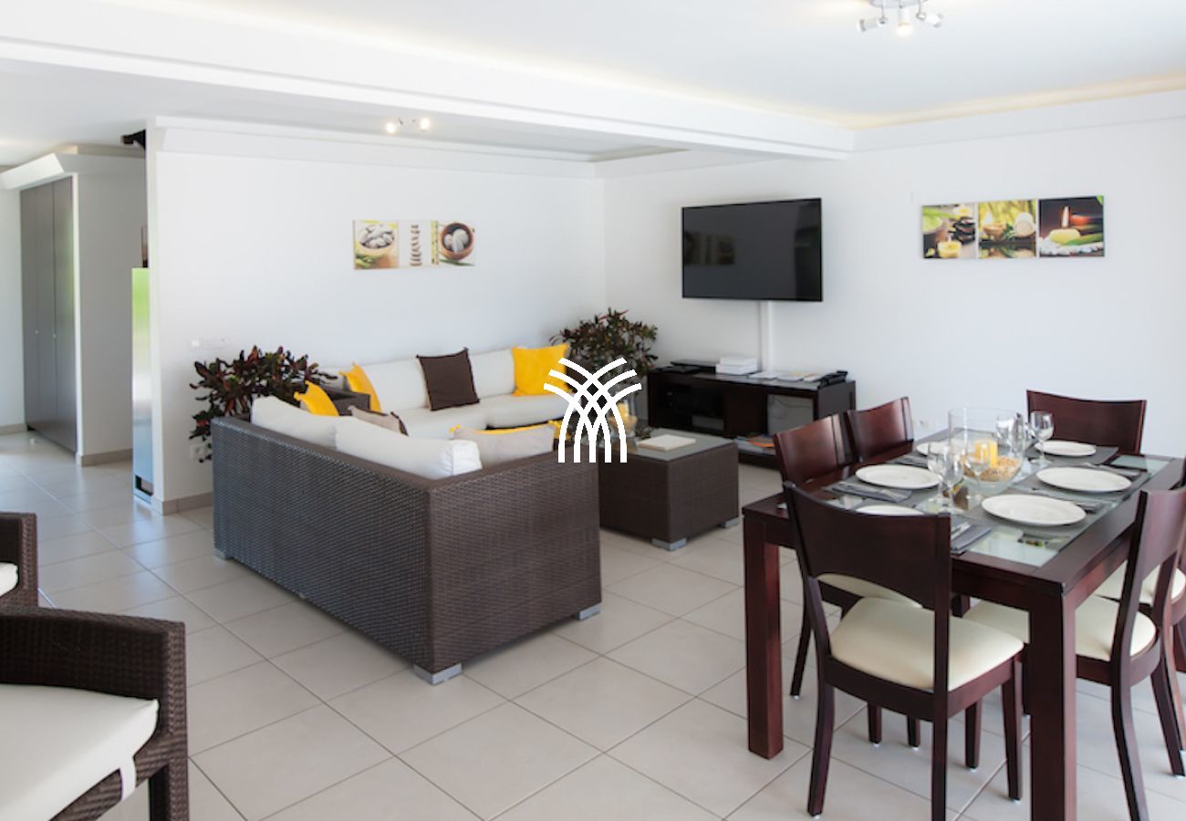 Récemment redécorée, la villa offre une atmosphère apaisante et raffinée, idéale pour une escapade romantique ou un séjour serein à deux. Le salon et la salle à manger spacieux s’ouvrent sur l’extérieur, créant une transition naturelle entre la maison et la magnifique terrasse.