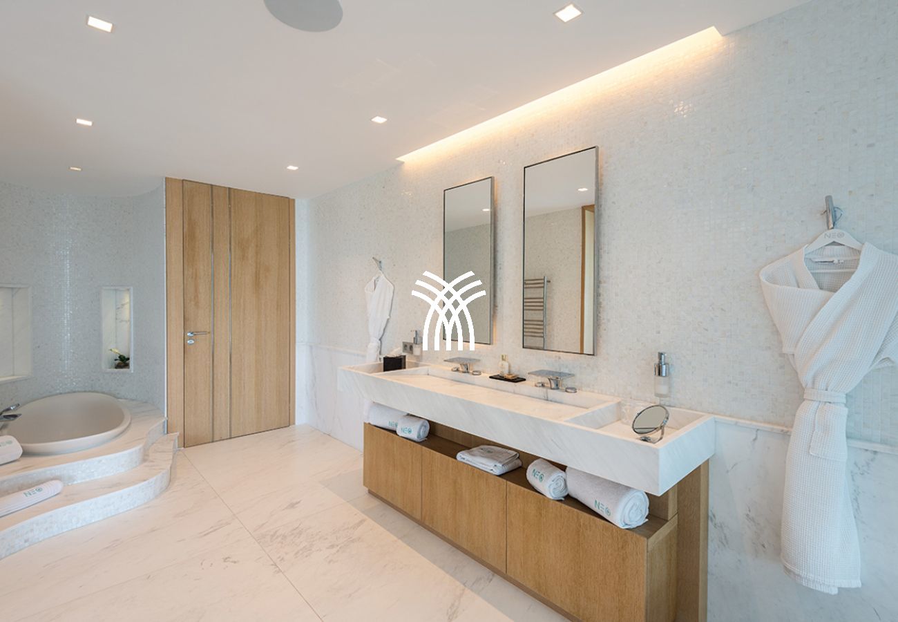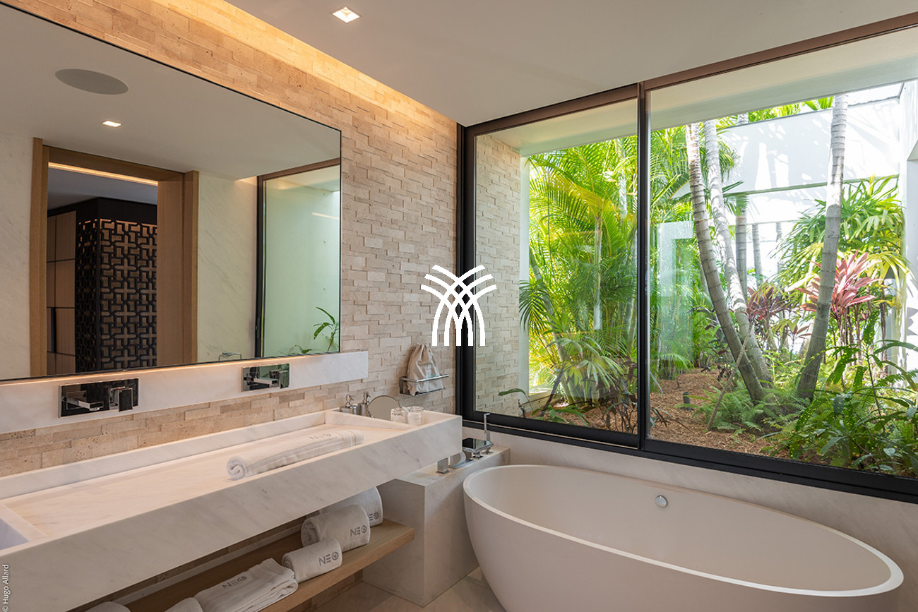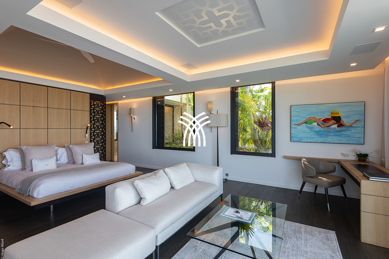 Les espaces de vie sont vastes, lumineux et parfaitement connectés à l’extérieur, invitant à une immersion totale dans le paysage tropical. Les chambres, élégamment aménagées, offrent une intimité absolue et des prestations haut de gamme. La suite principale, véritable cocon de sérénité, dispose de sa propre terrasse privée et d’une salle de bains somptueuse.