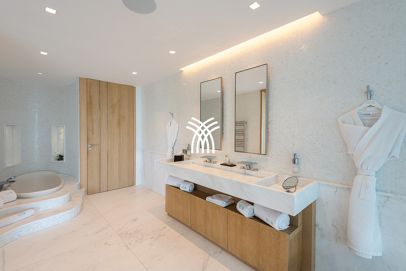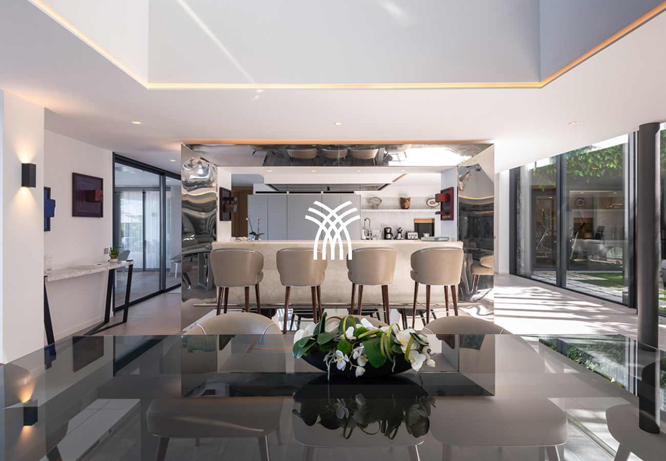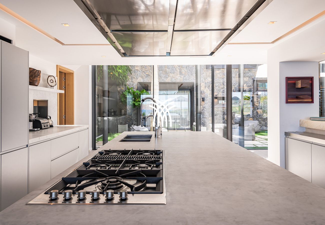 À l’extérieur, la piscine à débordement s’ouvre sur un jardin tropical luxuriant. Cet espace est idéal pour se détendre, admirer le coucher de soleil ou partager un dîner sous les étoiles. Le jacuzzi, les espaces lounge et la cuisine gastronomique parfaitement équipée ajoutent à l’expérience une touche de raffinement inégalée.