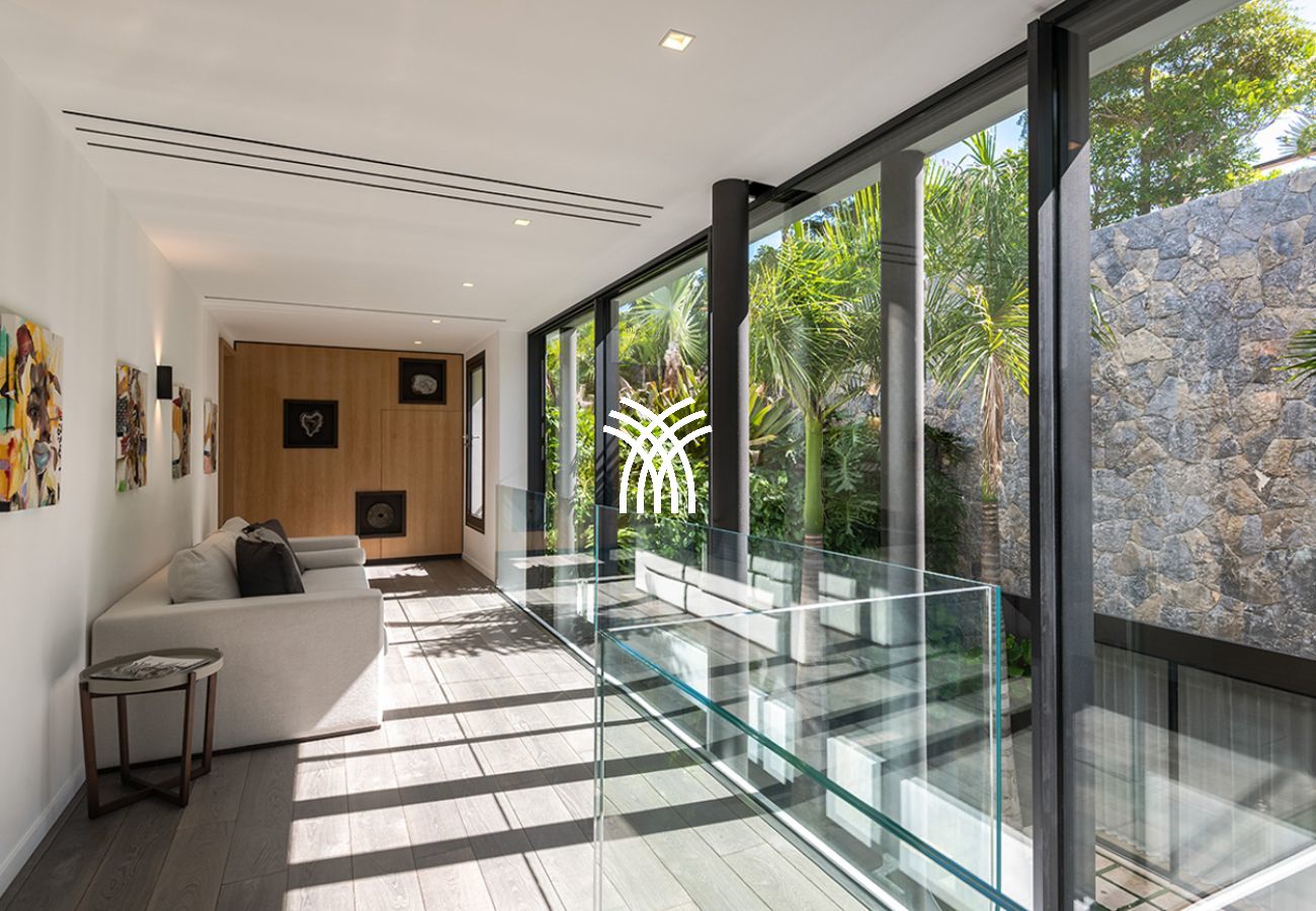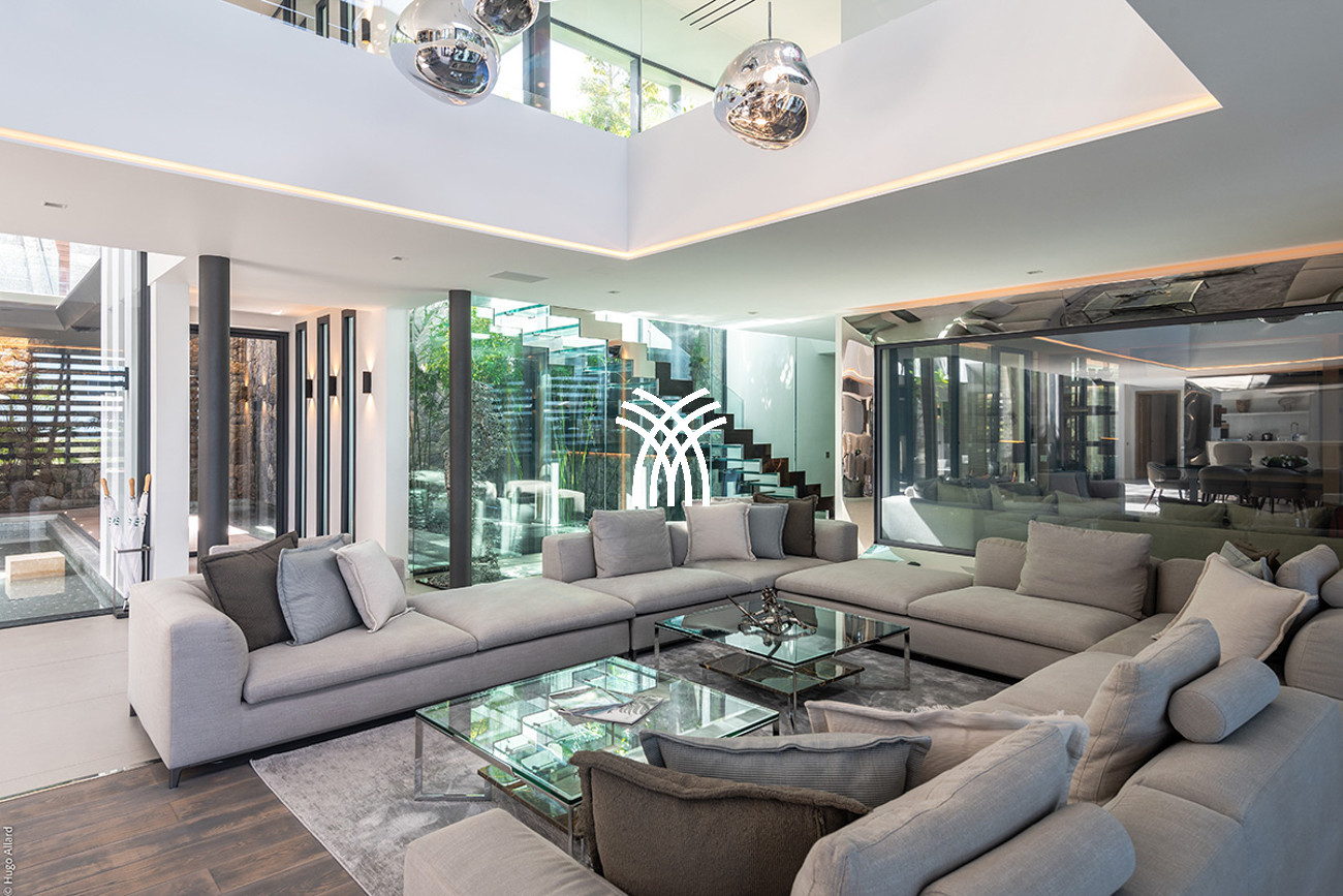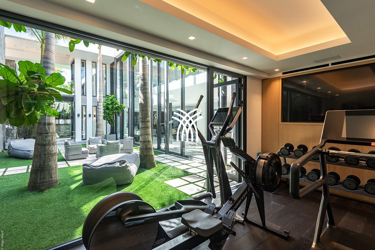 Dans la villa principale vous trouverez 4 chambres chacune avec salle de bain, une cuisine super équipée avec son bar, un grand salon, un espace de détente extérieur ouvert sur la table à manger, une salle de fitness, une large terrasse entourant les deux piscines