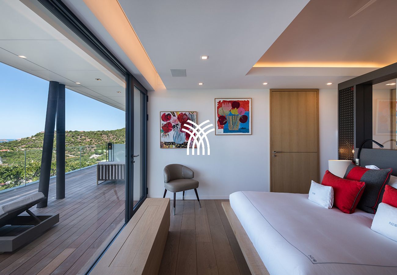 Les six chambres climatisées avec salles de bains privées garantissent intimité et confort. Trois chambres disposent de balcons avec vue, deux autres s’ouvrent sur le jardin, et la sixième, avec accès direct à la piscine, offre une vue spectaculaire sur la mer.