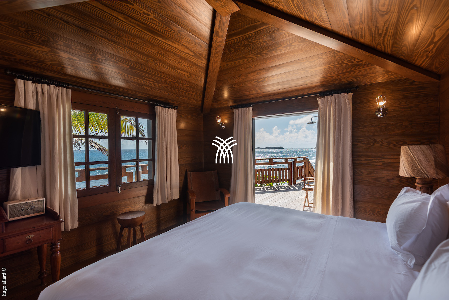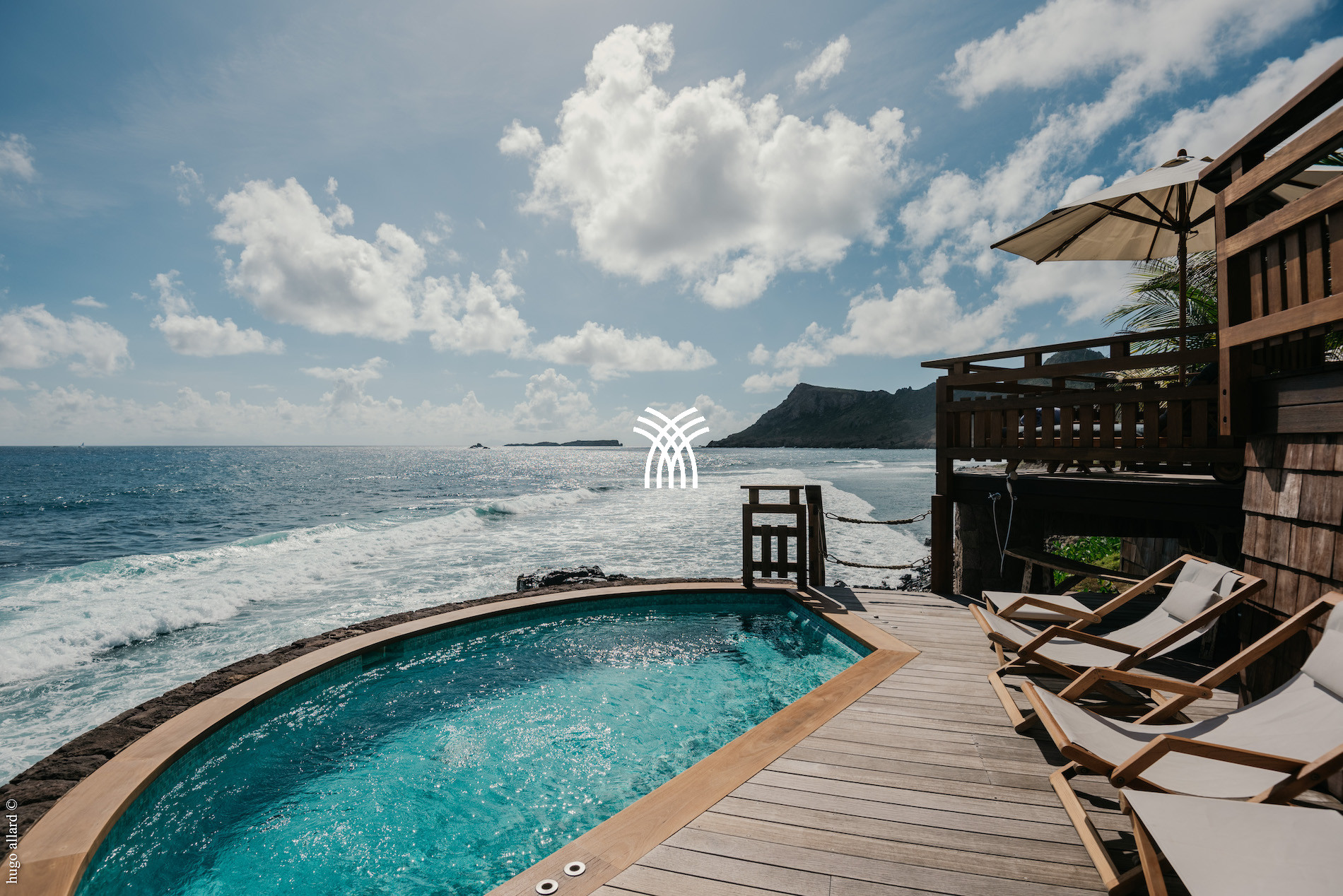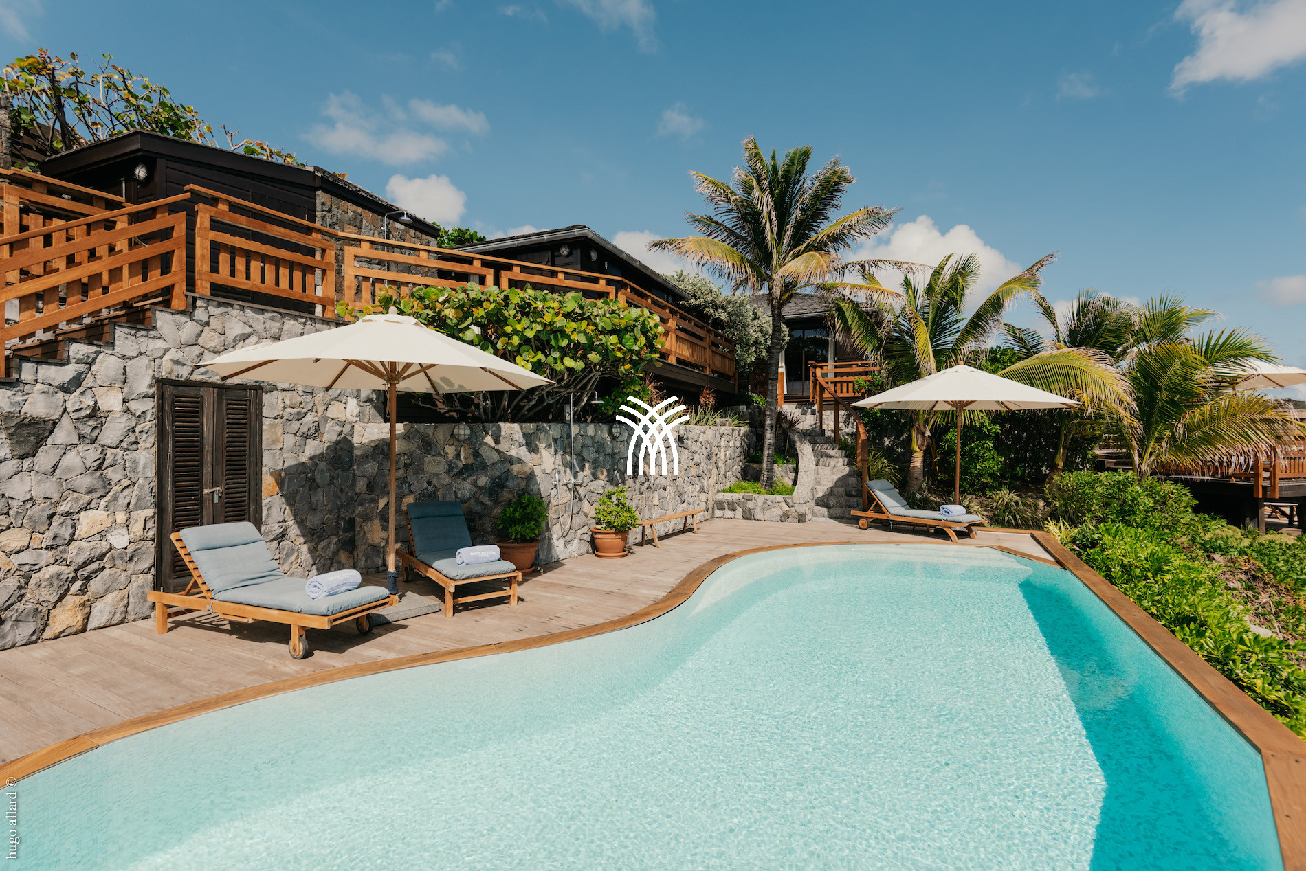 La propriété comprend également la villa Petit Lagon, qui ajoute deux chambres supplémentaires avec salles de bains attenantes, une cuisine compacte et un salon ouvert sur l’extérieur. Les larges baies vitrées et portes en bois créent une harmonie parfaite entre intérieur et extérieur, permettant de profiter pleinement des alizés et de la vue tropicale. Une piscine privée entourée d’une terrasse en bois, un barbecue et des espaces lounge invitent à la convivialité et à la détente sous le ciel étoilé des Caraïbes.