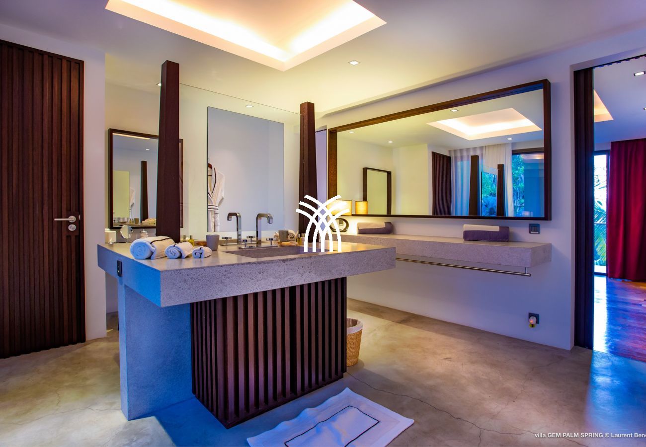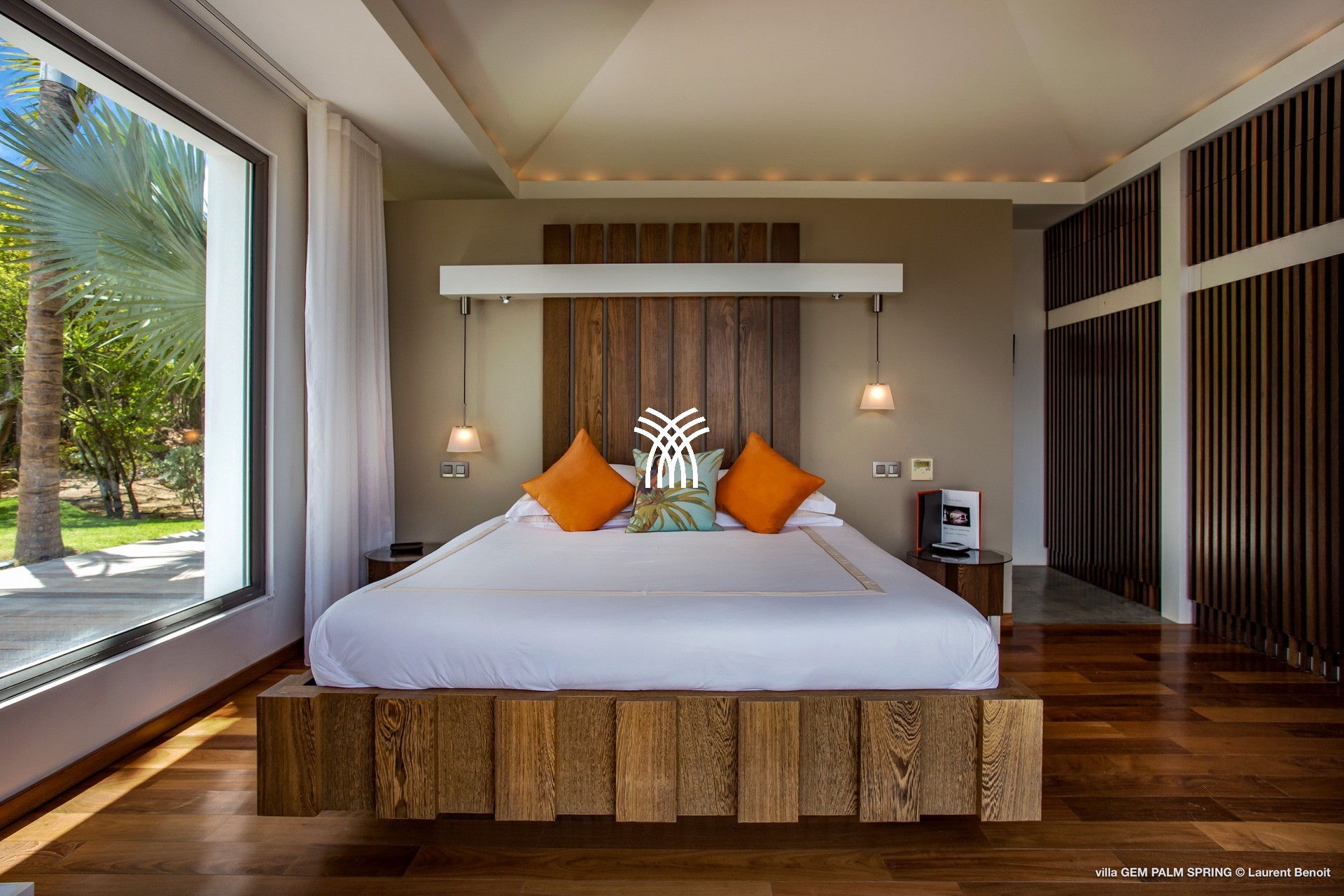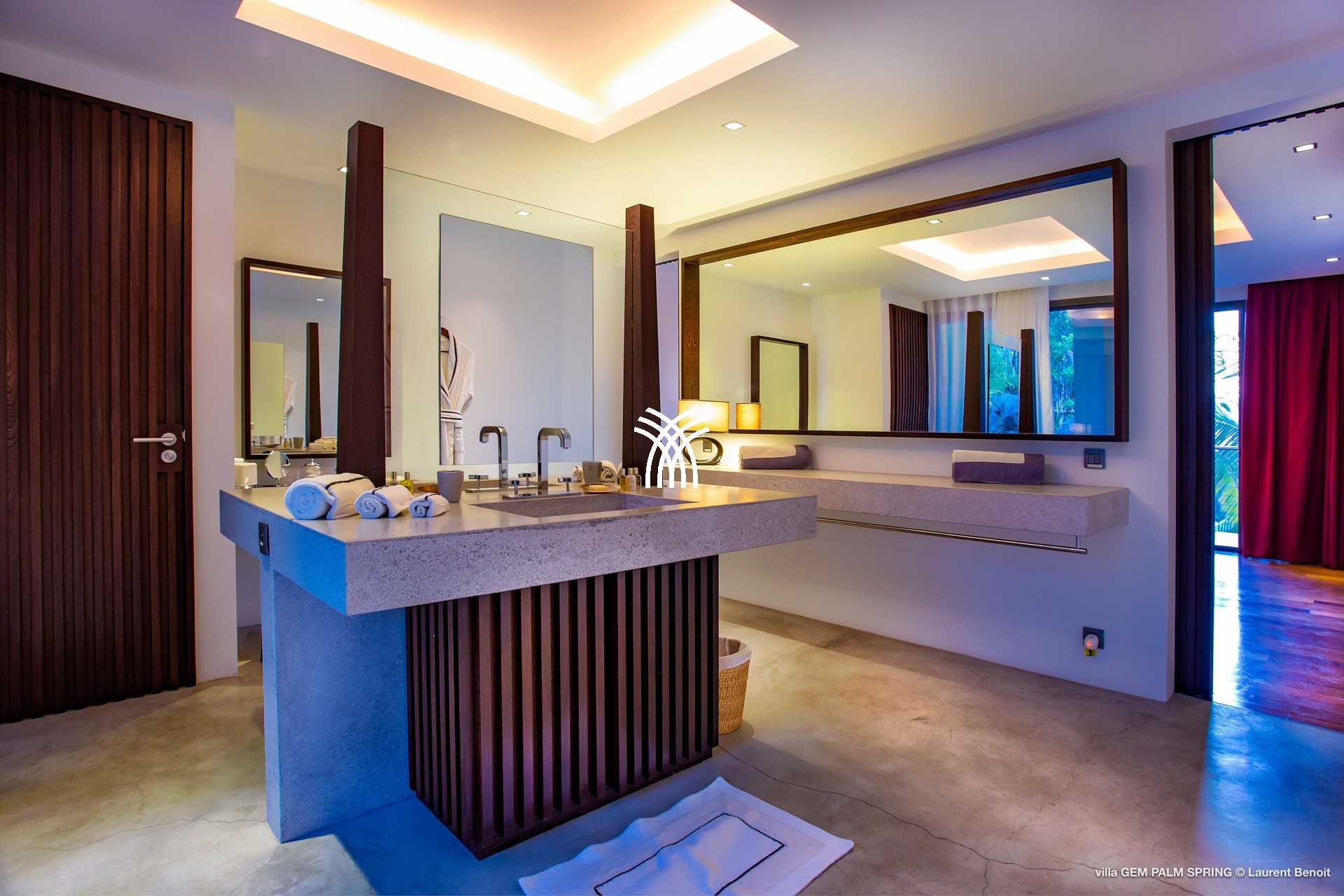 La partie principale se compose d'une cuisine ouverte sur la salon, une terrasse couverte avec table à manger et la chambre principale avec un lit King size, deux dressing ainsi qu'une douche extérieure. Une large terrasse extérieure entoure la piscine et sépare le module principale du bungalow abritant la deuxième chambre avec lit King size et douche extérieure. Les deux dernières chambres se trouvent au niveau inférieur de la villa. La troisième chambre offre un lit King size transformable en lit jumeaux et la quatrième chambre offre un lit King size et une vue dans la piscine! Toutes les chambres ont leur propre salle de bain.