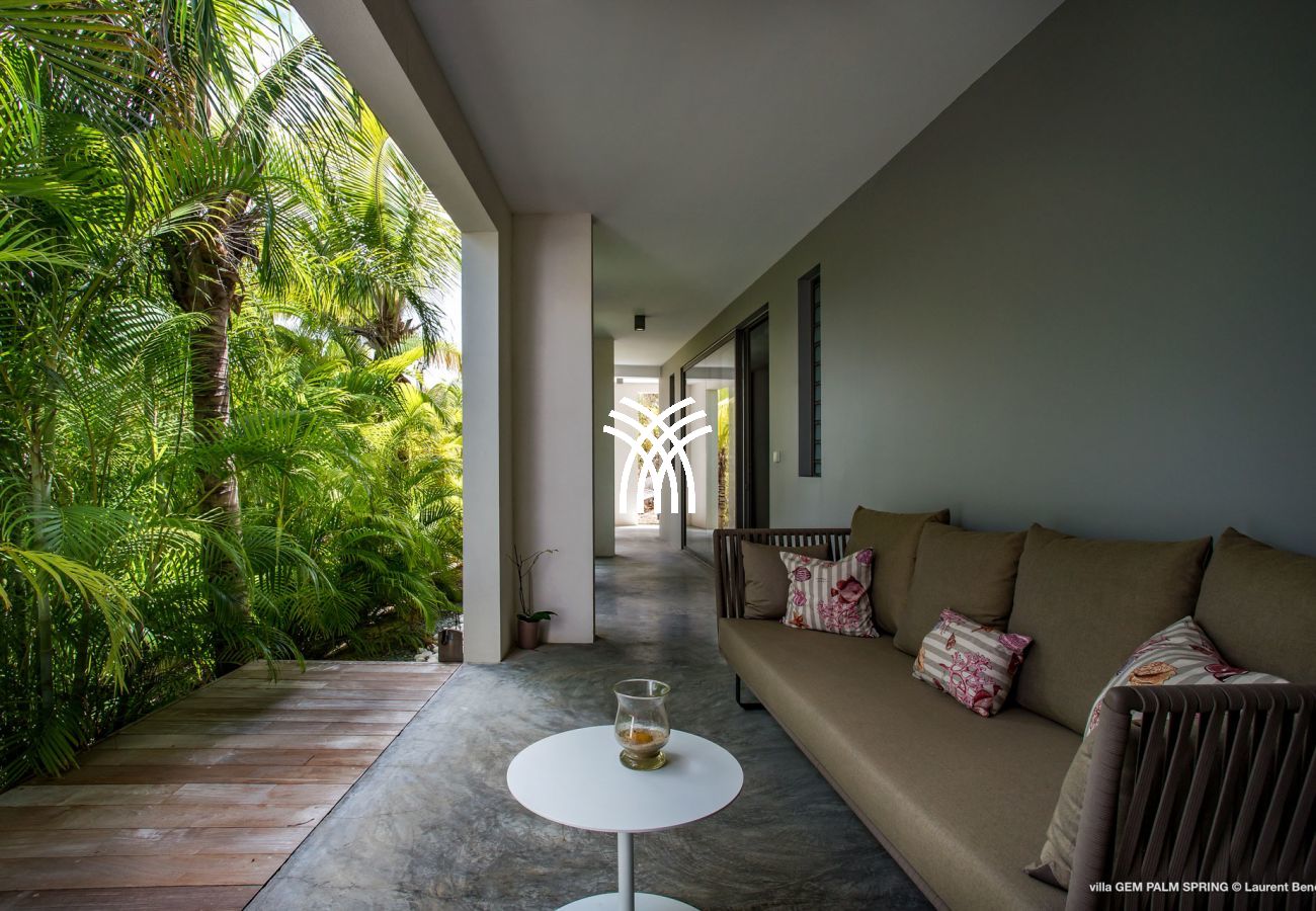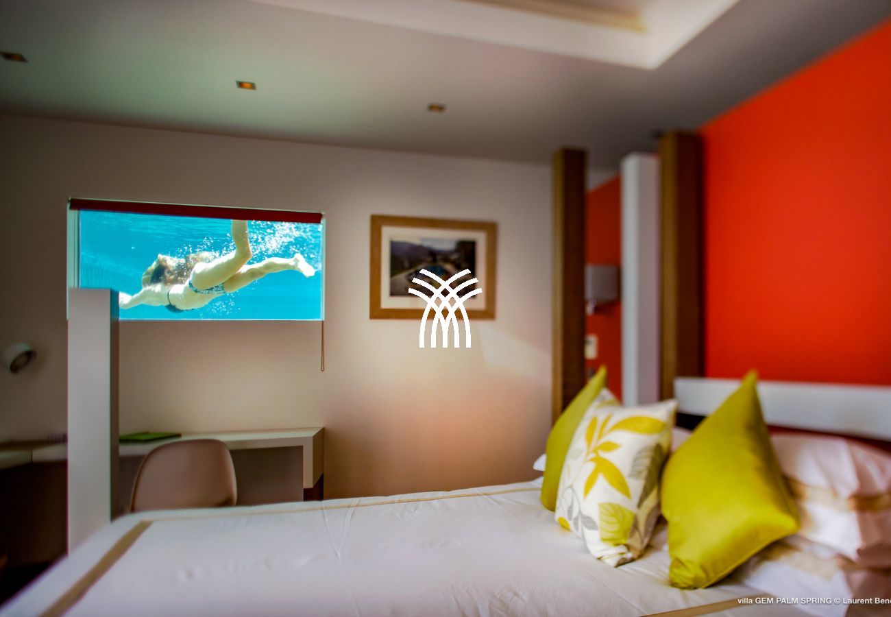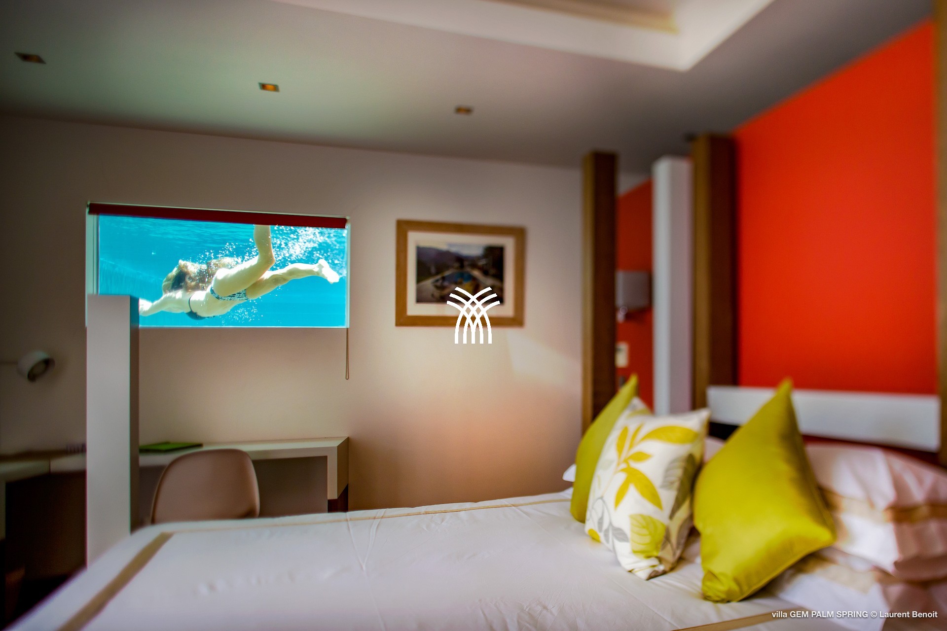 La partie principale se compose d'une cuisine ouverte sur la salon, une terrasse couverte avec table à manger et la chambre principale avec un lit King size, deux dressing ainsi qu'une douche extérieure. Une large terrasse extérieure entoure la piscine et sépare le module principale du bungalow abritant la deuxième chambre avec lit King size et douche extérieure. Les deux dernières chambres se trouvent au niveau inférieur de la villa. La troisième chambre offre un lit King size transformable en lit jumeaux et la quatrième chambre offre un lit King size et une vue dans la piscine! Toutes les chambres ont leur propre salle de bain.