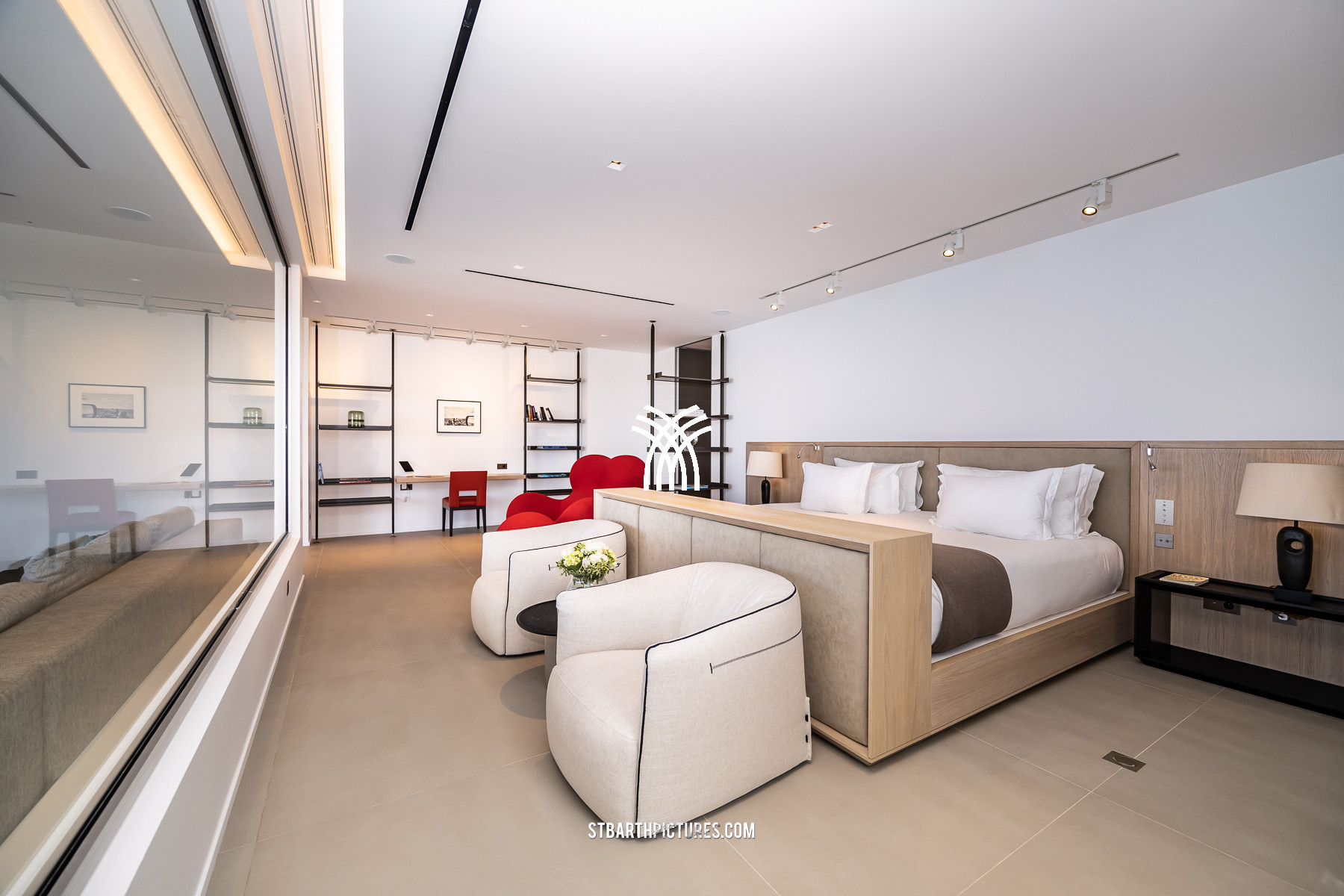 La villa dispose de cinq chambres, dont deux au niveau principal avec un accès direct à la piscine et à la terrasse. Deux autres chambres se trouvent à l’étage supérieur, avec une vue encore plus époustouflante sur l’océan. Chacune est équipée d’un lit king-size, d’une salle de bains privative et d’une décoration sobre et élégante. La cinquième chambre est située au niveau inférieur, proche de la salle de sport et du garage privé, offrant calme et intimité supplémentaire.