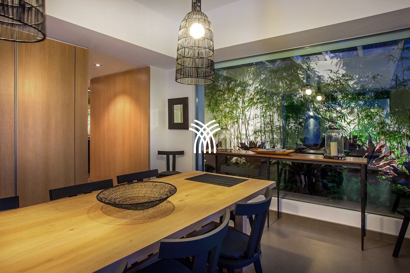 La propriété comprend également la villa Petit Lagon, qui ajoute deux chambres supplémentaires avec salles de bains attenantes, une cuisine compacte et un salon ouvert sur l’extérieur. Les larges baies vitrées et portes en bois créent une harmonie parfaite entre intérieur et extérieur, permettant de profiter pleinement des alizés et de la vue tropicale. Une piscine privée entourée d’une terrasse en bois, un barbecue et des espaces lounge invitent à la convivialité et à la détente sous le ciel étoilé des Caraïbes.