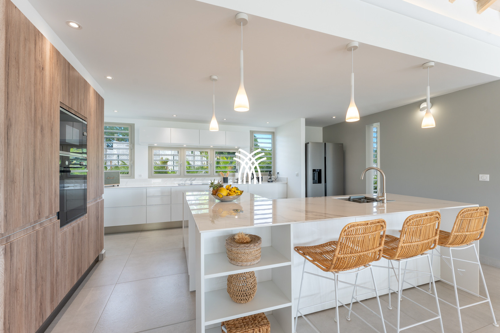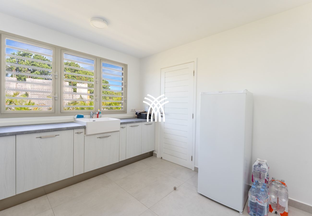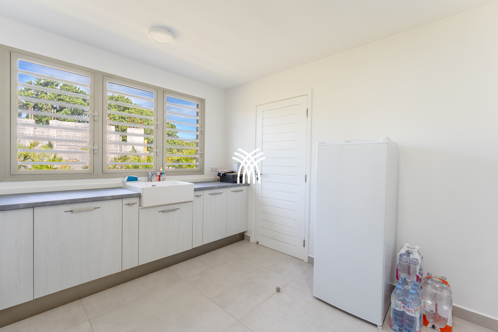La cuisine moderne, entièrement équipée, est parfaite pour préparer des repas gourmands à partager sur la terrasse ou autour du barbecue au gaz Weber. Pour votre confort, la villa dispose également d'une grande buanderie avec lave-linge, sèche-linge et tout l'équipement nécessaire pour simplifier votre quotidien.