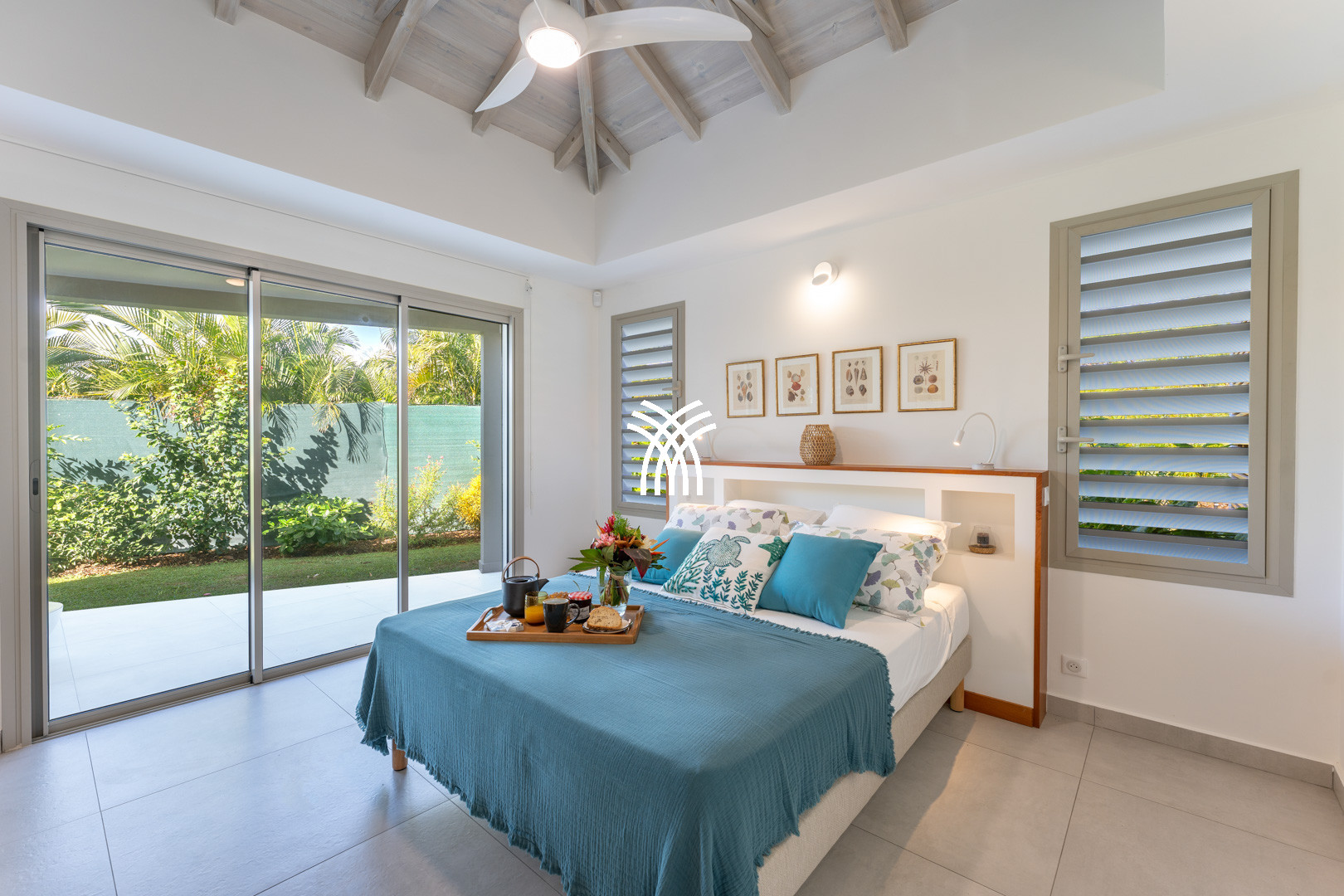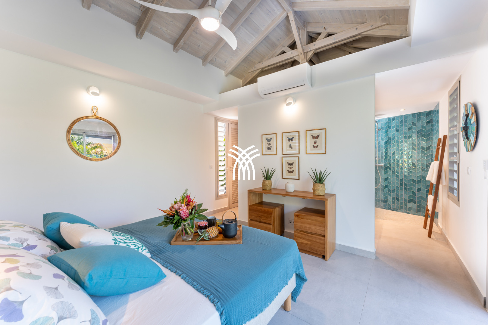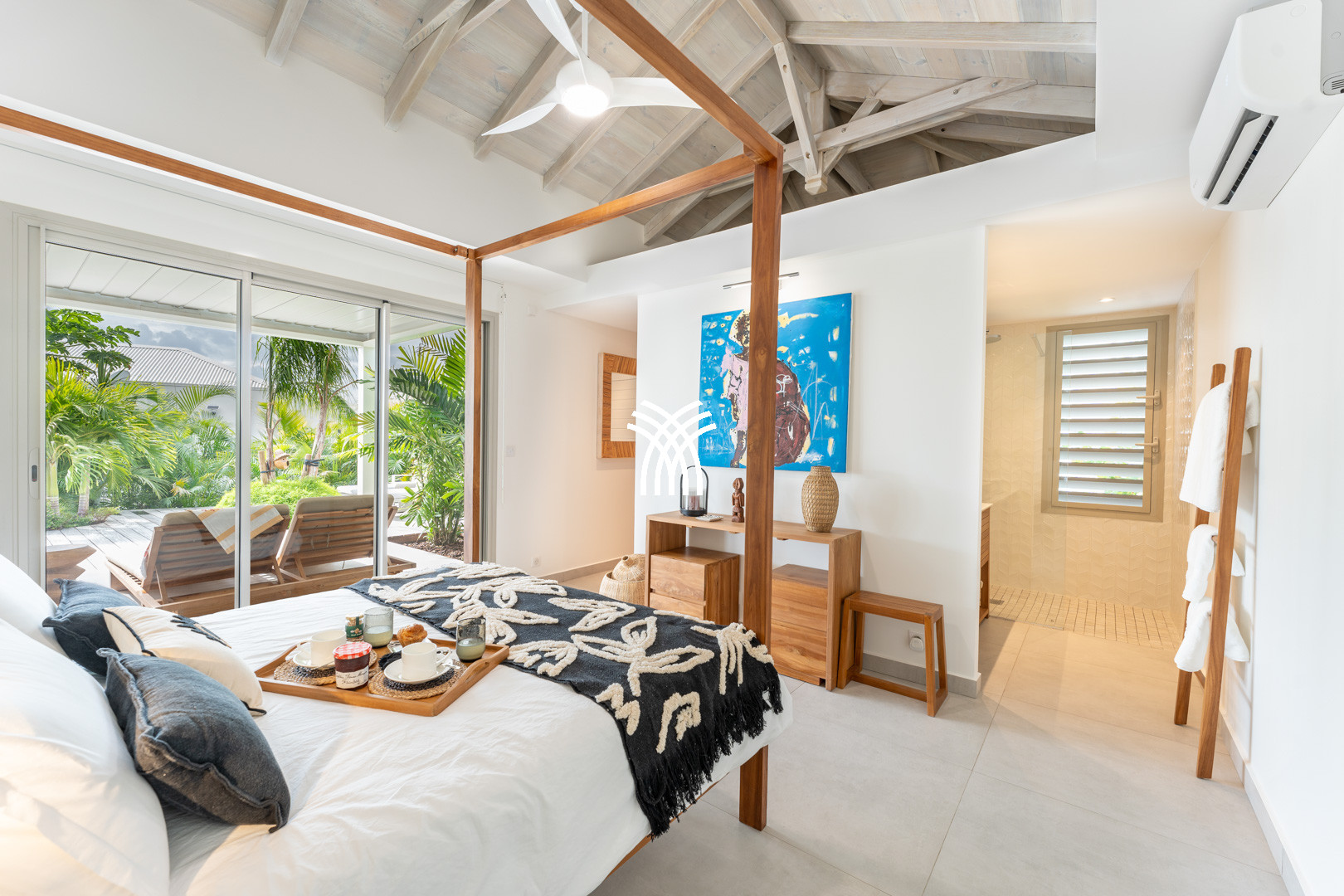La villa Abawak, de plain-pied, dispose de 4 chambres climatisées décorées avec goût pour offrir confort et sérénité. La suite parentale principale est un véritable cocon avec lit king-size, dressing et salle d'eau privée. Une seconde suite parentale offre une expérience unique avec une douche en plein air sous le ciel étoilé de la Guadeloupe.
