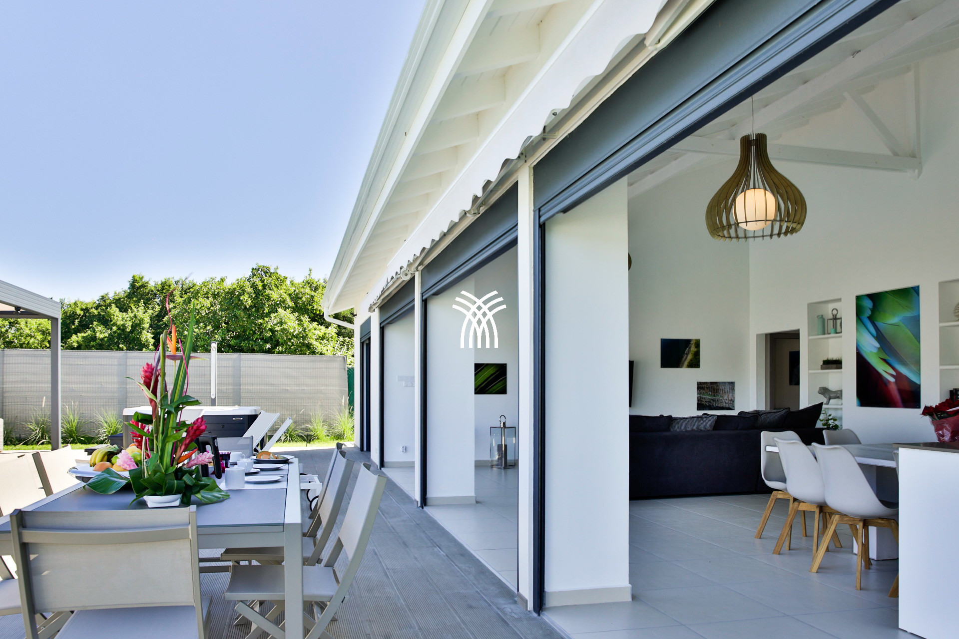 L’espace extérieur de la villa Abawak est idéal pour se retrouver en famille ou entre amis. La terrasse couverte permet de partager des repas avec vue sur la piscine au sel et le jardin tropical. Le carbet privé est parfait pour se relaxer autour d'un ti-punch ou de spécialités locales.