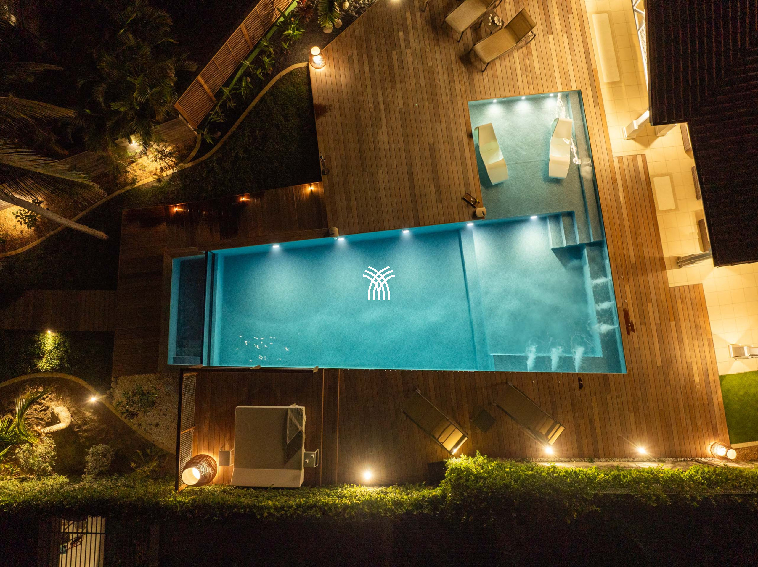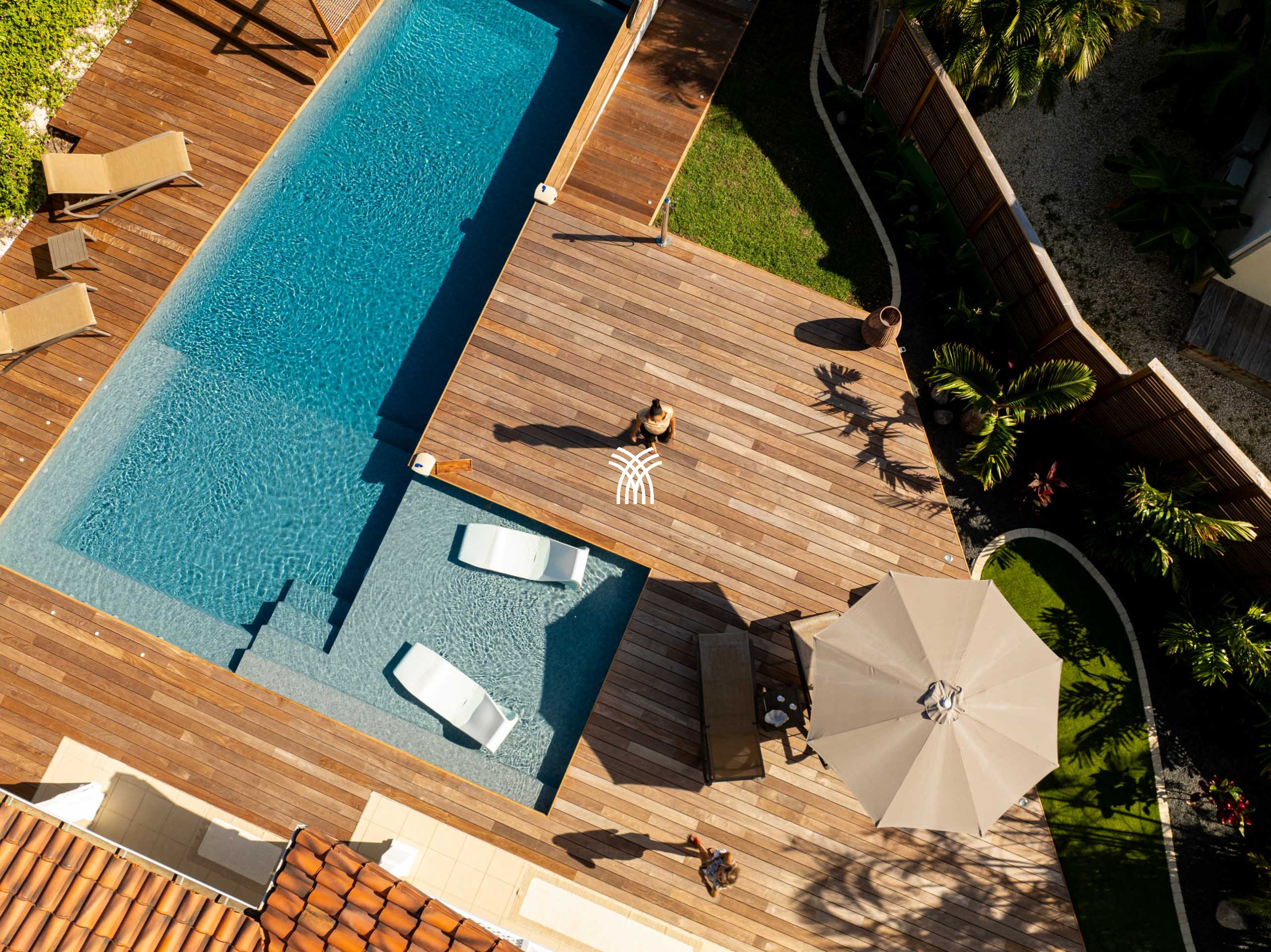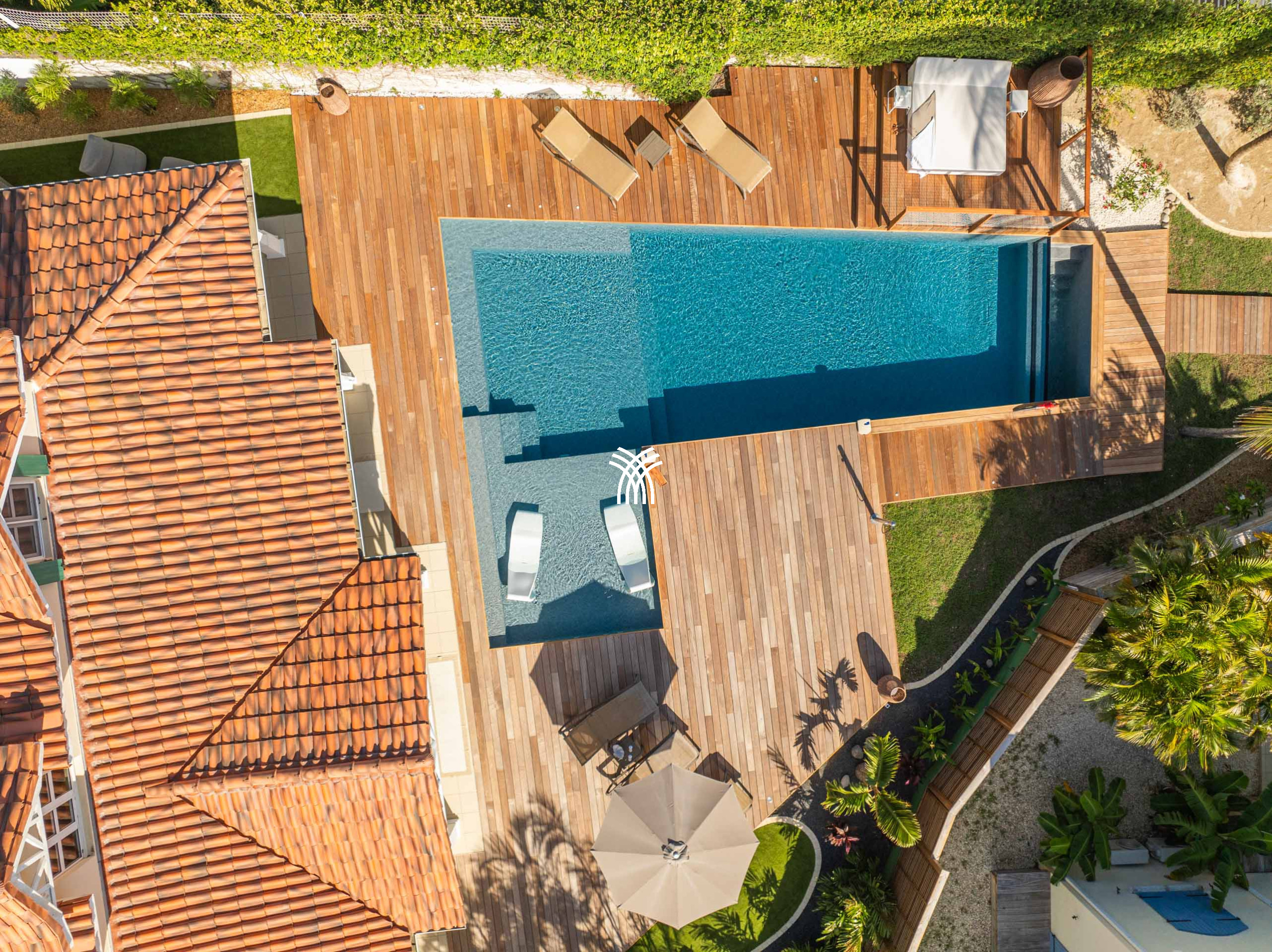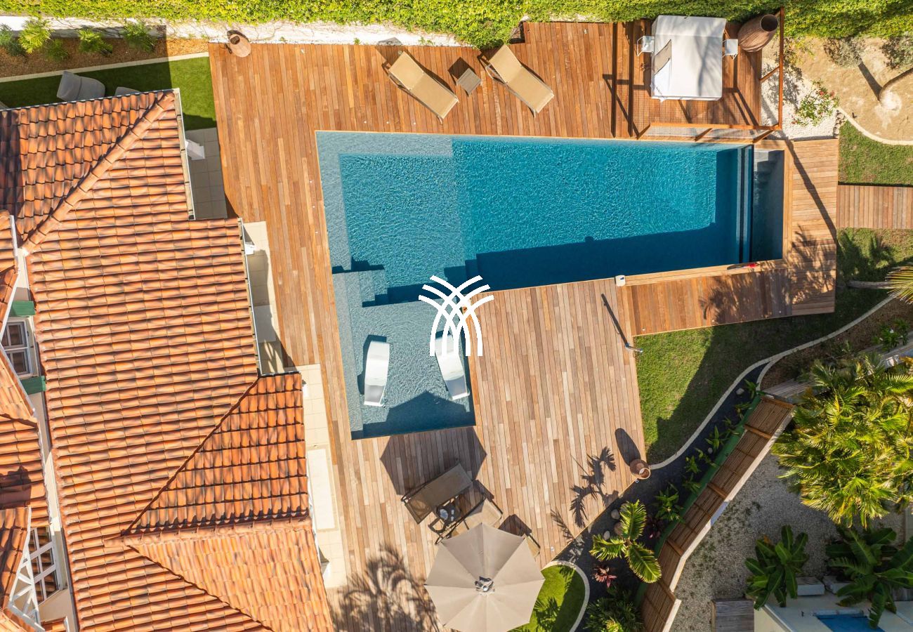 À l’extérieur, la Villa Gwadaluna révèle une atmosphère encore plus enchanteresse. La piscine de forme originale bordée d’une terrasse en bois tropical devient le théâtre de journées ensoleillées et de soirées paisibles. Les bains de soleil invitent à la détente, tandis que les salons extérieurs ombragés offrent des espaces parfaits pour se retrouver, lire ou savourer un cocktail face au jardin. Une grande table en bois accueille les repas en plein air, rythmés par les parfums des fleurs tropicales et le chant discret des oiseaux. Un hamac niché entre les arbres promet des moments de lâcher-prise absolu, enveloppés par la nature.