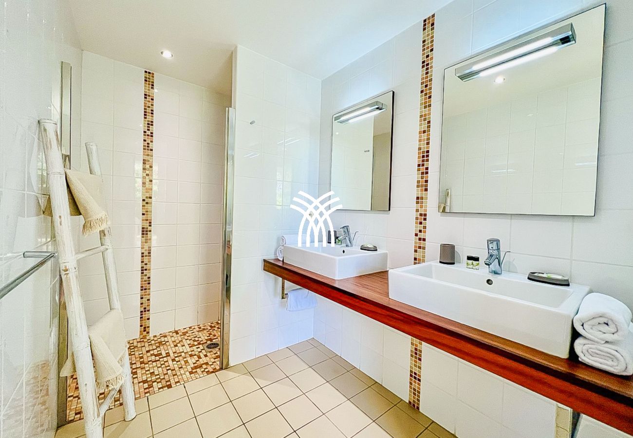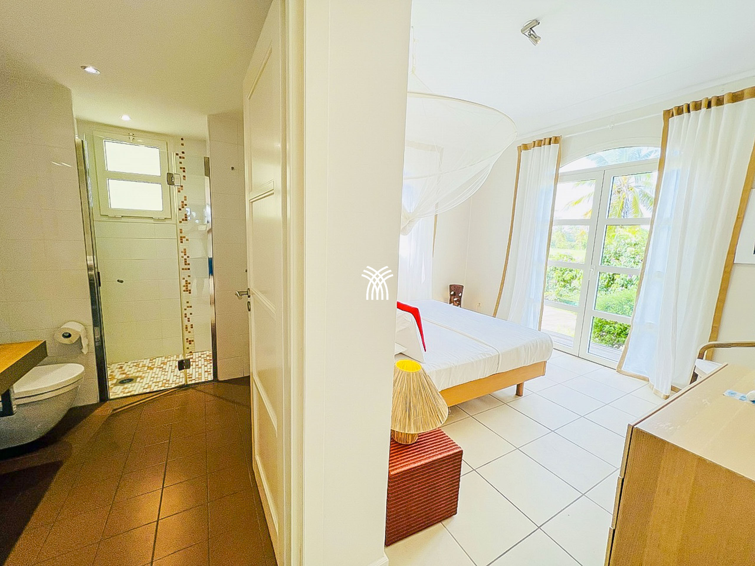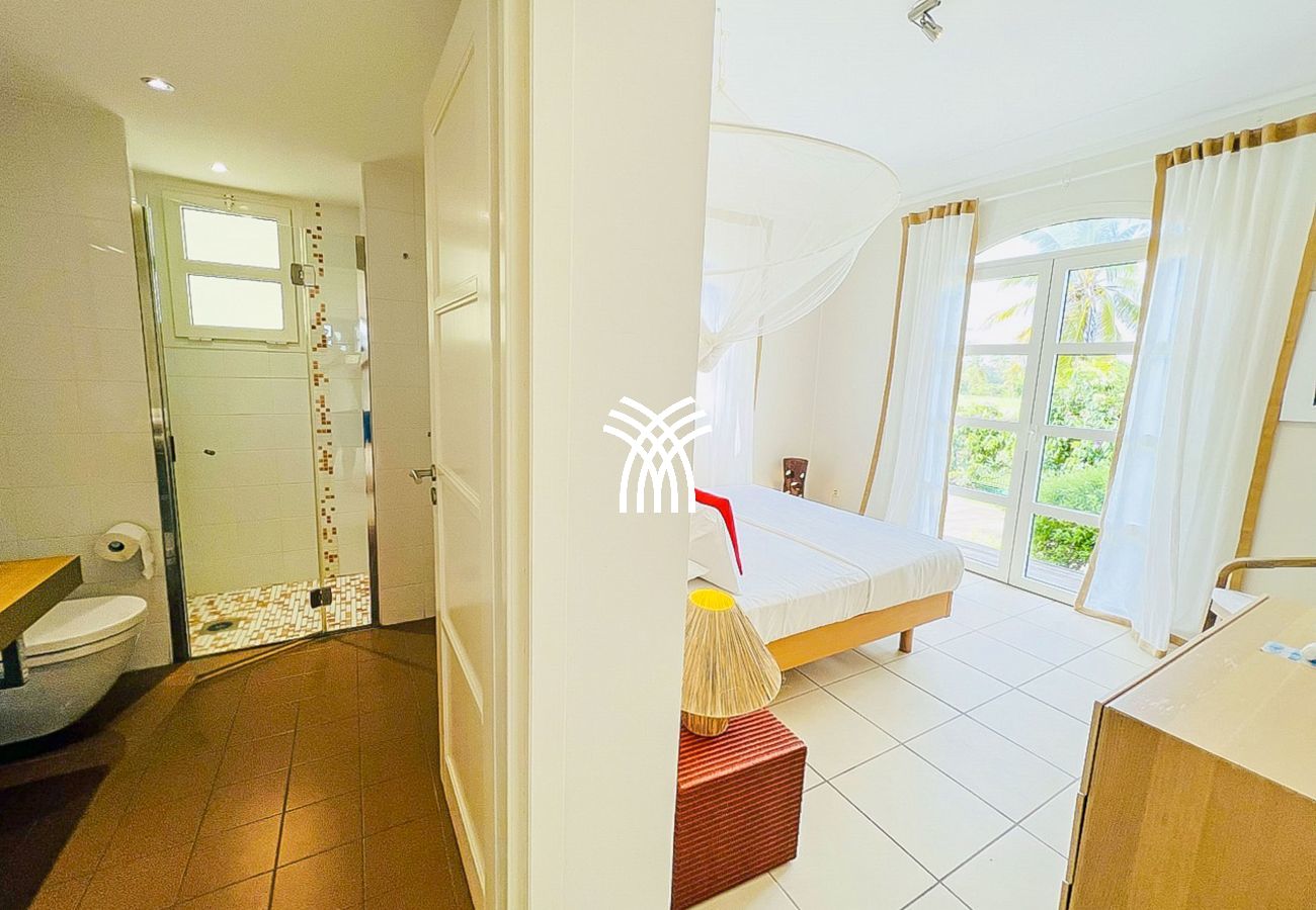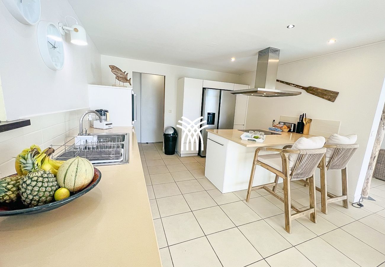 La villa principale abrite trois chambres climatisées, chacune dotée de sa salle de bain privative, offrant un niveau de confort adapté aux familles comme aux groupes d’amis. Le cottage, entièrement rénové, propose deux suites élégantes avec salle d’eau et WC privés, permettant à chacun de profiter d’une totale intimité tout en partageant un lieu d’exception. La cuisine ouverte en bois exotique, prolongée d’un passe-plat convivial et de tabourets façon comptoir, devient un véritable cœur de vie pour cuisiner, discuter, déguster et créer des souvenirs.