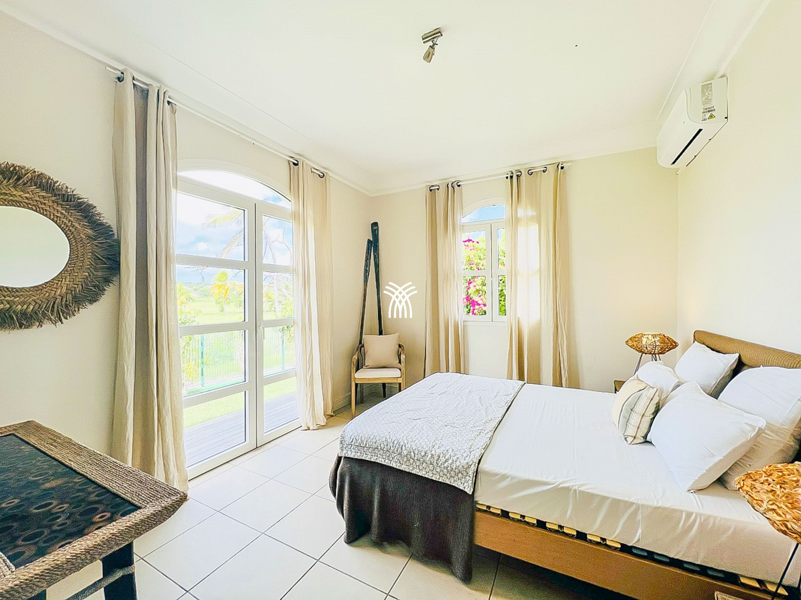 À l’étage, une grande suite avec vue sur le golf dispose d’une salle de bain attenante, d’un WC séparé, d’un dressing et d’un coin bureau. Deux autres chambres offrent une vue imprenable sur la mer et disposent chacune de leur propre terrasse, salle de bain et espaces de rangement.