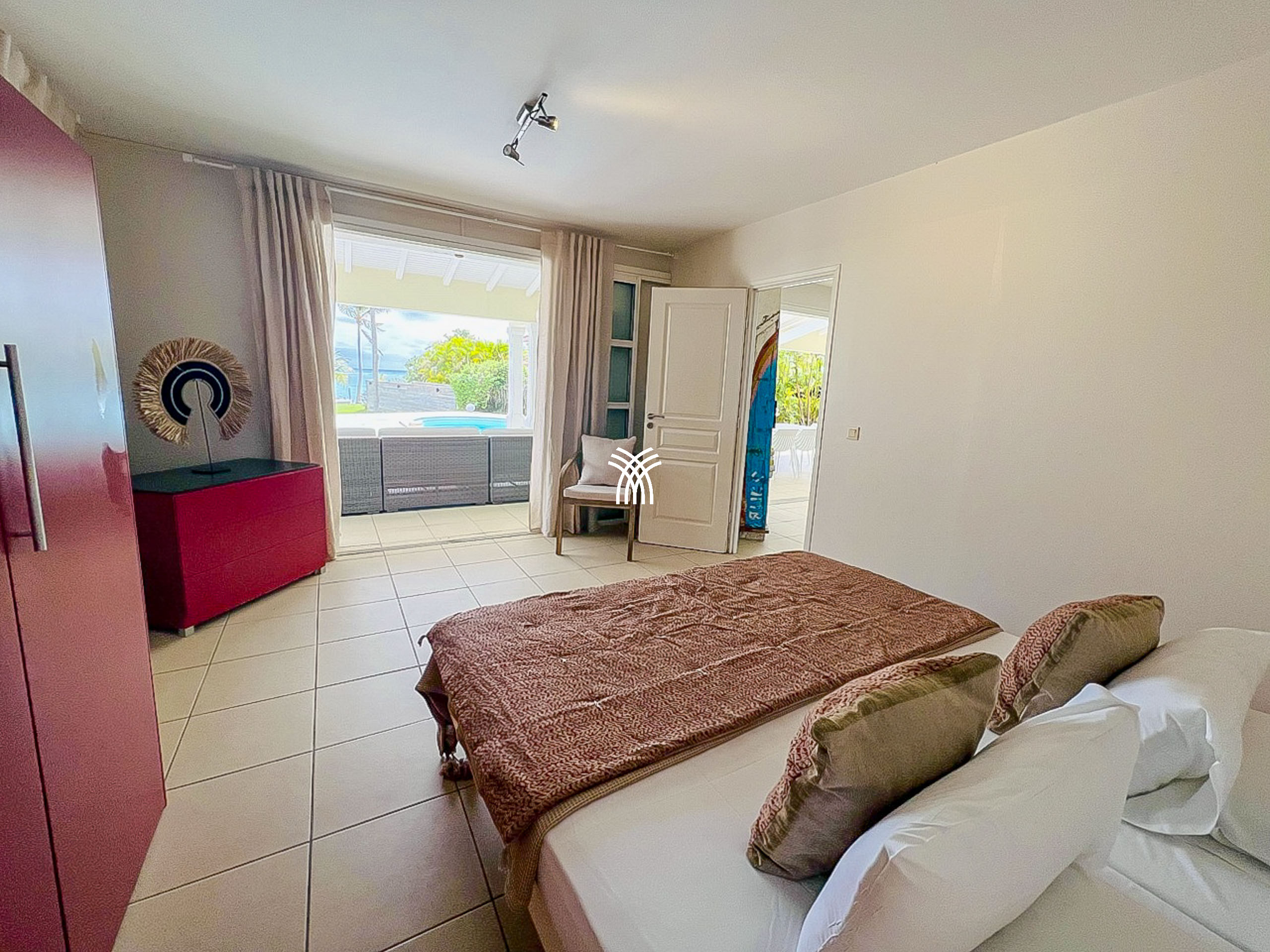 Dans le jardin, une piscine entourée d’un deck en bois et un jacuzzi offrent un cadre de détente unique face au lagon. Une terrasse en bois, bordée de cocotiers, dispose de transats pour se prélasser et profiter de la vue imprenable sur la plage.