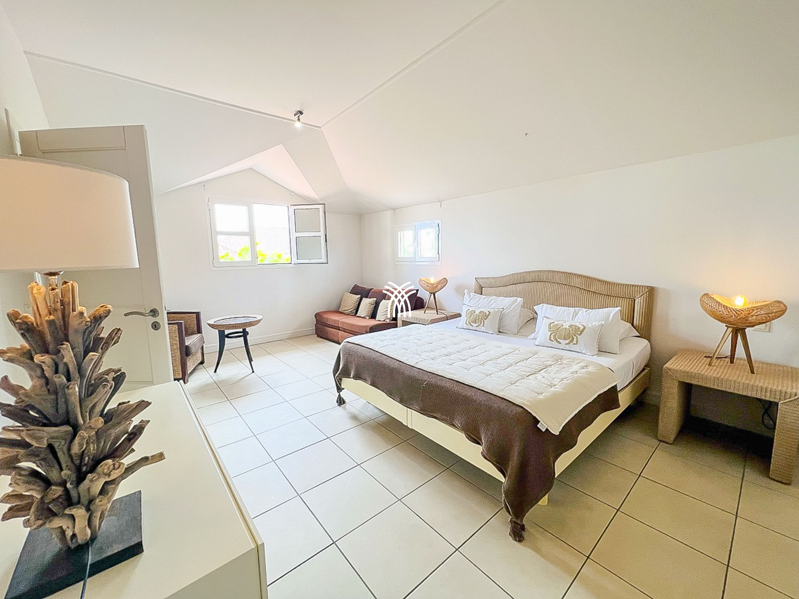 Conçue comme un refuge familial haut de gamme, la Villa Gwadaluna se compose d’une villa principale et d’un cottage indépendant, permettant d’accueillir confortablement jusqu’à douze personnes. Les espaces de vie, ouverts sur la nature, laissent circuler la lumière et la brise marine. Cette architecture ventilée, typique des demeures créoles, offre un cadre apaisant pour ceux qui souhaitent profiter d’une location de villa luxe à Saint-François, entre modernité et traditions locales. Les volets et portes en bois massif, les tissus clairs et les finitions naturelles renforcent l’atmosphère sereine d’une maison pensée pour le bien-être.