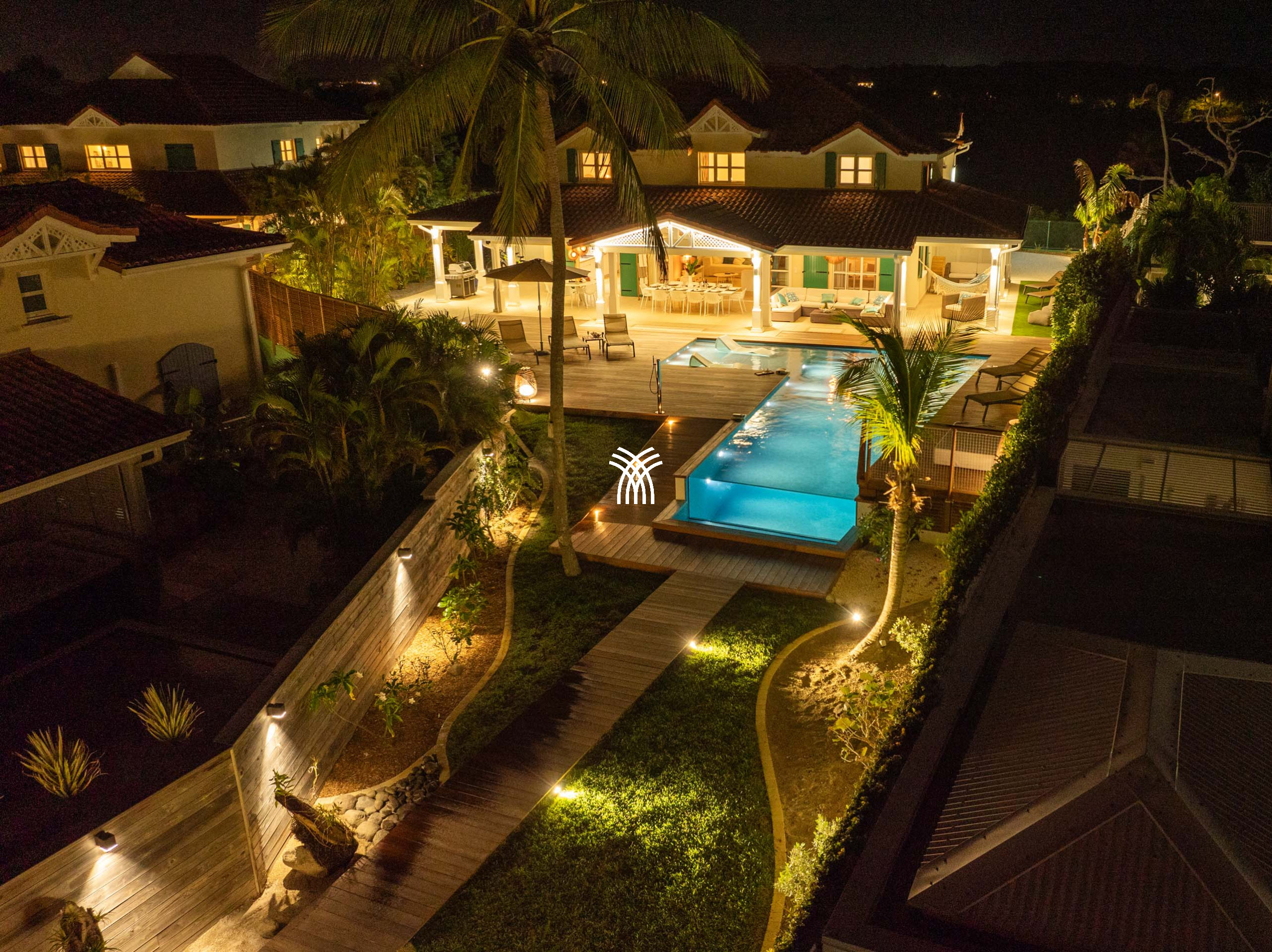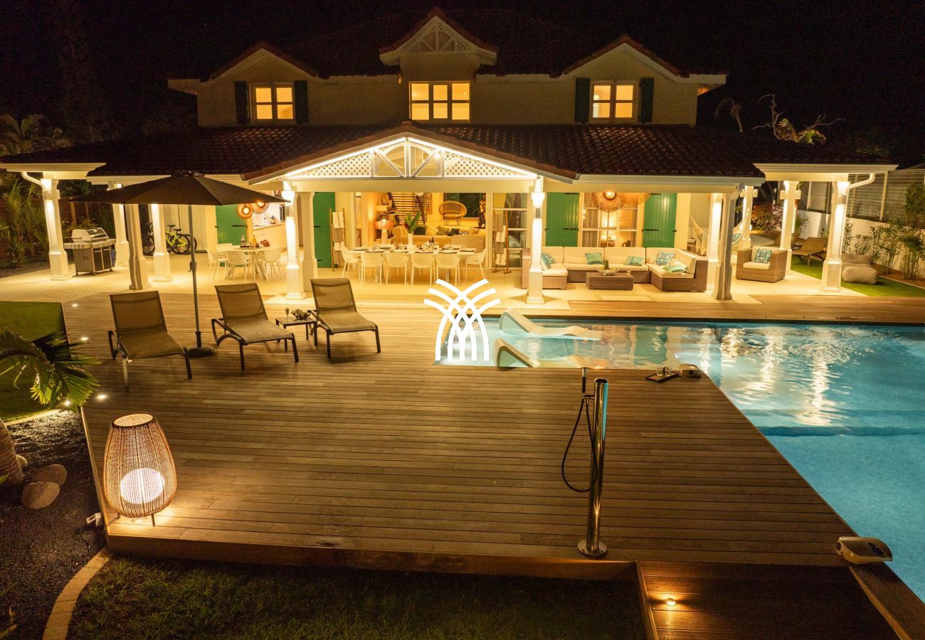 La Villa Gwadaluna invite à vivre une expérience rare, où l’élégance créole rencontre le confort contemporain dans l’un des environnements les plus recherchés pour une location de villa luxe en Guadeloupe. Située à Saint-François, à seulement quelques minutes de la plage de la Coulée et du golf international, cette adresse confidentielle conjugue atmosphère tropicale, douceur de vivre et raffinement naturel. La propriété s’étend au cœur d’un jardin luxuriant où chaque plante, chaque souffle d’alizé et chaque rayon de soleil rappelle l’esprit authentique des maisons antillaises.