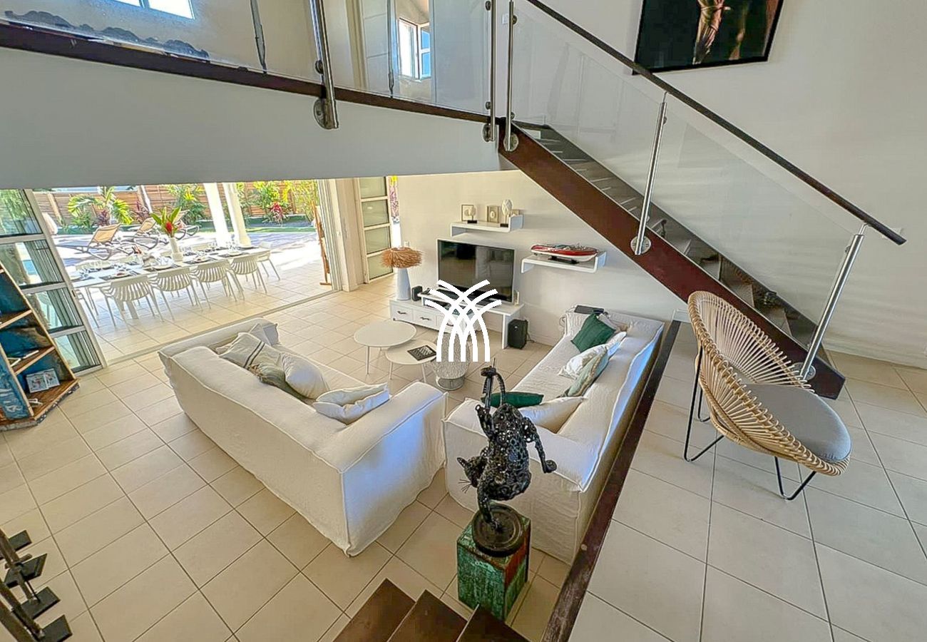 La villa Caribe, située à Saint-François dans un domaine privé, est une location de luxe idéale pour des vacances inoubliables en Guadeloupe. Cette somptueuse villa de grand standing peut accueillir jusqu’à 12 personnes, ce qui en fait un lieu parfait pour les grandes familles avec enfants ou les groupes d’amis. Avec une surface totale de 330 m², terrasse couverte incluse, la villa s’organise autour d’un vaste salon-séjour ouvert sur l’extérieur. Cet espace de convivialité est idéal pour partager des moments uniques tout en profitant des équipements multimédias modernes.