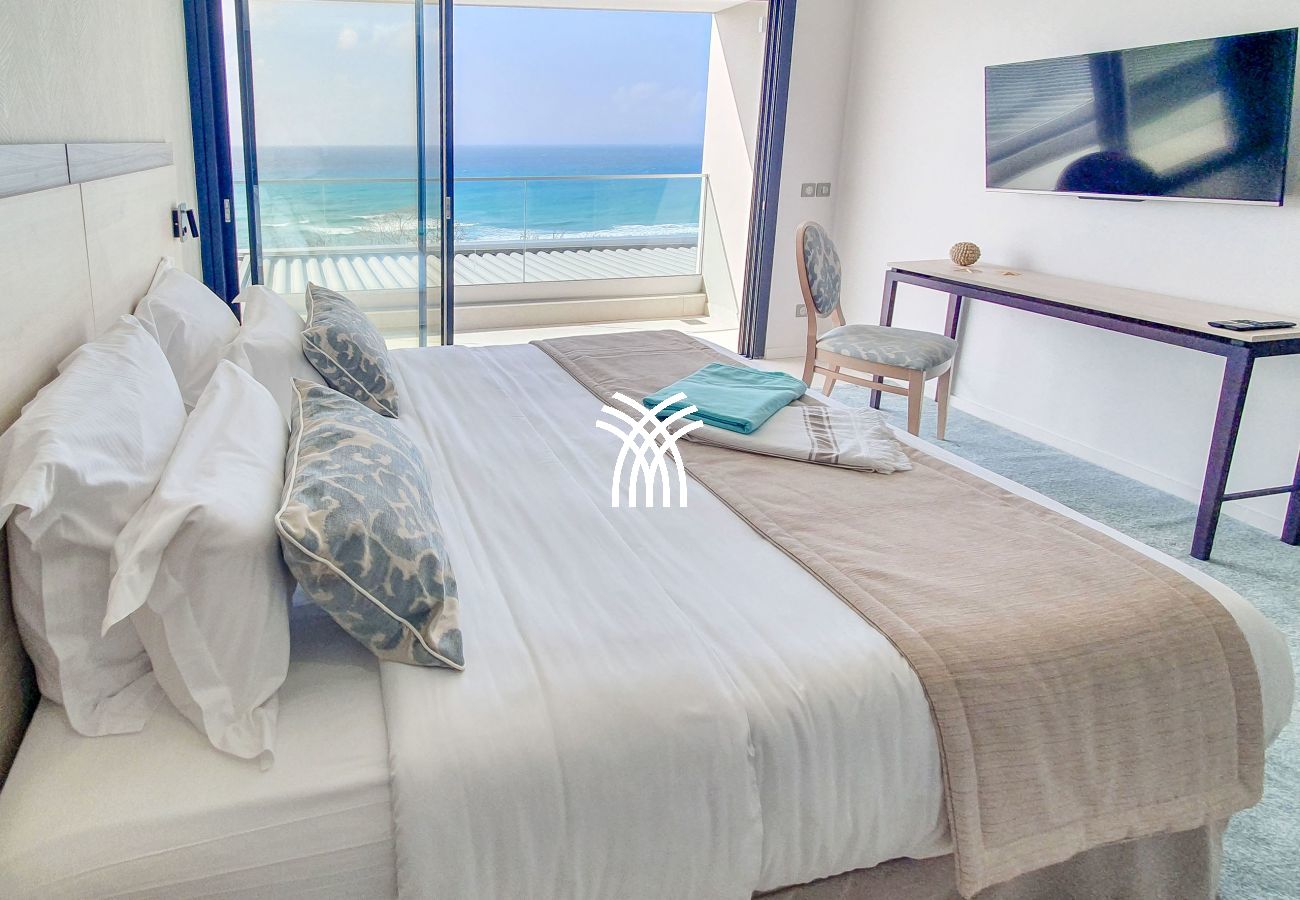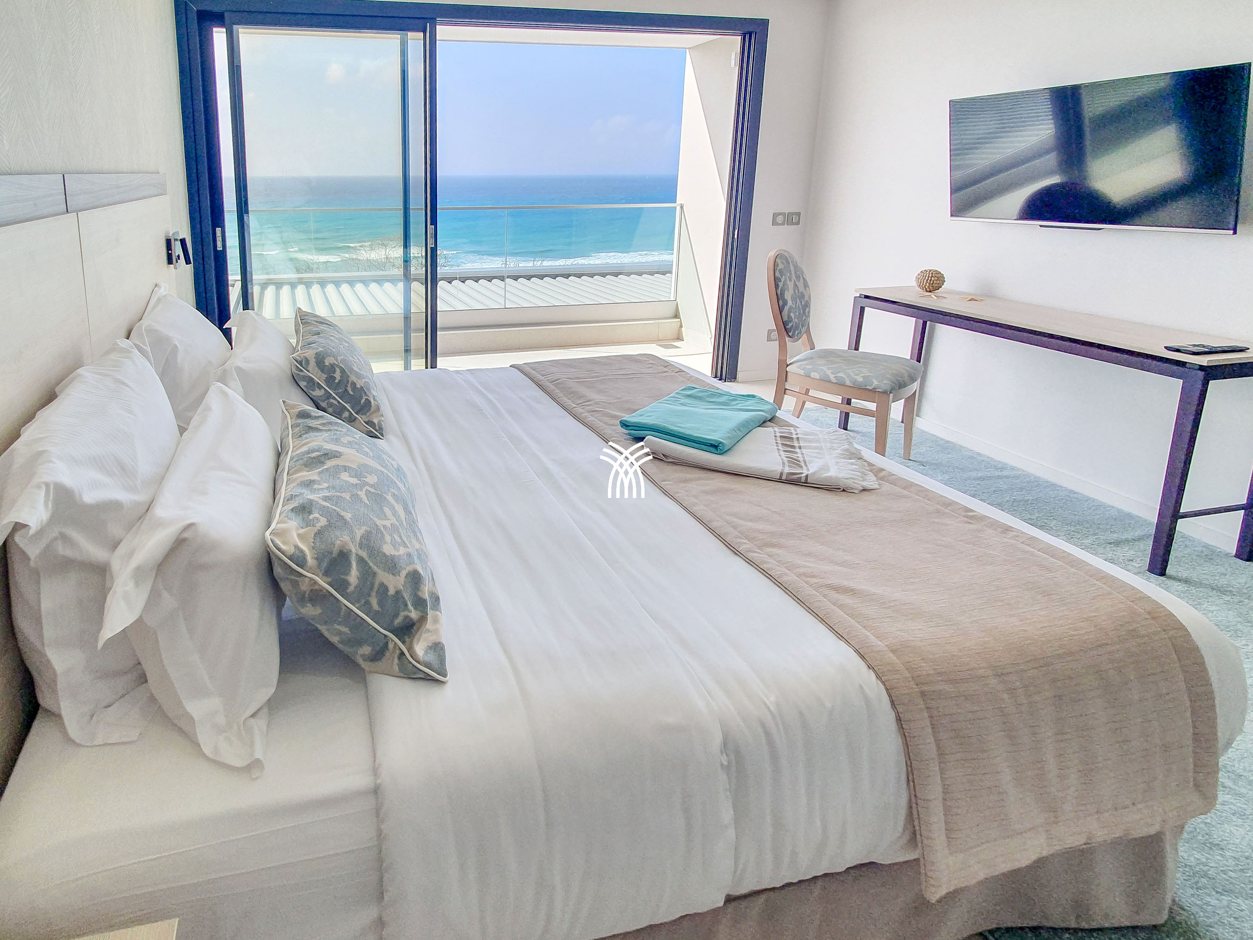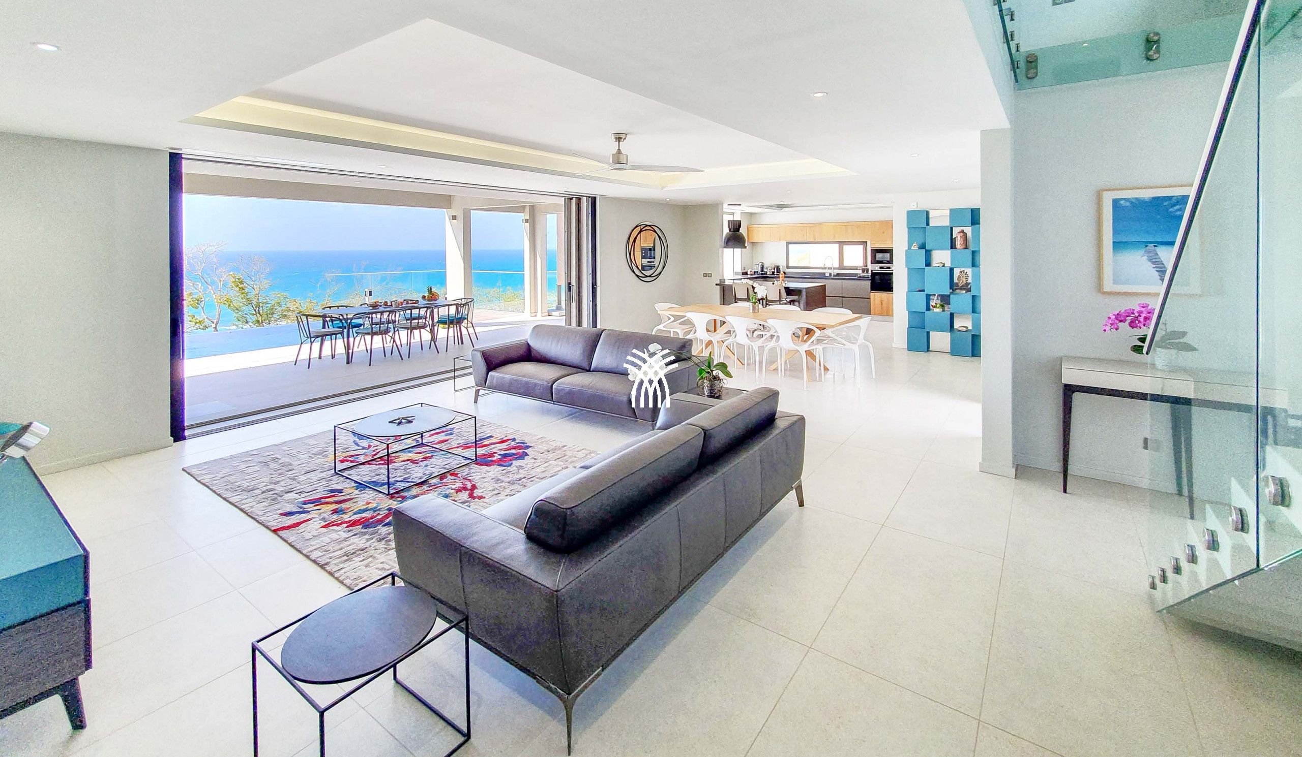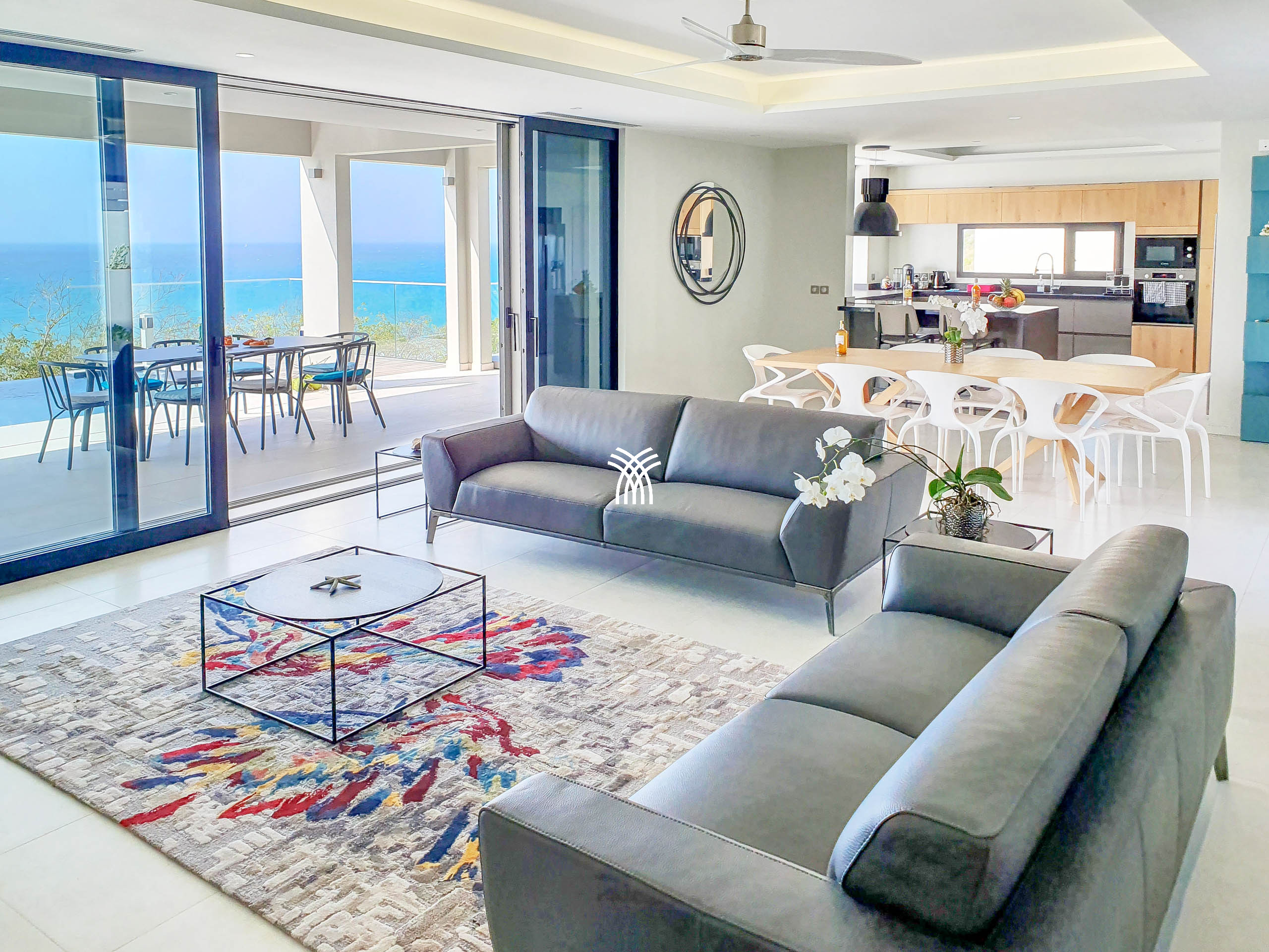 Au rez-de-chaussée, la villa propose une cuisine entièrement équipée ouverte sur un spacieux salon et une salle à manger, tous orientés vers la mer pour profiter d’un panorama à couper le souffle. Sur la terrasse, une grande table et un espace apéritif sont parfaits pour partager des moments de convivialité. La piscine à débordement semble se fondre dans l’océan, créant une expérience visuelle et sensorielle inoubliable.