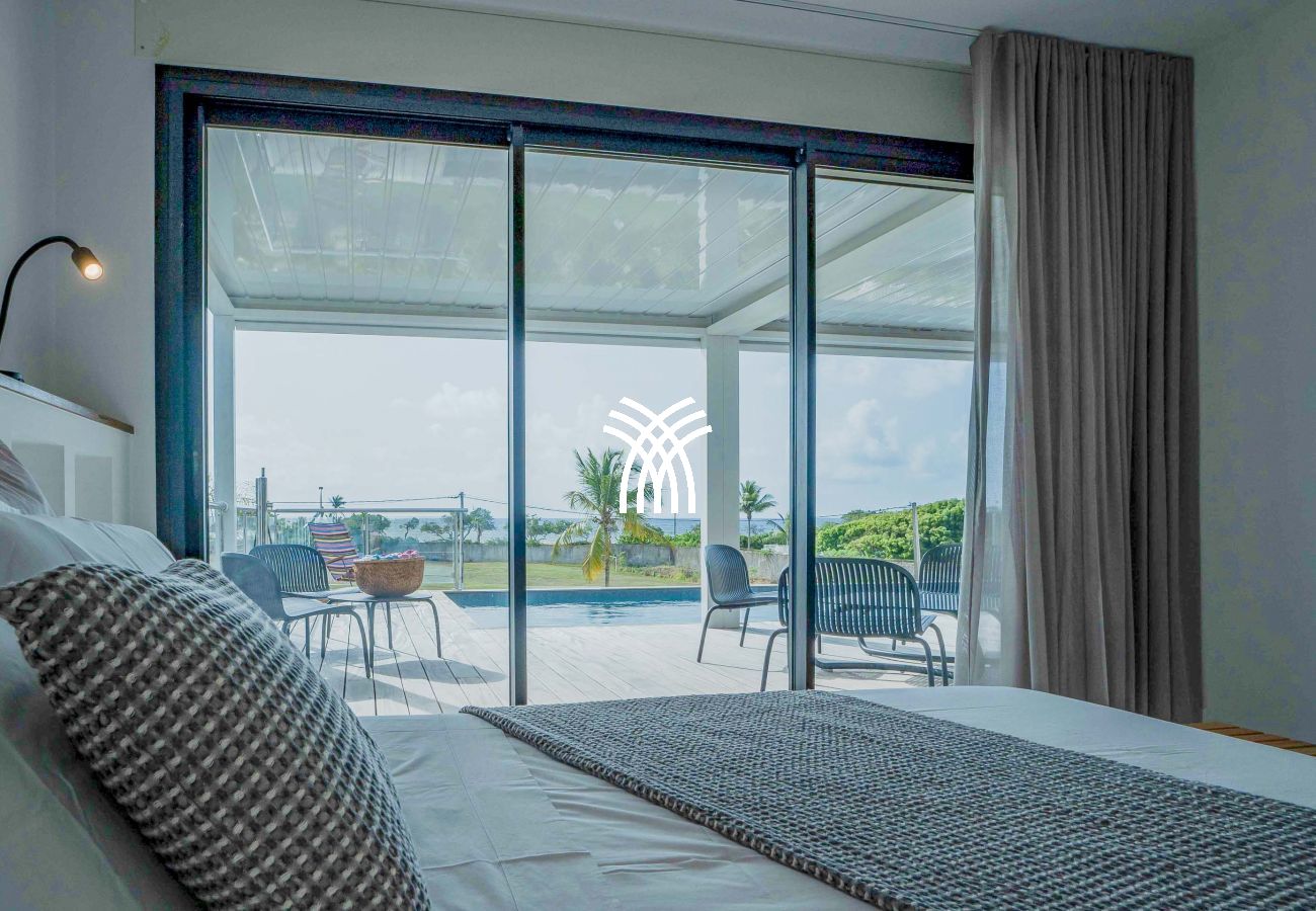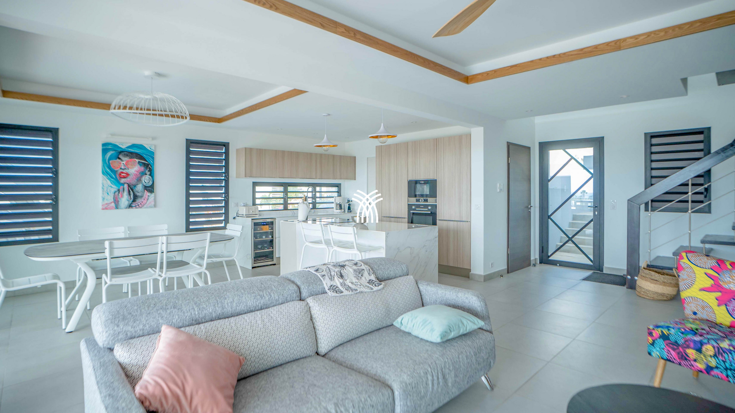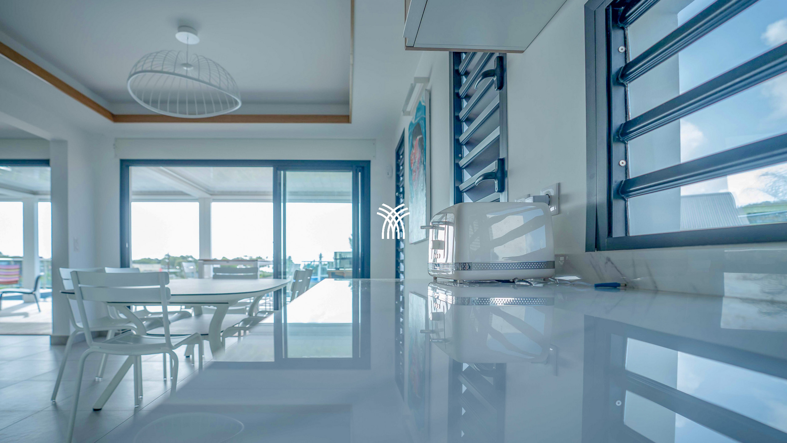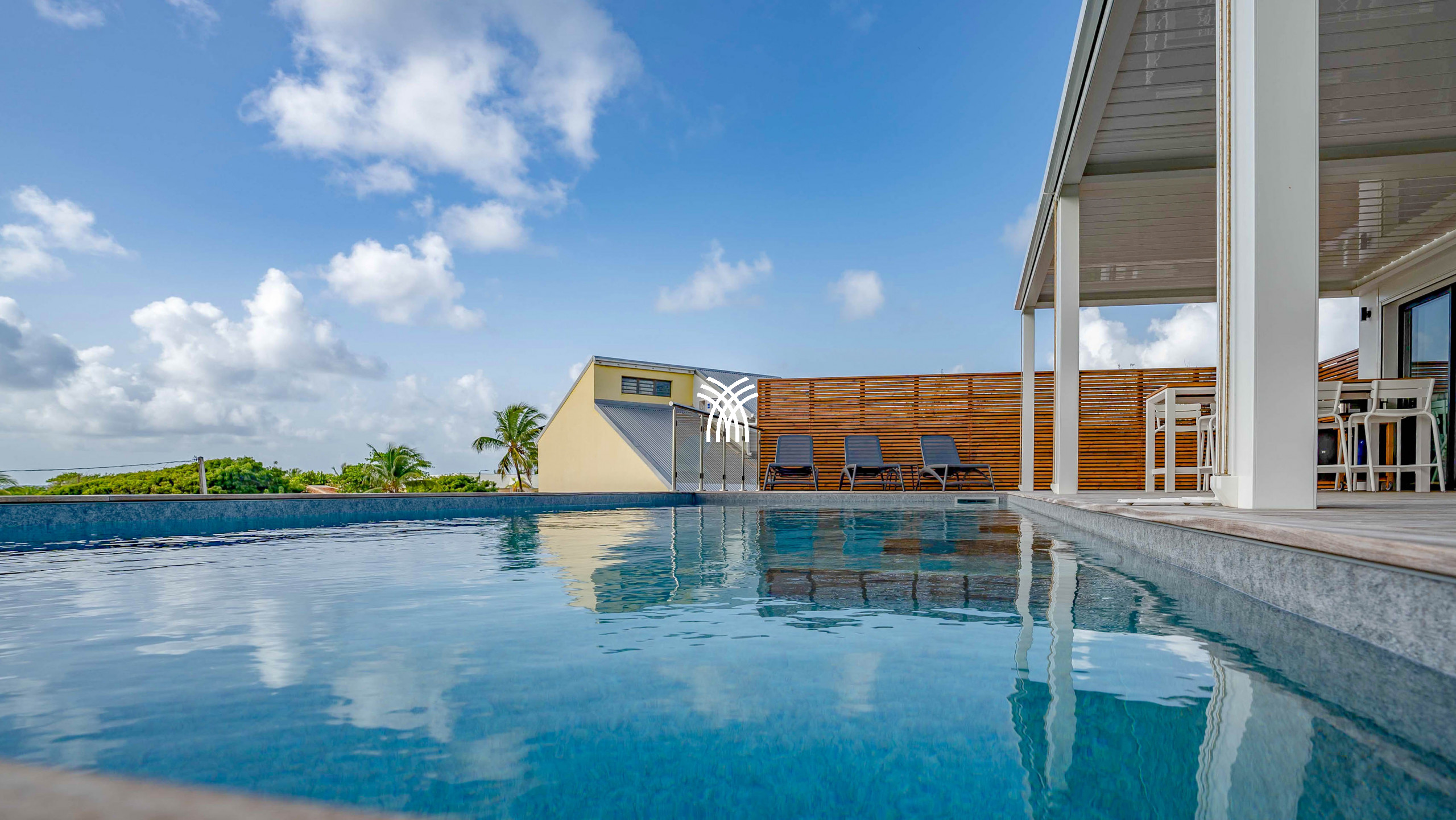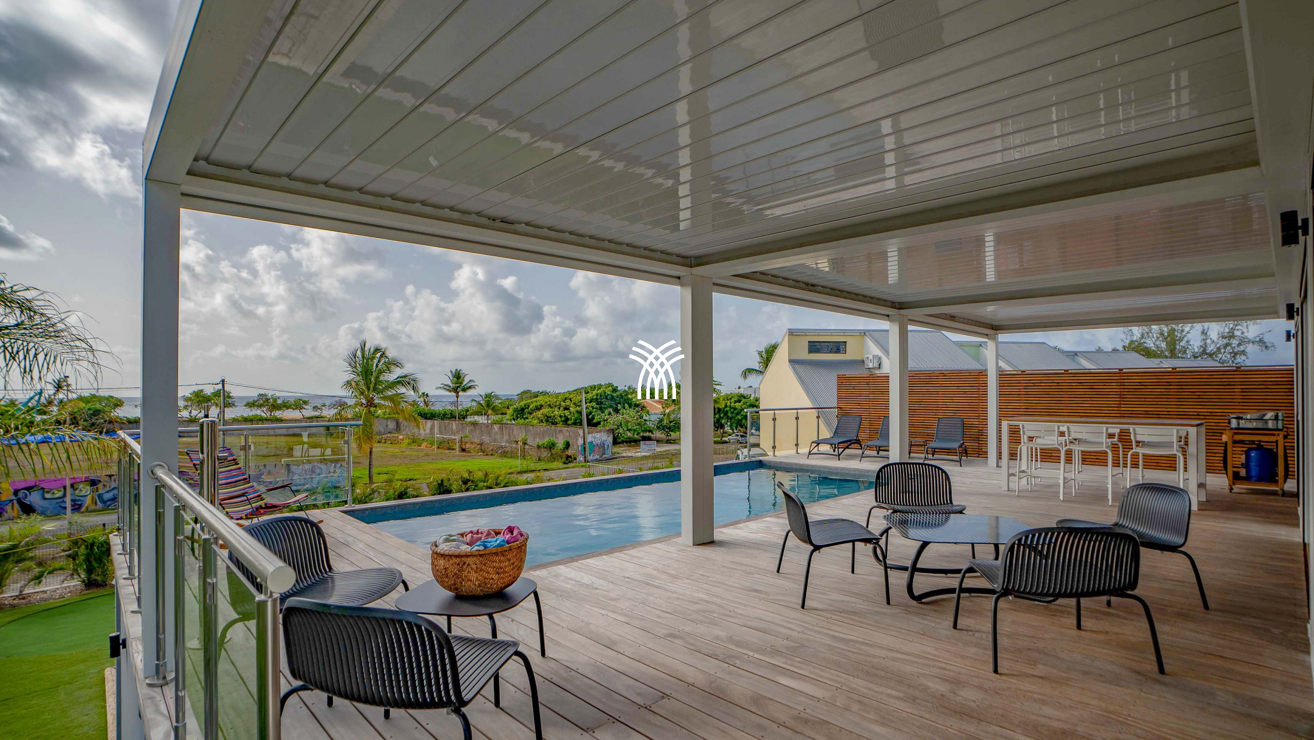 La Villa Katorz est une villa de charme en Guadeloupe située à Saint-François, offrant une vue mer panoramique et une belle piscine privée au sel de 5x10m. Pensée pour des séjours en toute sérénité, cette location de villa à Saint-François combine confort moderne et ambiance créole dans un cadre verdoyant et intime. La pièce de vie spacieuse s’ouvre sur une terrasse couverte donnant sur la piscine et un carbet, parfaits pour profiter de la douceur des soirées guadeloupéennes face à la mer.