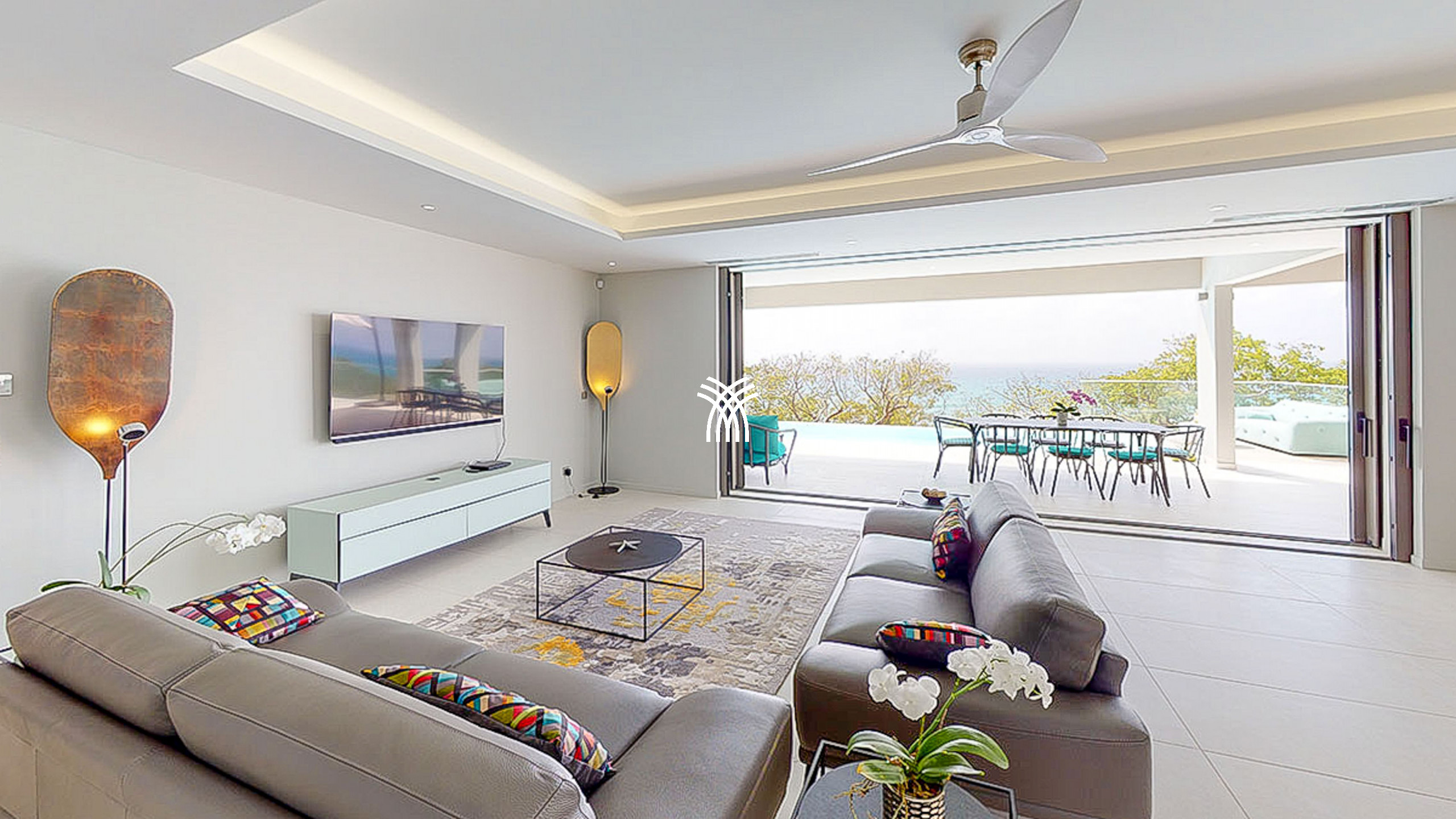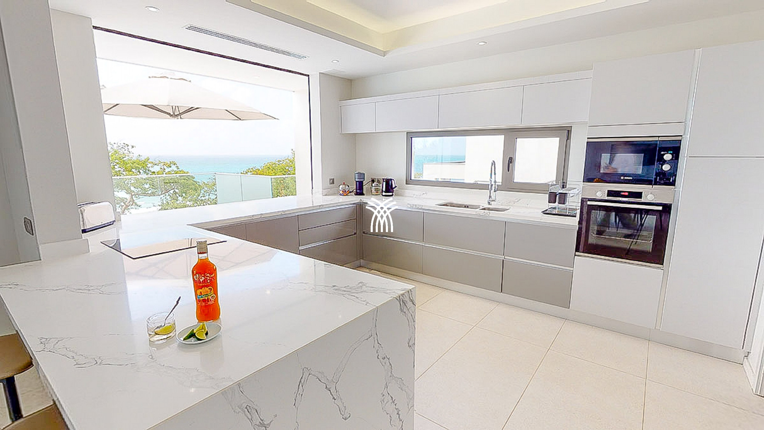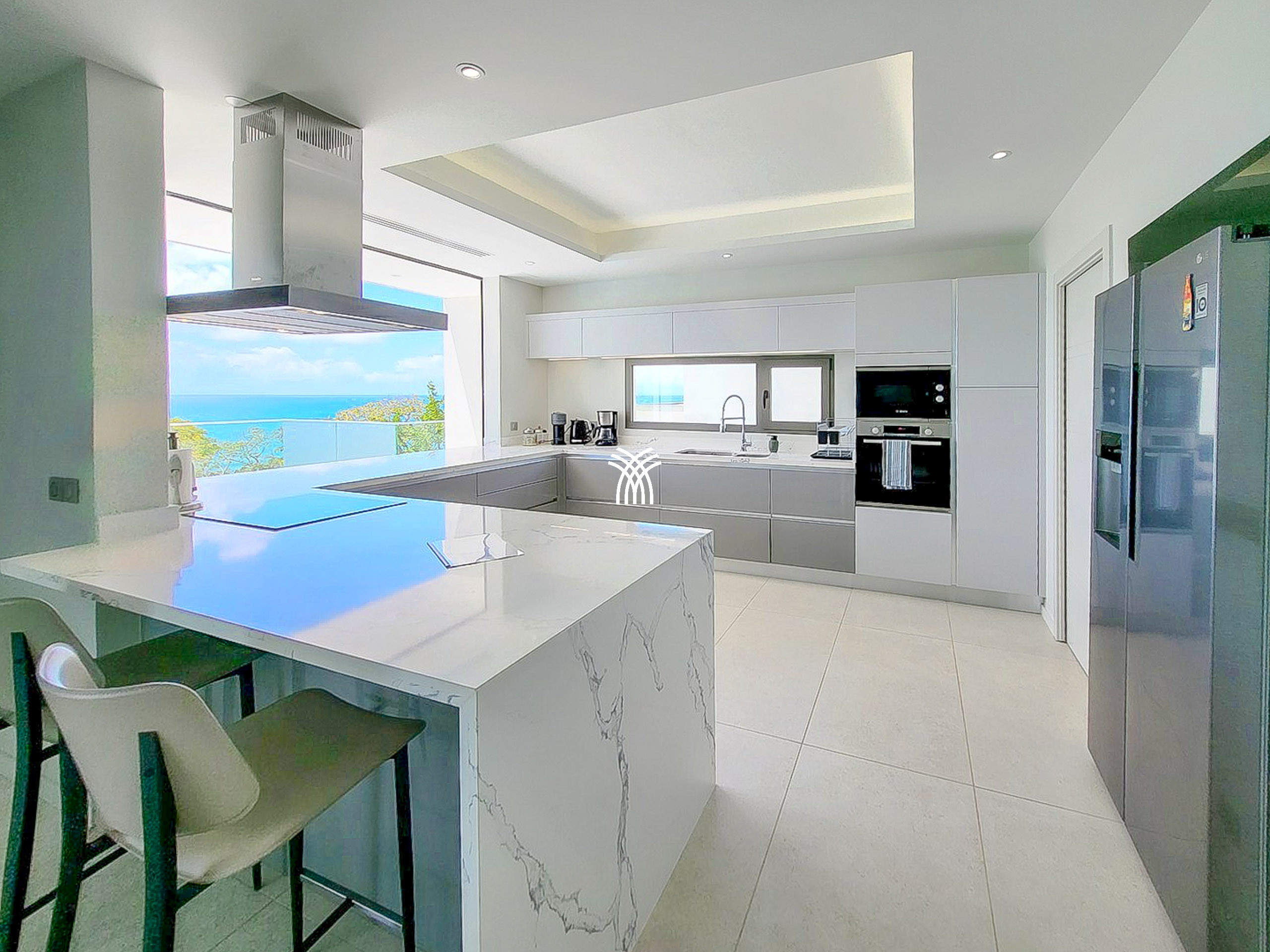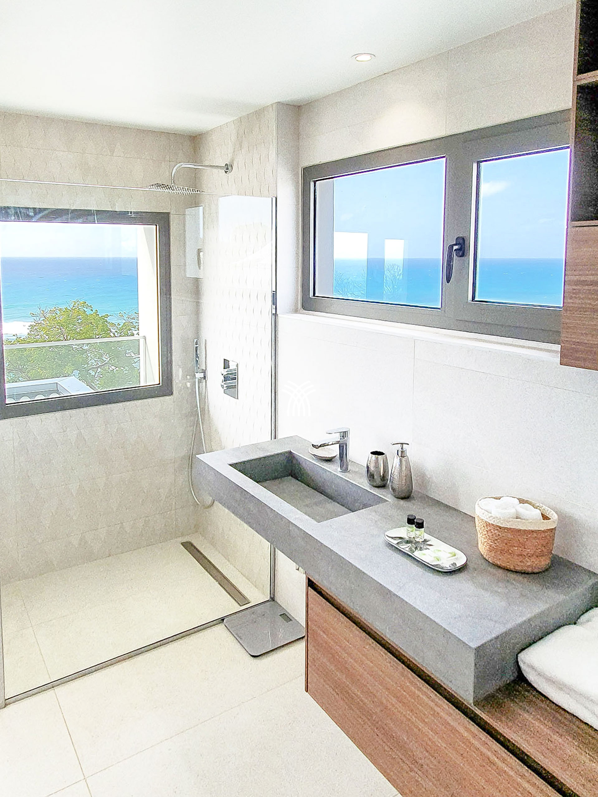 Le rez-de-chaussée dévoile une cuisine entièrement équipée, ouverte sur un salon lumineux et une salle à manger élégante, tous orientés vers l’horizon marin. La terrasse spacieuse est idéale pour partager des moments conviviaux autour d’un repas ou d’un apéritif, tandis que la piscine à débordement, se fondant visuellement dans l’océan, offre une expérience inoubliable de détente et de luxe.