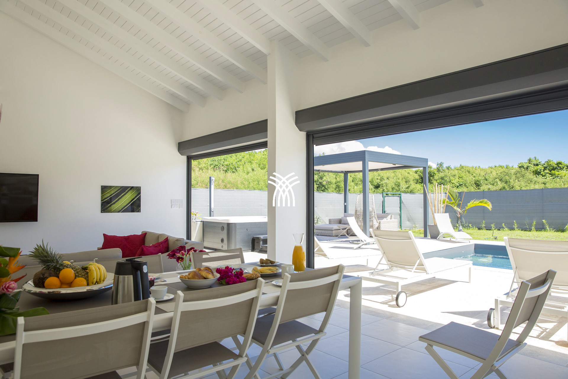L’espace extérieur de la villa Abawak est idéal pour se retrouver en famille ou entre amis. La terrasse couverte permet de partager des repas avec vue sur la piscine au sel et le jardin tropical. Le carbet privé est parfait pour se relaxer autour d'un ti-punch ou de spécialités locales.