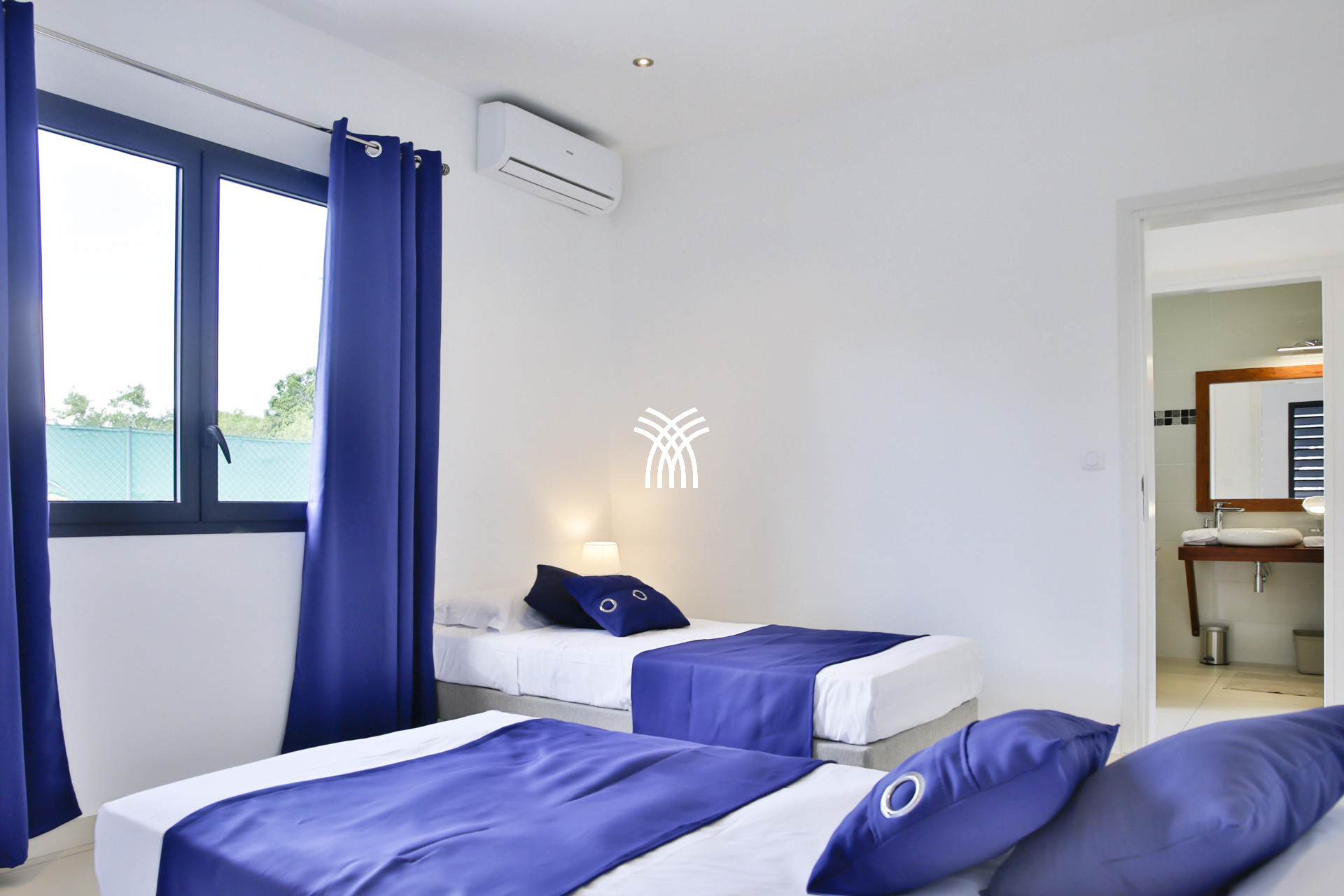 Les deux chambres jumelles, avec lits queen-size, s'ouvrent sur une galerie couverte et partagent une salle d'eau moderne.