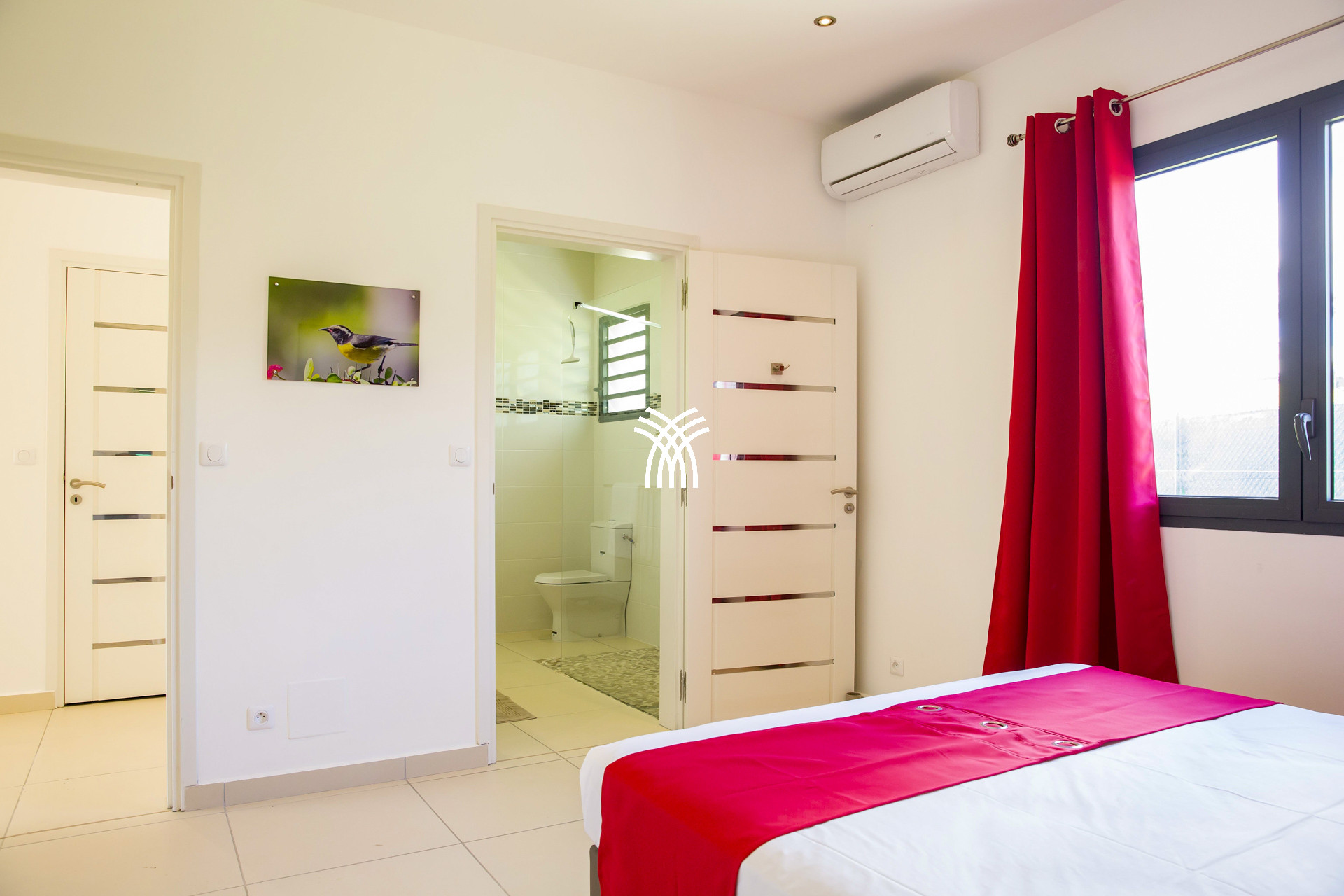 Lit queen size, conditionné, salle de bains avec douche et WC partagée avec chambre 4 , penderie