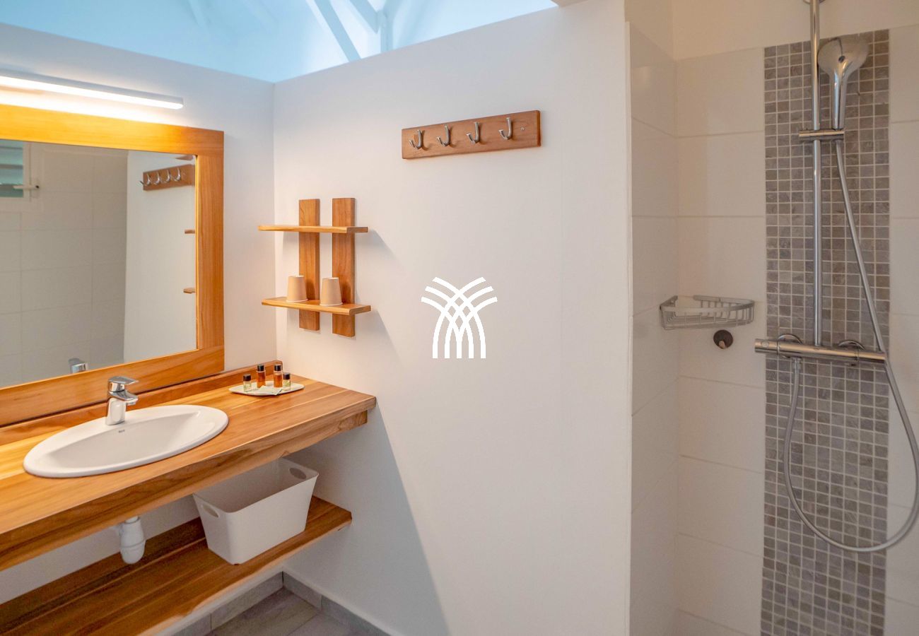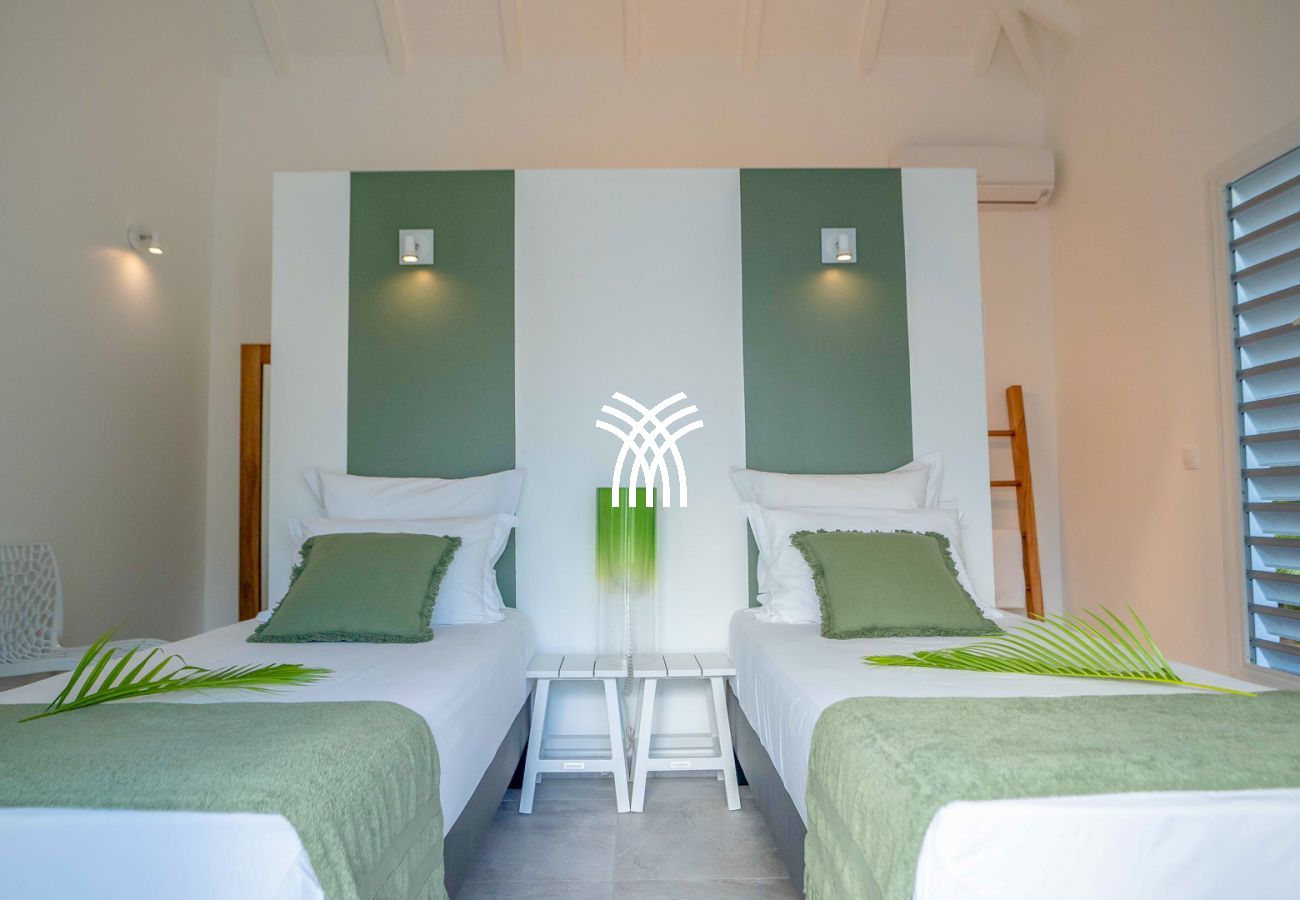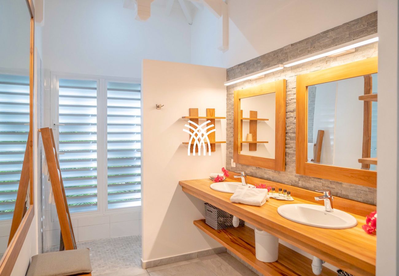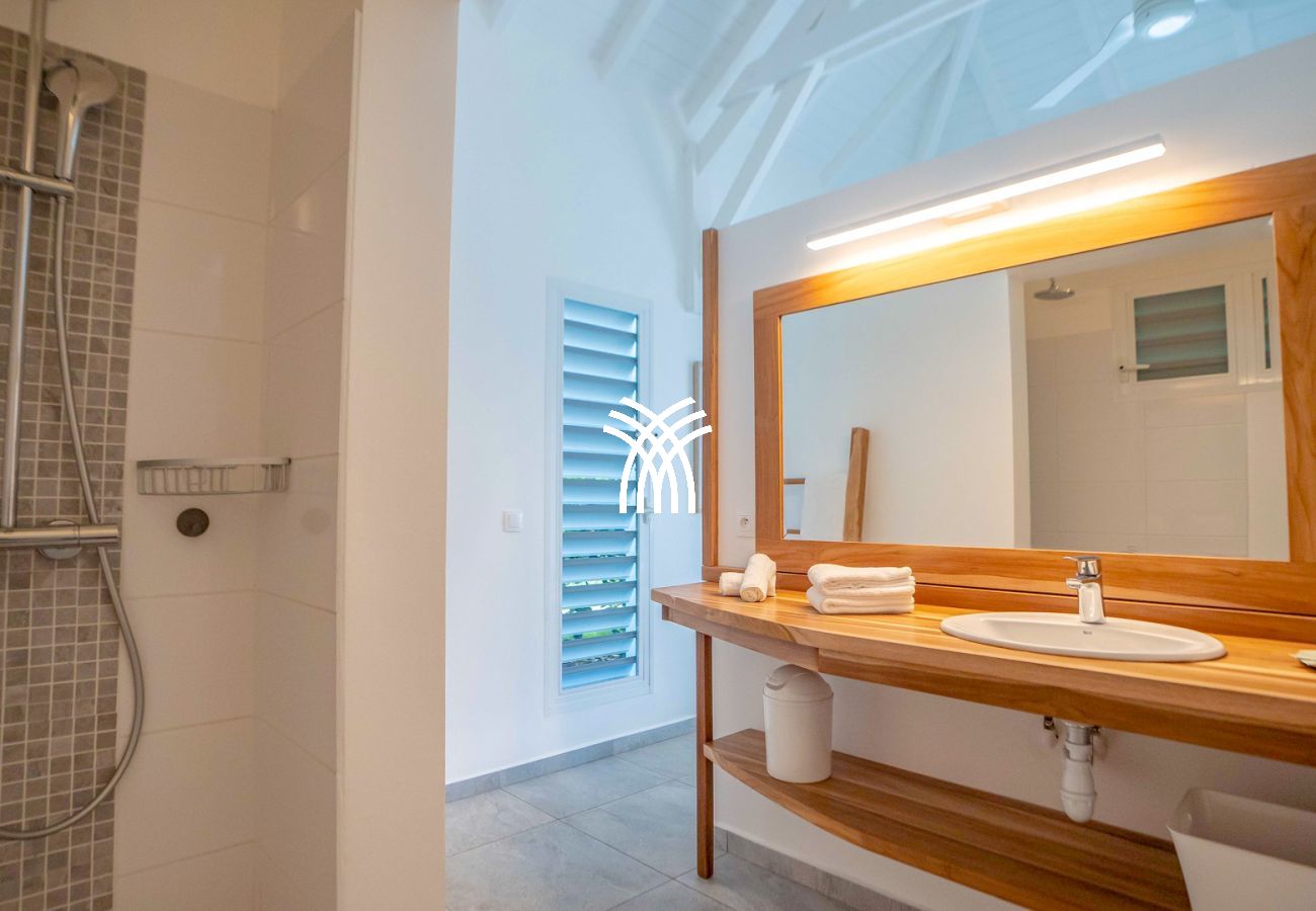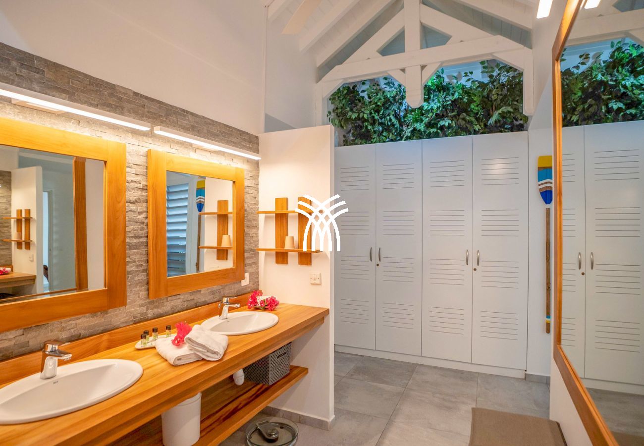 La villa Abawak, de plain-pied, dispose de 4 chambres climatisées décorées avec goût pour offrir confort et sérénité. La suite parentale principale est un véritable cocon avec lit king-size, dressing et salle d'eau privée. Une seconde suite parentale offre une expérience unique avec une douche en plein air sous le ciel étoilé de la Guadeloupe.