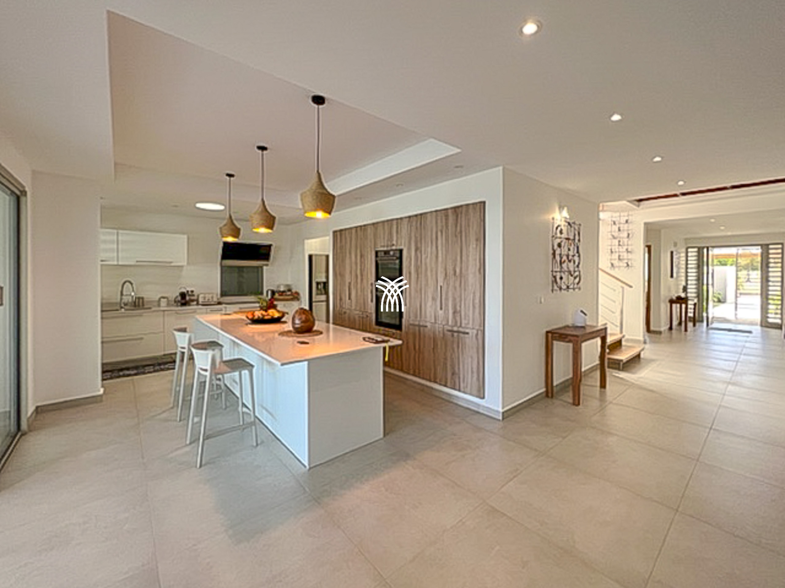 Les matériaux contemporains se marient harmonieusement aux lignes emblématiques de sa charpente octogonale, qui forme le cœur architectural de la villa. Dès l’entrée, un coin bureau mène à un salon TV, ouvert sur un salon intérieur lumineux et une salle à manger raffinée. La cuisine ouverte, entièrement équipée, séduira les passionnés de gastronomie et les amateurs de vins grâce à sa cave intégrée.