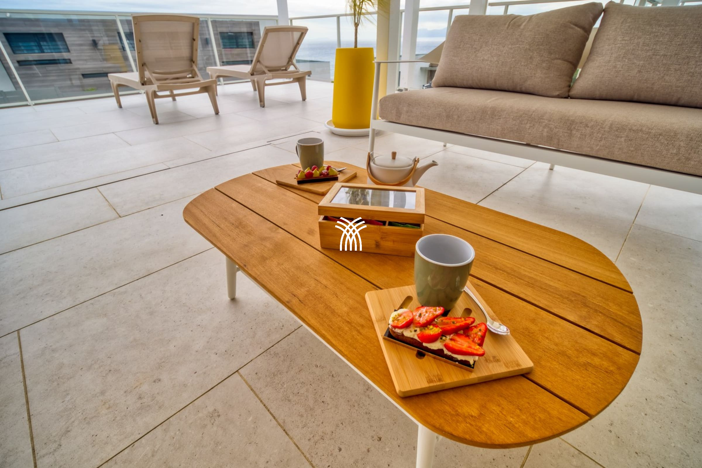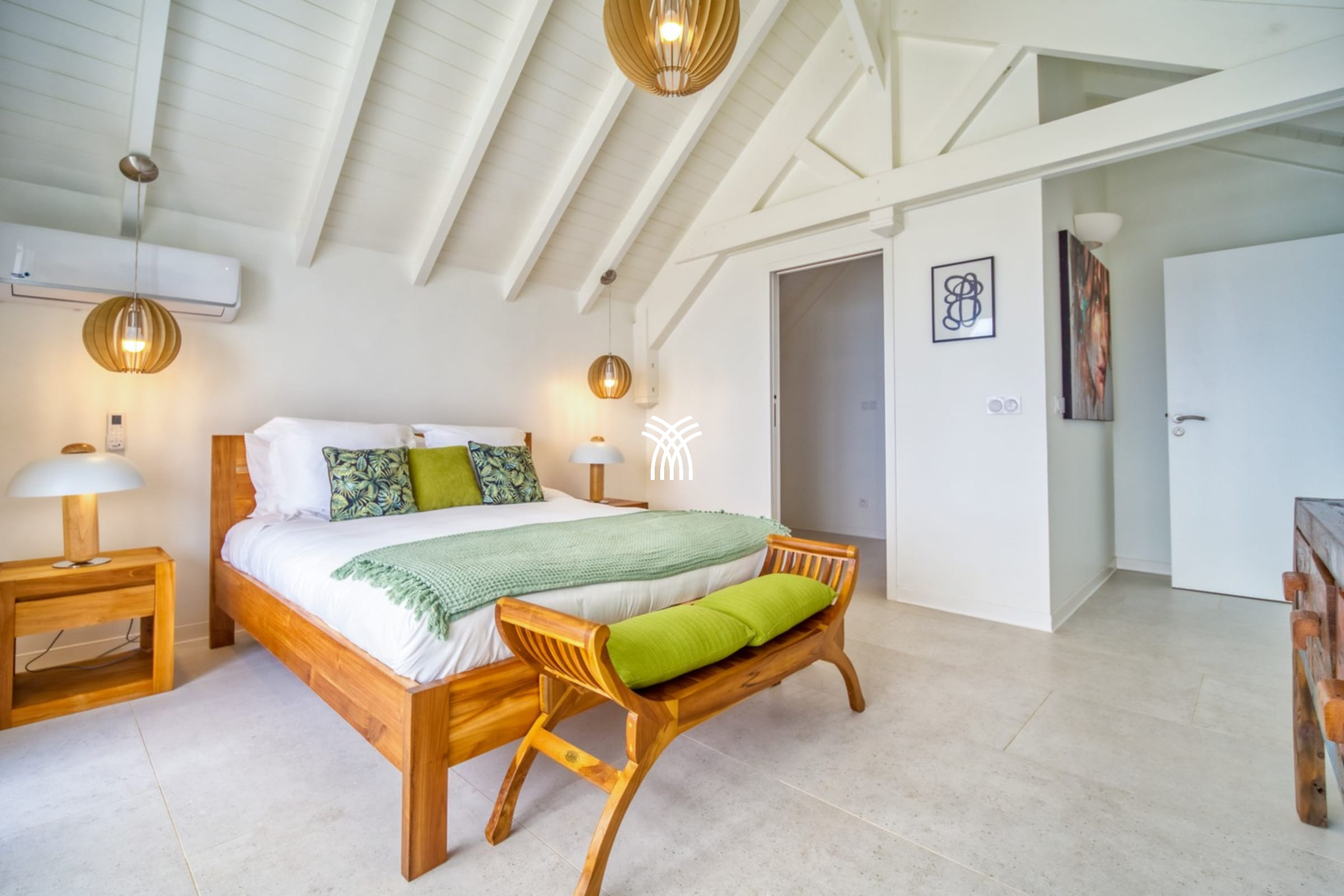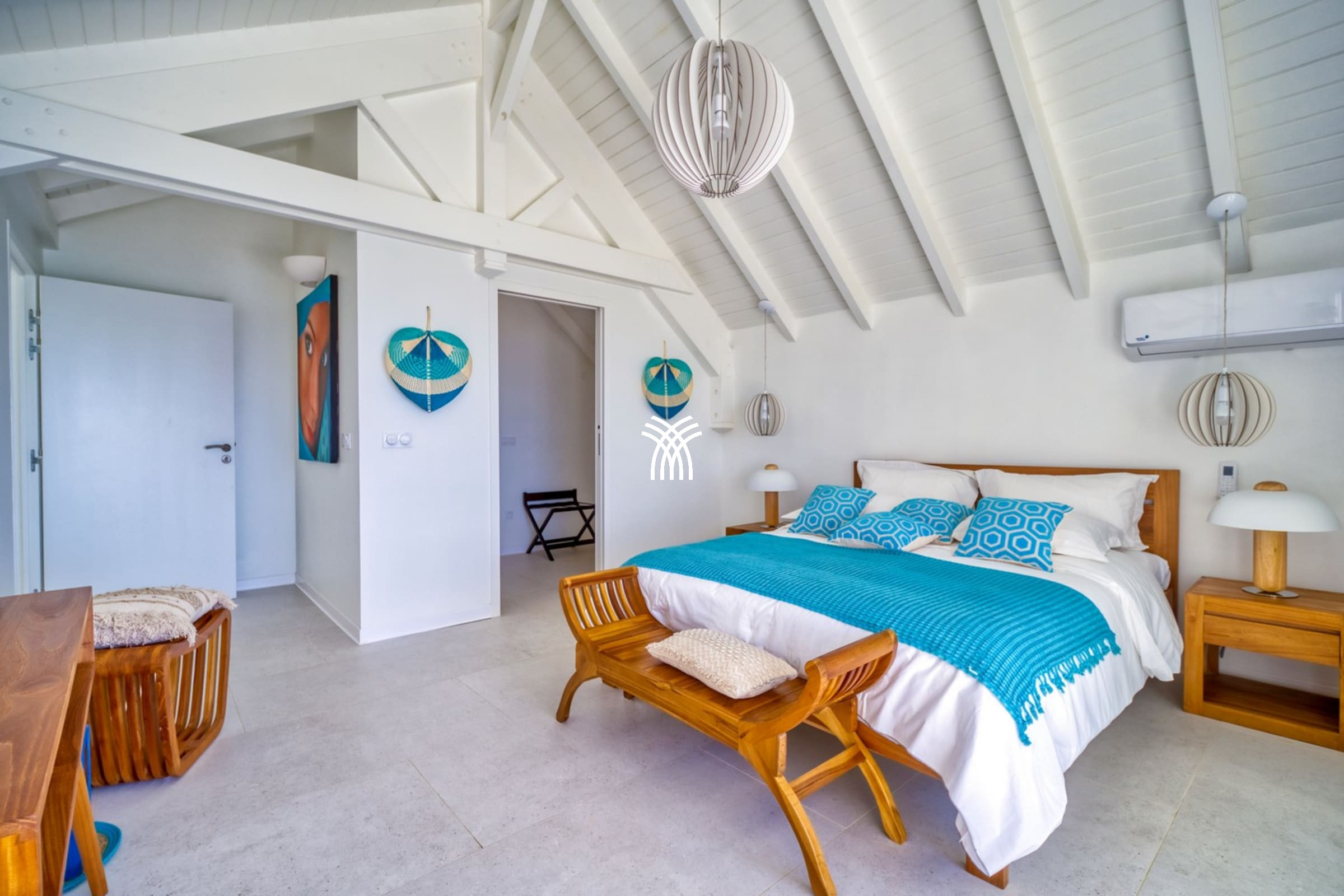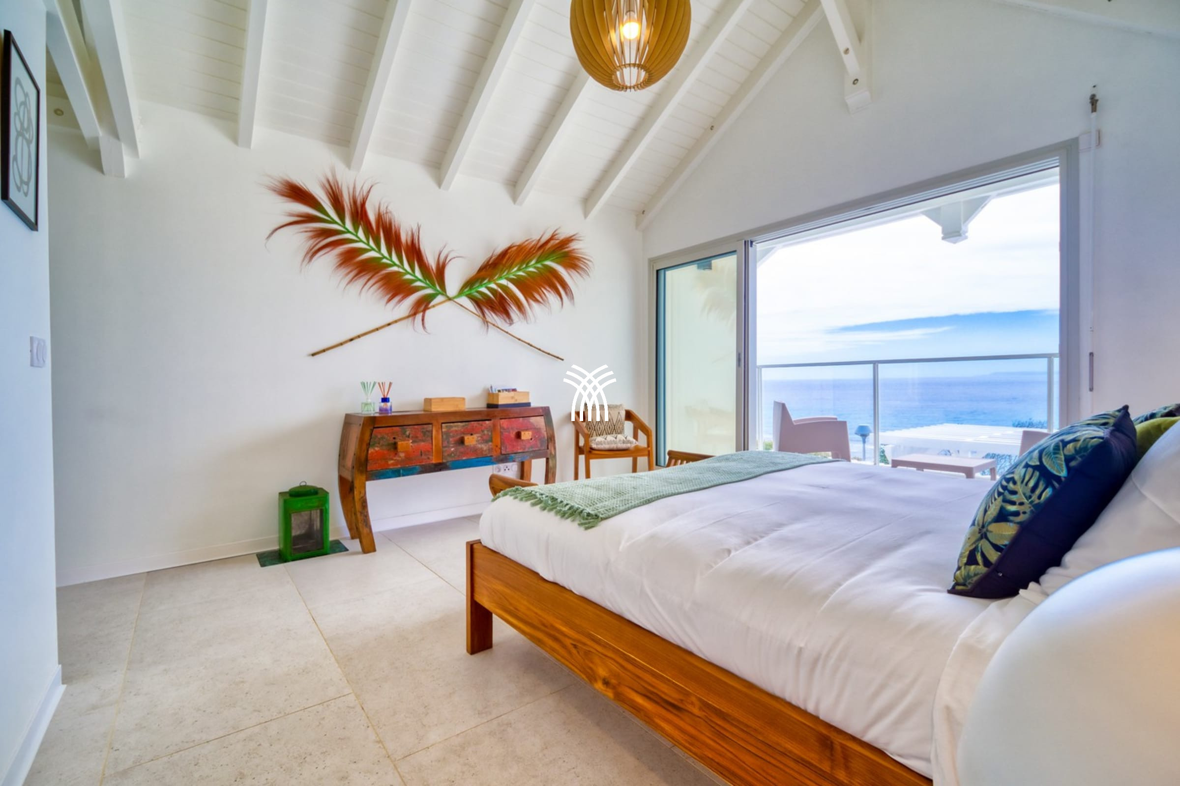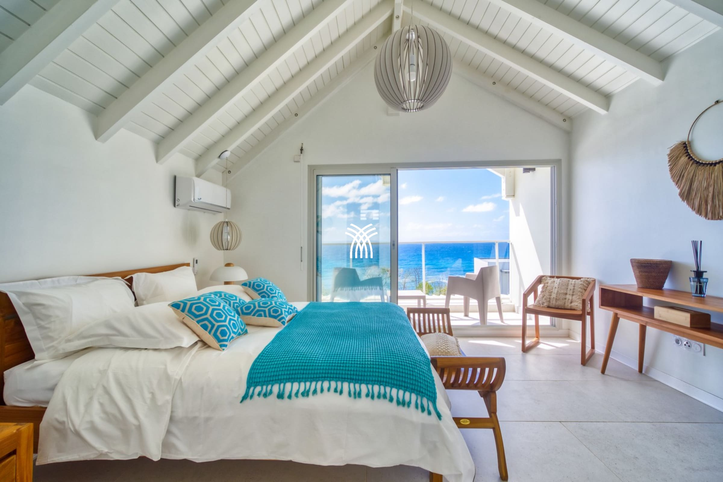 À l’étage, la villa révèle un espace dédié au repos et à la convivialité, aménagé avec de confortables canapés, une télévision câblée, des jeux de société et une sélection de livres consacrés à la Guadeloupe. Deux nouvelles suites parentales, situées de part et d’autre, disposent chacune d’un balcon privatif avec salon extérieur, offrant une vue mer encore plus saisissante depuis cette hauteur. L’ensemble de la maison a été pensé pour préserver l’intimité de chacun tout en favorisant les moments de partage.