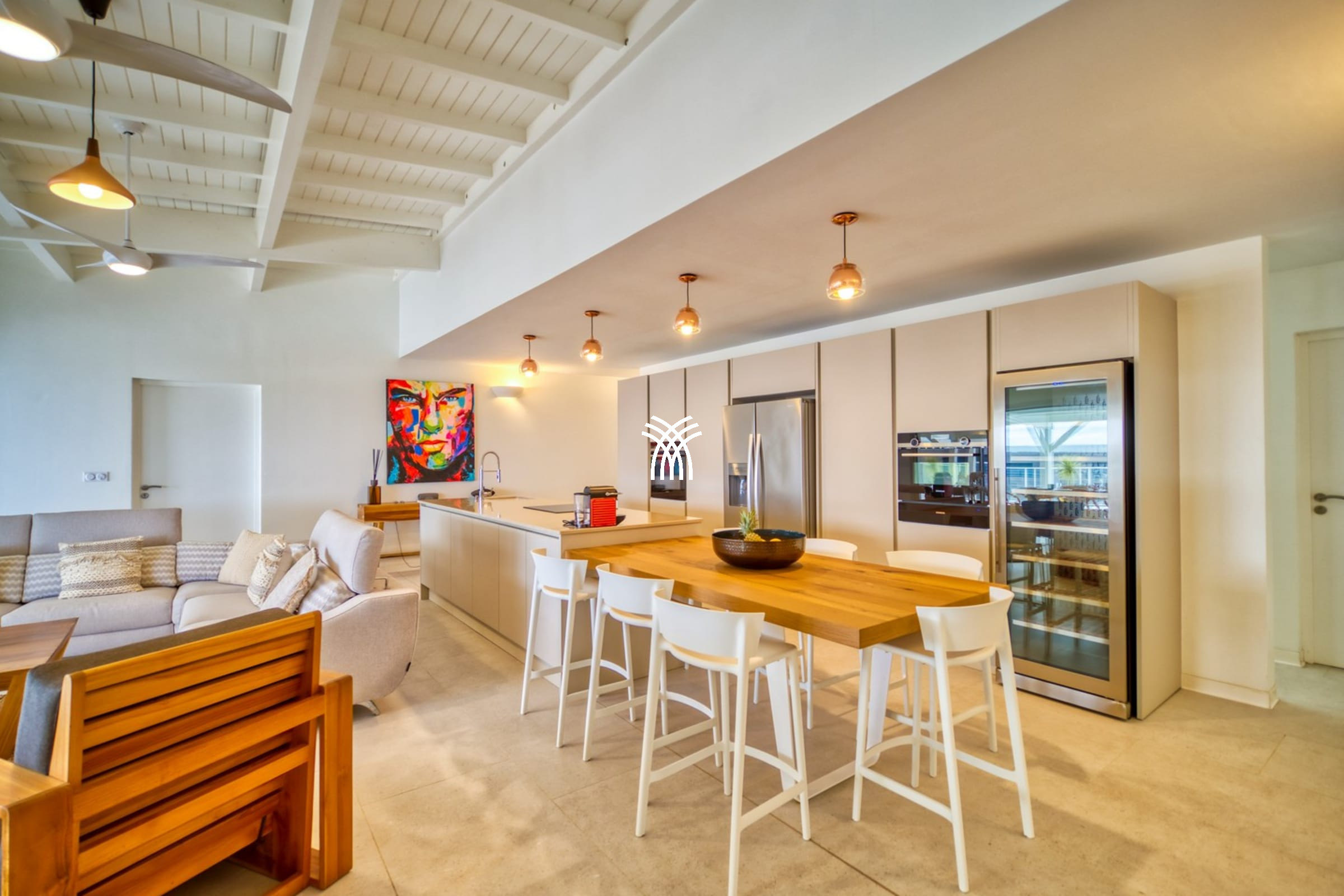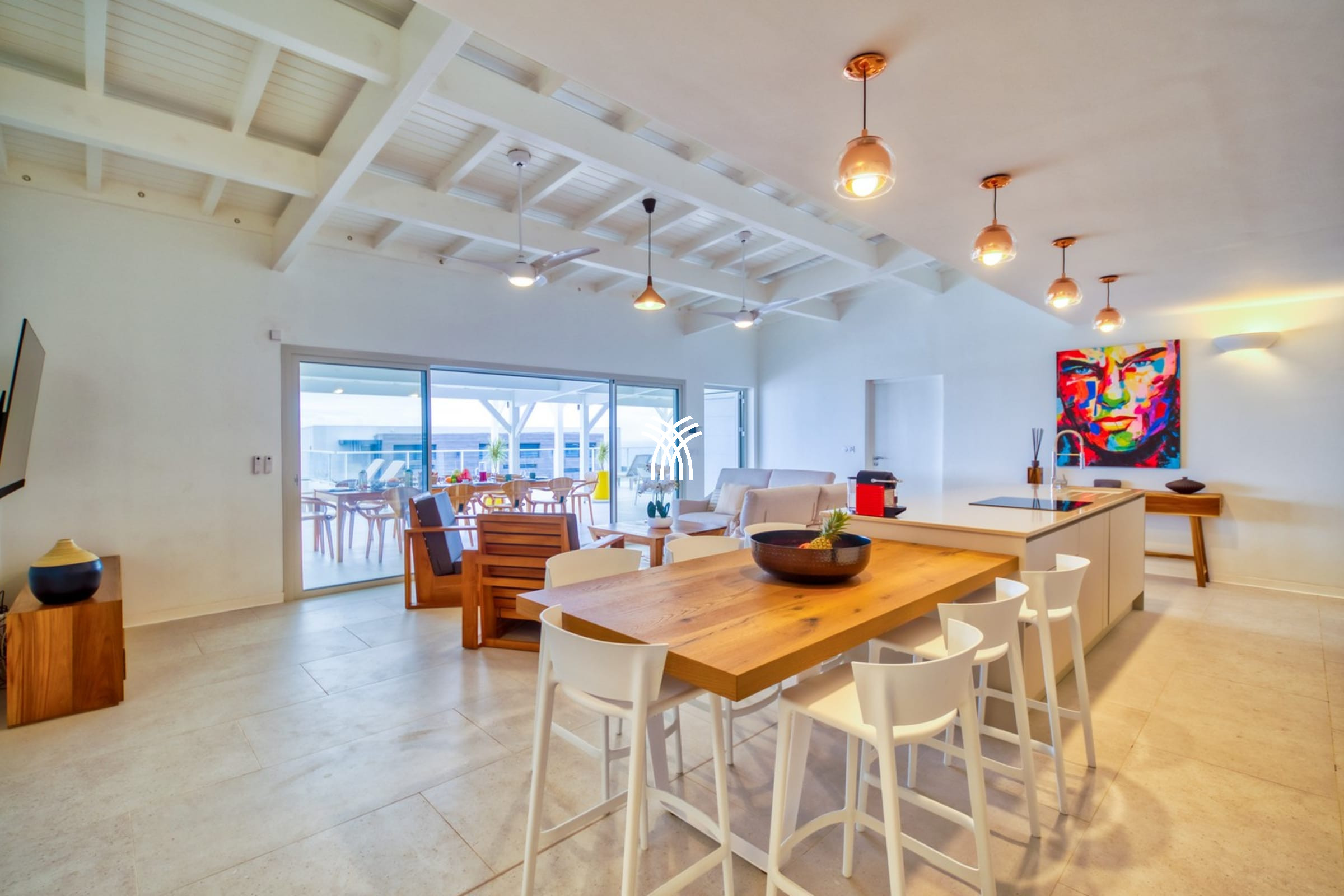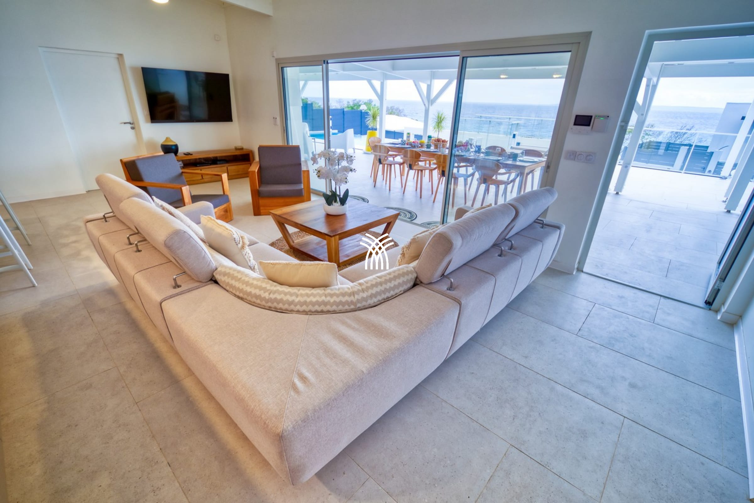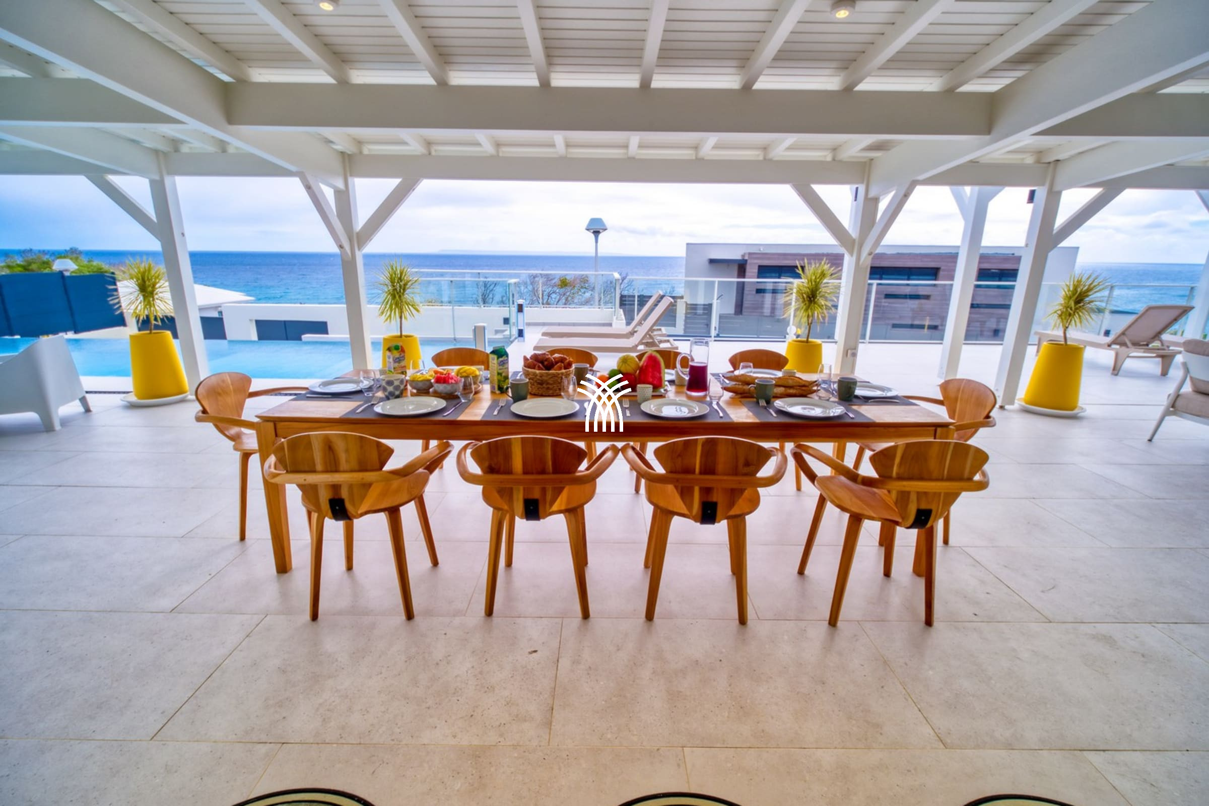 Le cœur de la villa s’organise autour d’un vaste espace de vie ouvert, convivial et baigné de lumière. La cuisine sur mesure, entièrement équipée avec électroménager haut de gamme, cave à vin, réfrigérateur américain, cafetière Nespresso, doubles fours et lave-vaisselle, invite aussi bien à la préparation de repas en famille qu’à l’organisation d’un cours de cuisine créole privé. Elle s’ouvre naturellement sur le salon et la terrasse, où une grande table permet d’accueillir confortablement jusqu’à dix convives face à la mer et à l’horizon guadeloupéen.