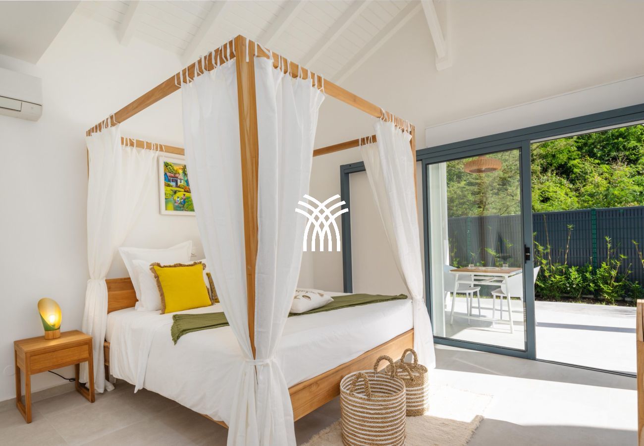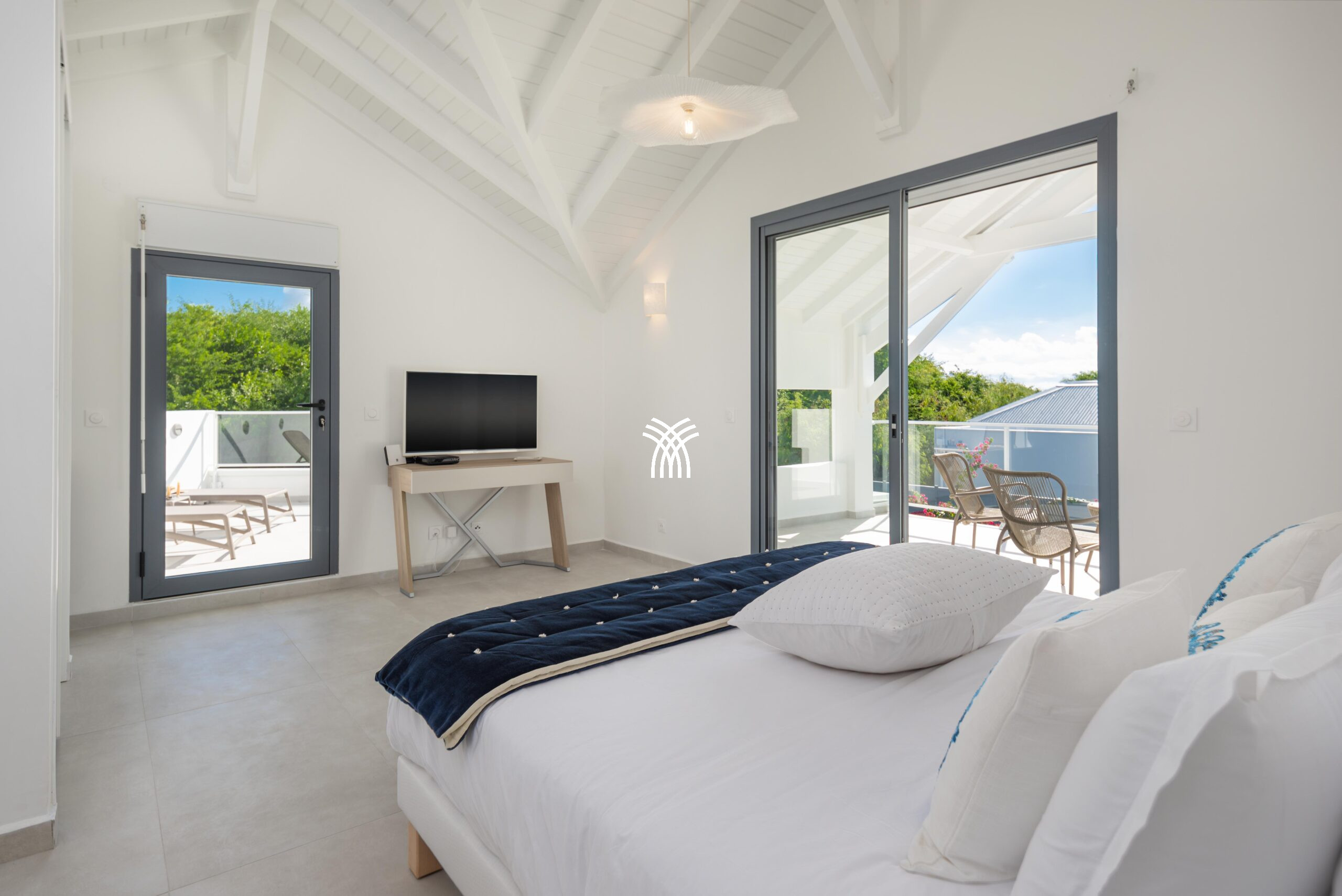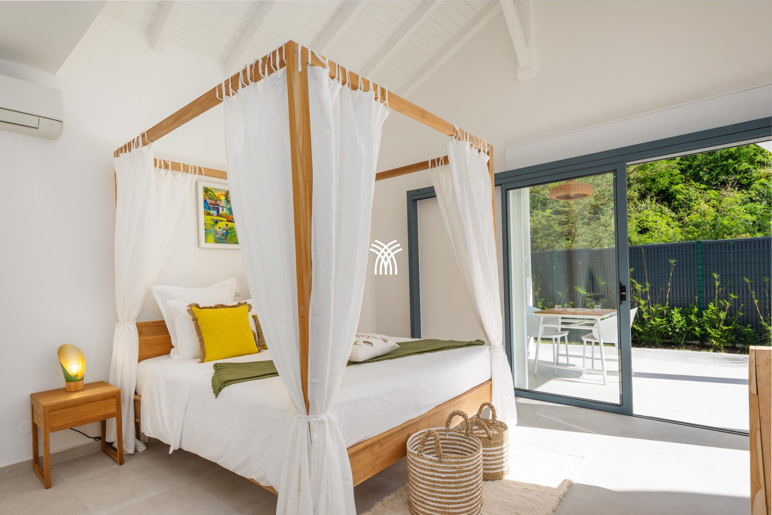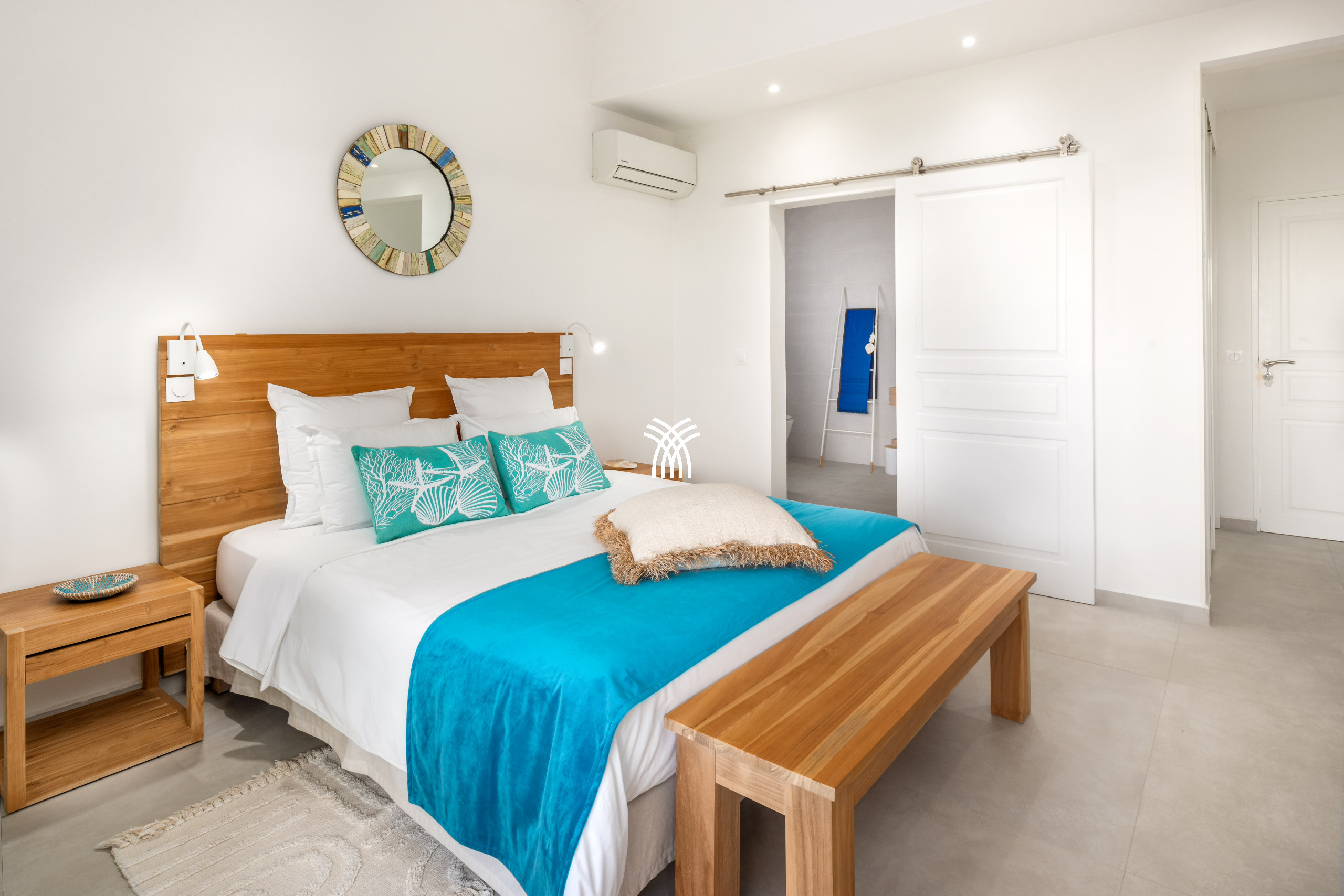 Les vastes espaces de la villa ont été conçus pour offrir un confort absolu et préserver l’intimité de chaque invité. Composée de trois suites luxueuses avec lits King Size, la villa garantit un hébergement de qualité. La suite parentale, située à l’étage, offre une vue imprenable sur la piscine de 12 mètres et s’ouvre sur un solarium privé. Dotée d’un réfrigérateur et d’une cafetière, elle permet une totale autonomie et promet des réveils paisibles avec une vue apaisante sur l’île de Marie-Galante.